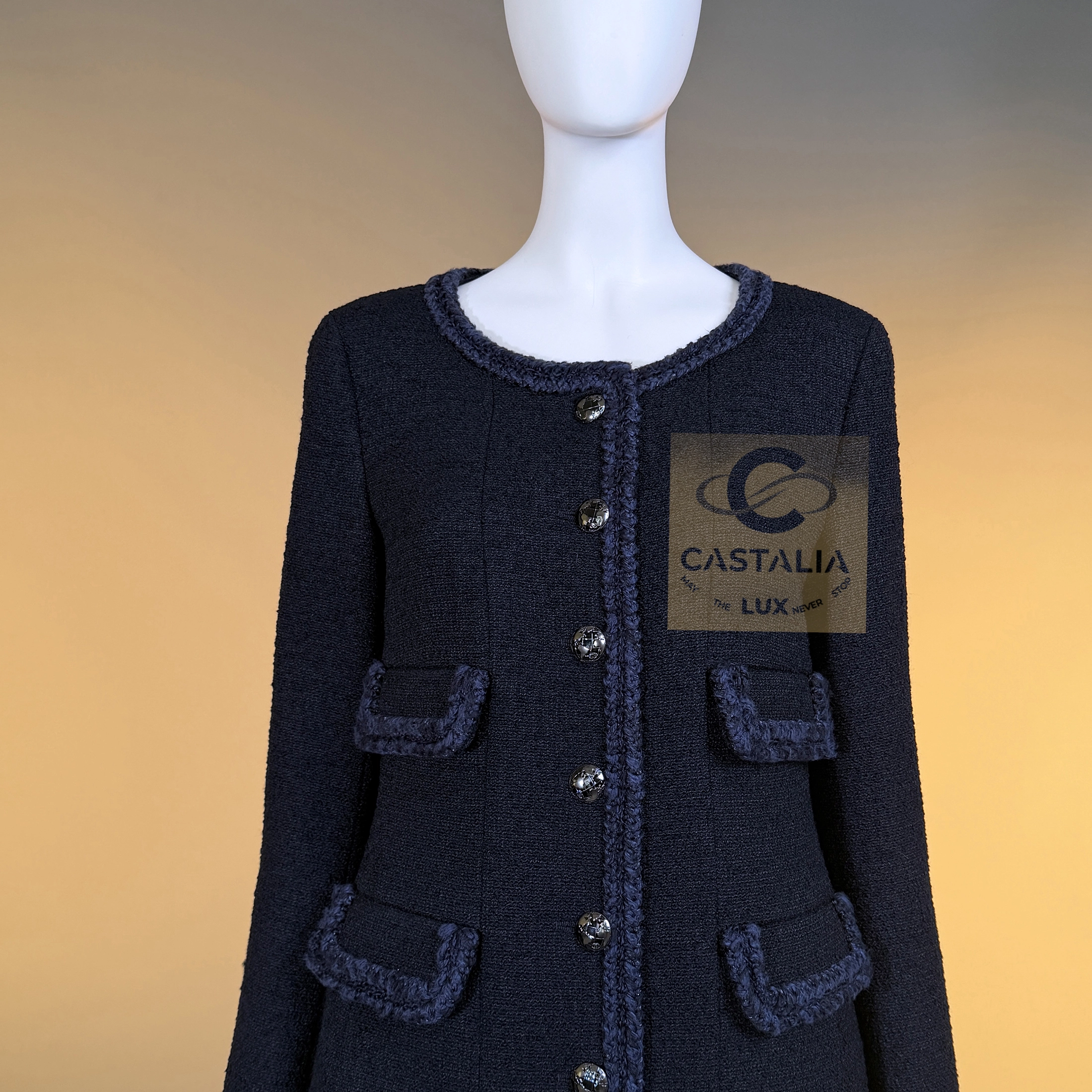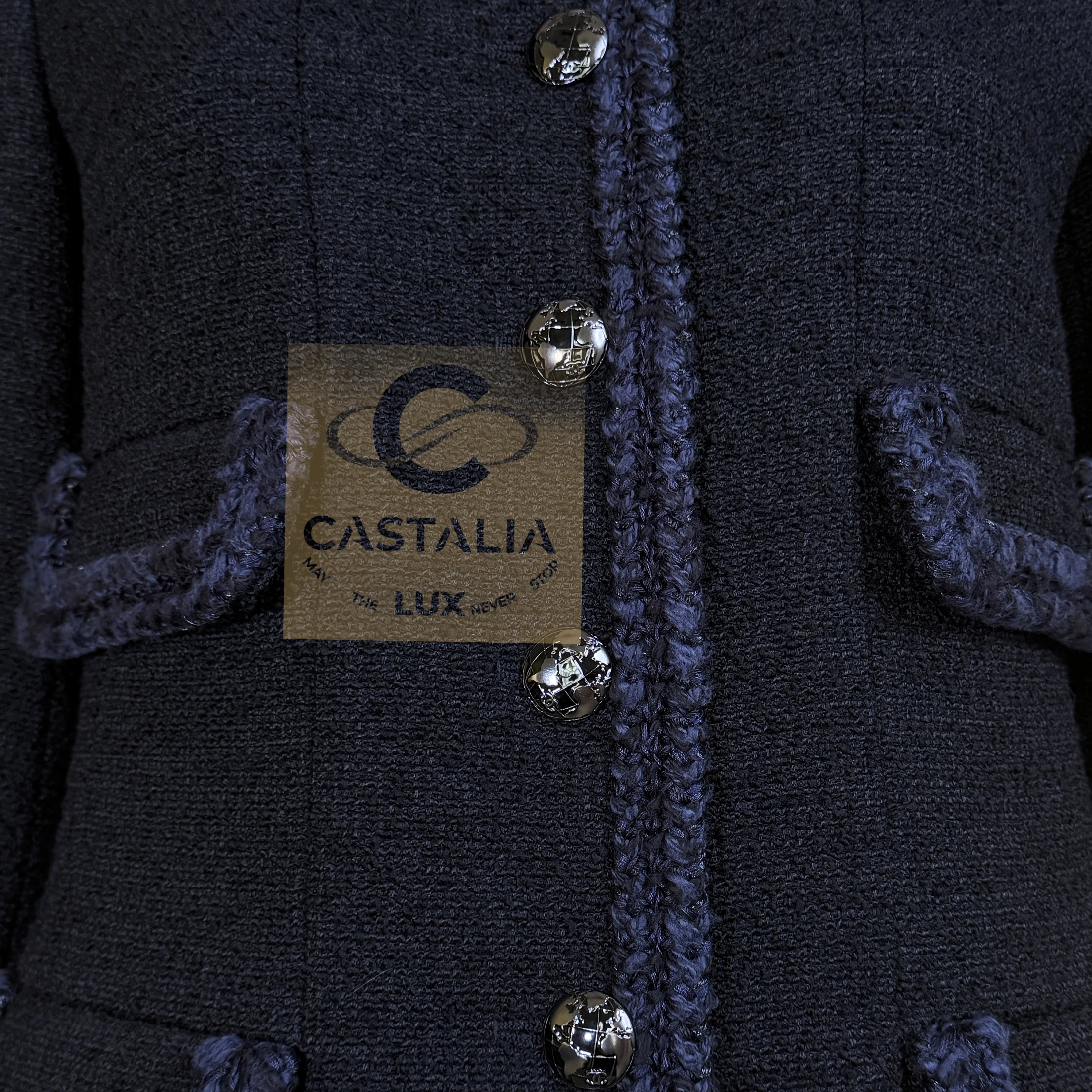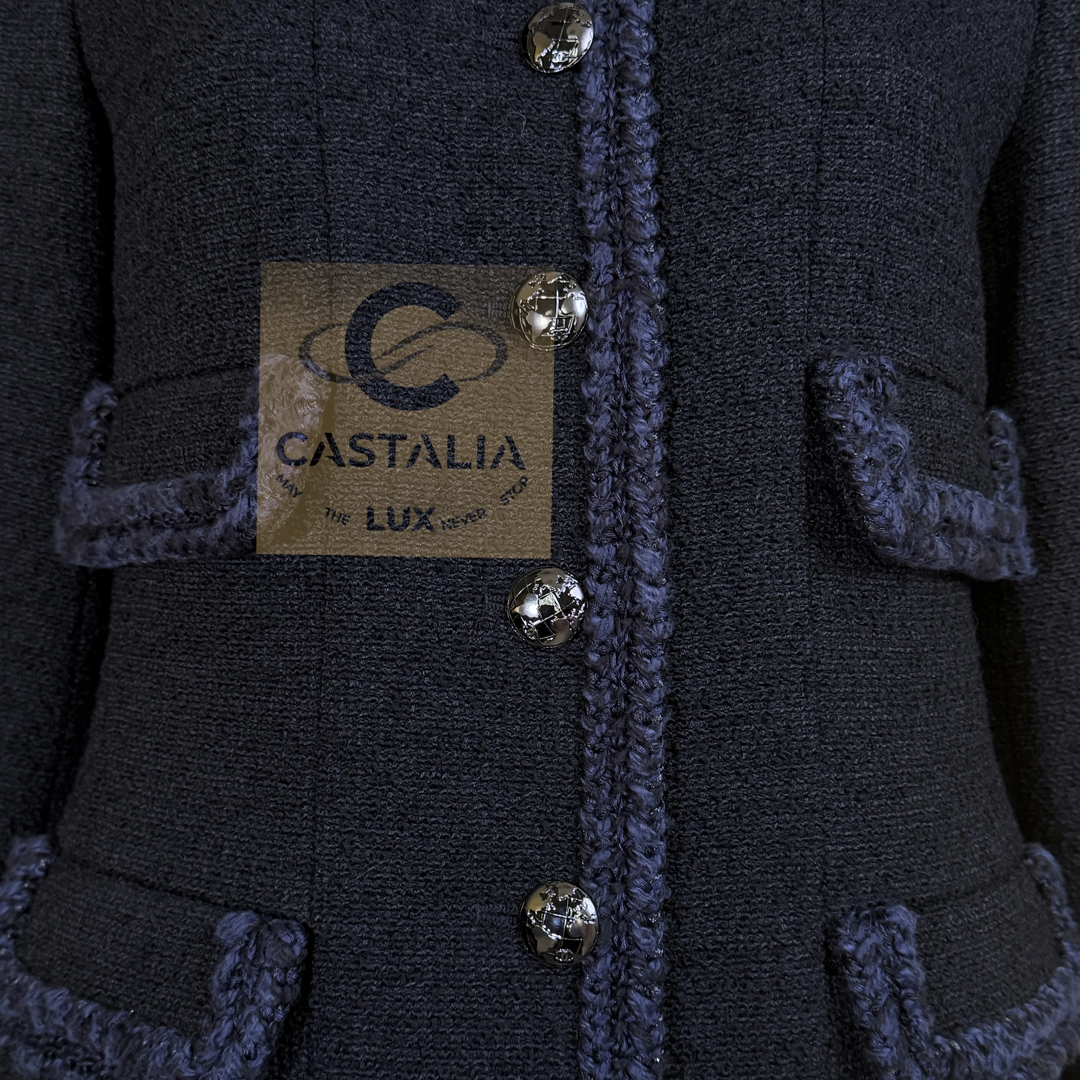 — Hand-tailored in black tweed, it reveals the most iconic four-pocket architecture, framed by the maison’s signature braided trim