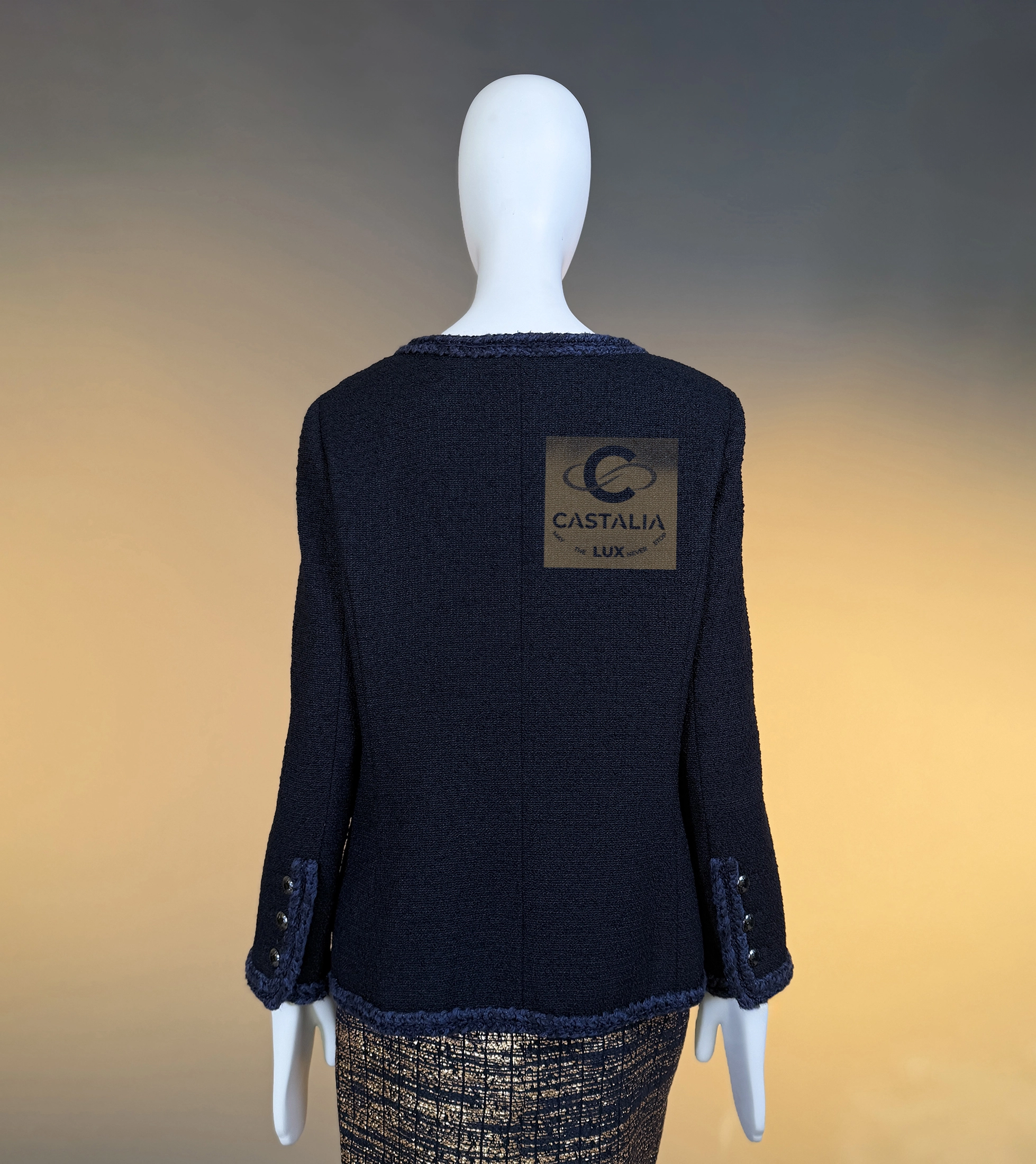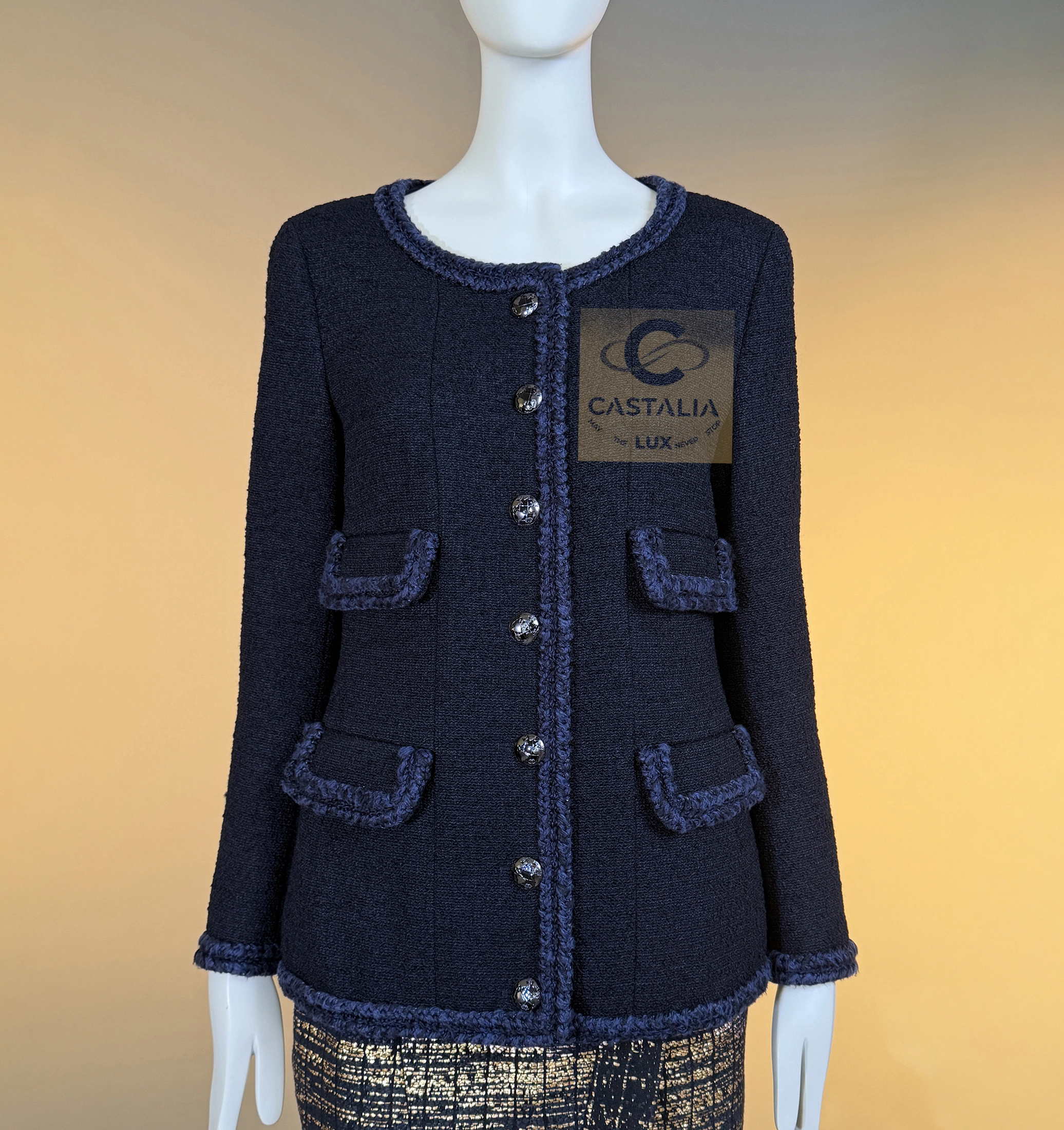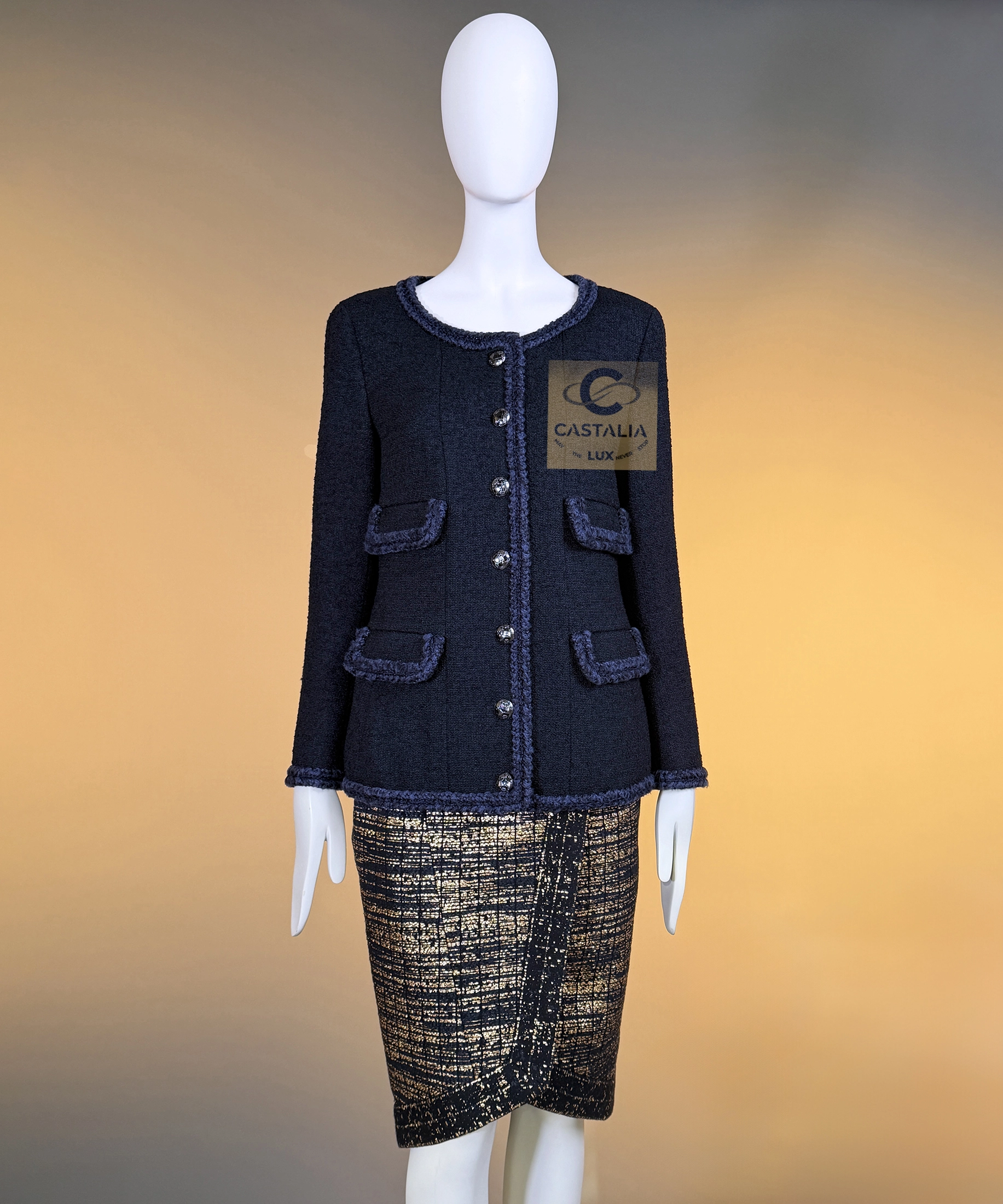 — Hand-tailored in black tweed, it reveals the most iconic four-pocket architecture, framed by the maison’s signature braided trim