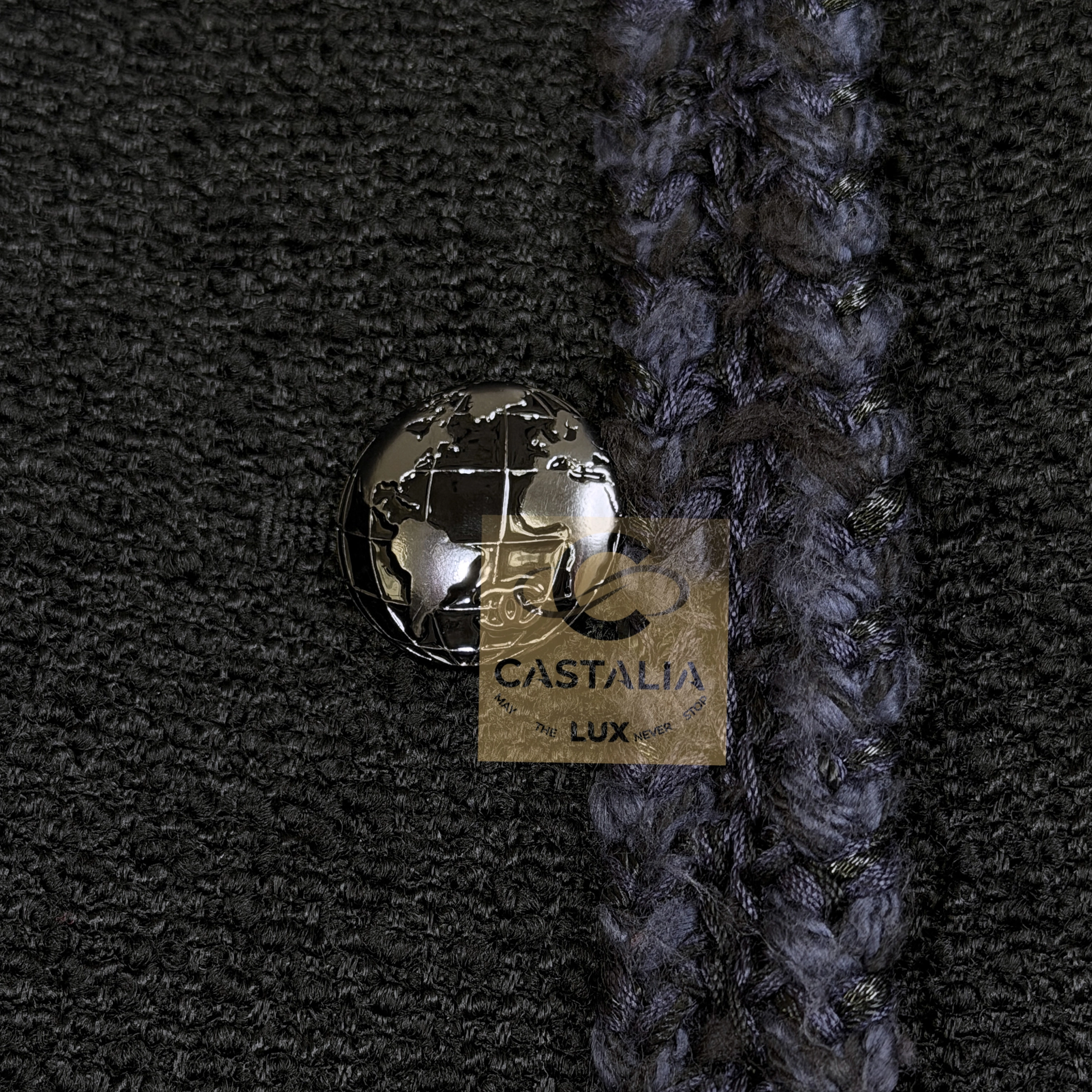 Chanel Iconic Black Tweed Jacket — Fall 2013 “Globalization” Collection by Karl Lagerfeld ~ One of the most emblematic CHANEL creations in the history of the Maison, this jacket stands as a visual manifesto of Chanel’s global resonance ~ Worn by Keira Knightley and immortalized in Advert with Vittoria Ceretti, it has become an image of cultural ubiquity — the Chanel silhouette as planetary symbol // Size mark 40 FR / Condition: never worn // — Hand-tailored in black tweed, it reveals the most iconic four-pocket architecture, framed by the maison’s signature braided trim — CC logo globe buttons, glinting like miniature cartographies, echo the collection’s theme — couture as a universal language — Inside, the jacket carries the house’s secret poetry: a tonal silk lining woven with camellias, and the discreet chain link hem that grants it perfect gravitas — This jacket is not merely a garment but a wearable axis mundi, a point where couture, history, and myth intersect