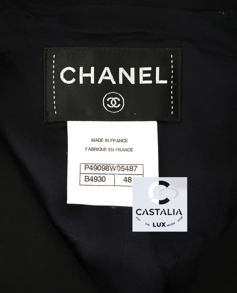 ~ A canvas of wearable art, this navy tweed dress from Chanel’s 2014 Spring ‘Contemporary Art’ Collection by Karl Lagerfeld transcends mere attire, embodying the Maison’s avant-garde spirit ~ A piece of collector’s poise, boutique valued at $7,860, this dress is not merely worn – it is exhibited, living as a testament to Lagerfeld’s vision where fashion converges with conceptual art ~ As seen on Cara Delevingne on the Runway, it carries the fearless allure of modern muses who turn streets into galleries // Size mark 48 FR / Condition: Kept without using // — sleeveless silhouette is sculpted in textured navy tweed woven like brushstrokes of indigo and ivory, framed with a refined contrast collar — signature CC logo zippers adorn the chest pockets and center front, glinting like subtle declarations of Chanel’s eternal codes amidst the artistic geometry — finished with tonal silk lining for impeccable tactile and drape experience