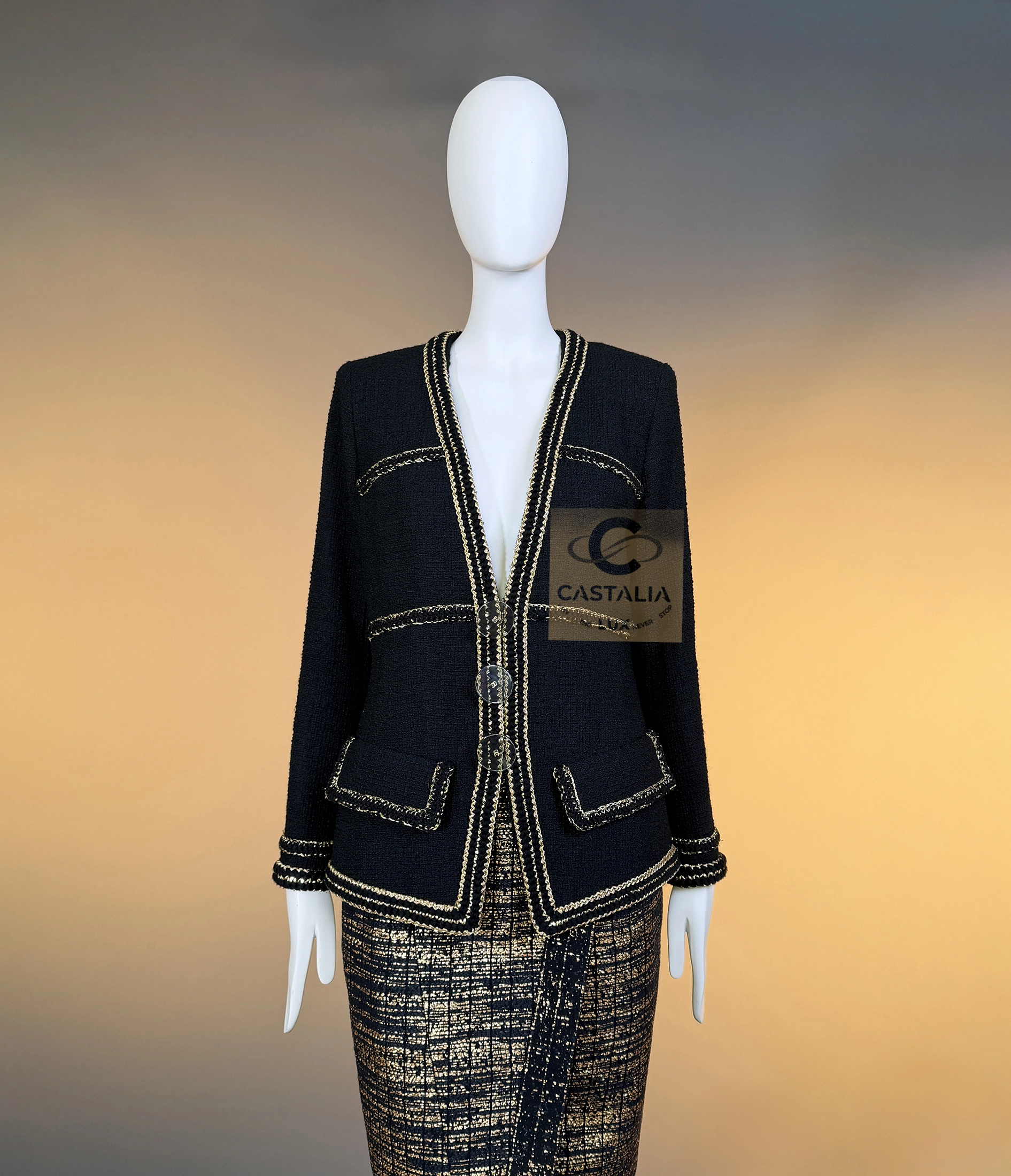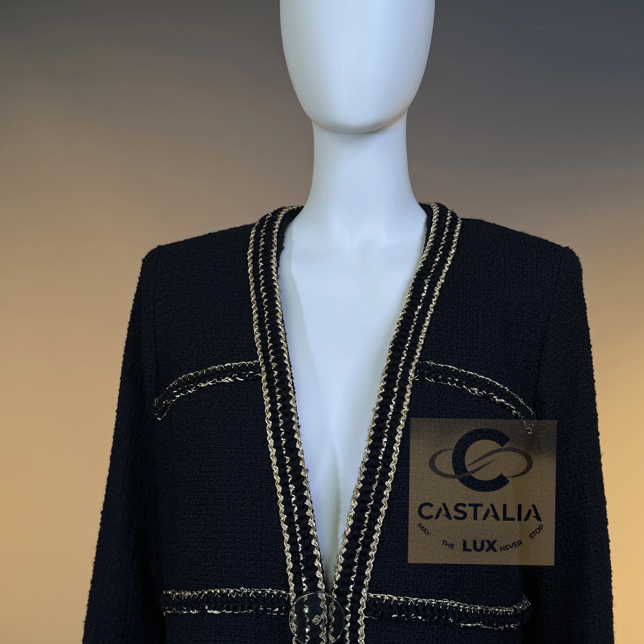 — The jacket is framed by the Maison’s iconic braided metallic trim, a shimmering constellation that outlines the garment like a celestial map — a dialogue between discipline and luminosity