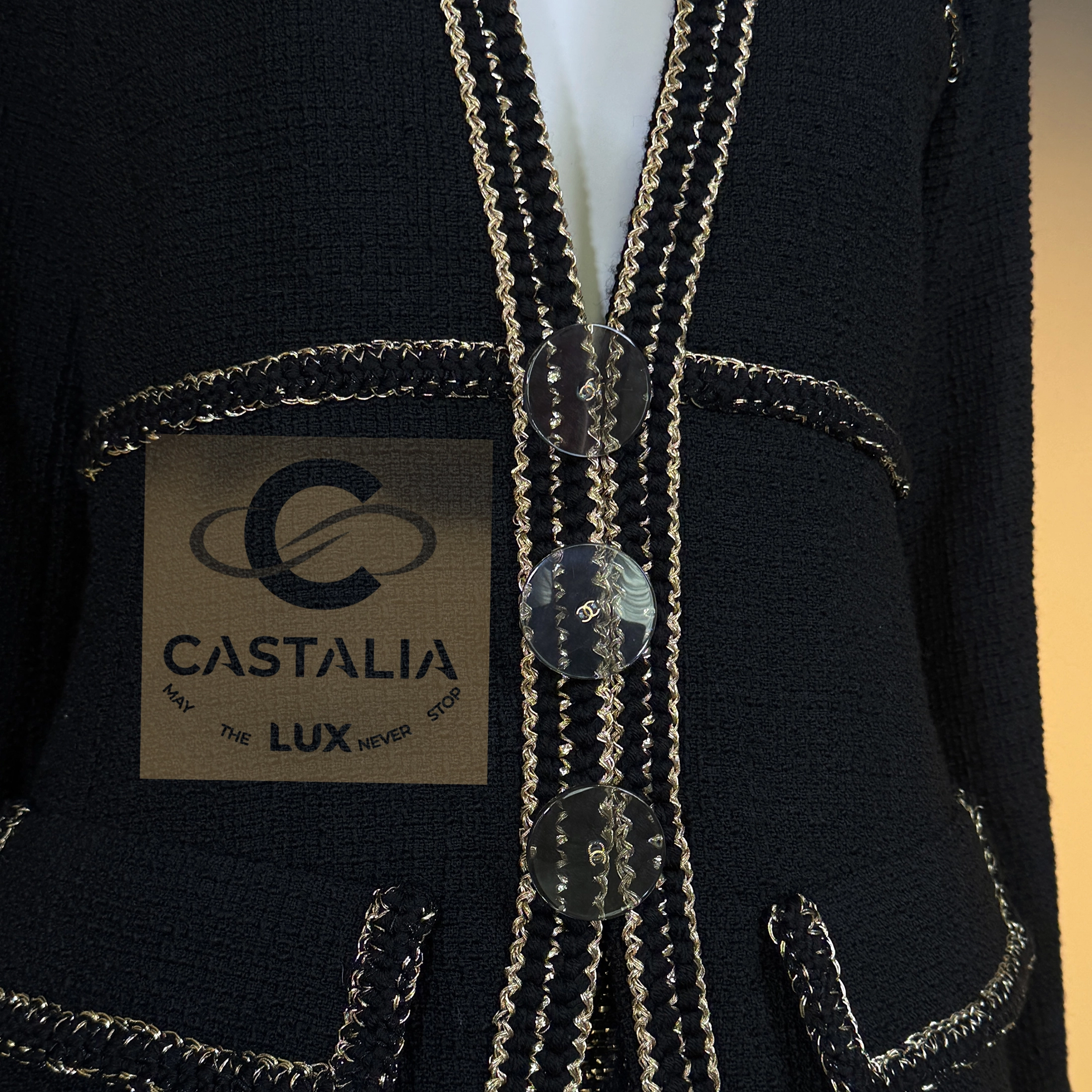 — At the center, CC logo jewel buttons glint with quiet intelligence, anchors of heritage amid the radiance of couture invention