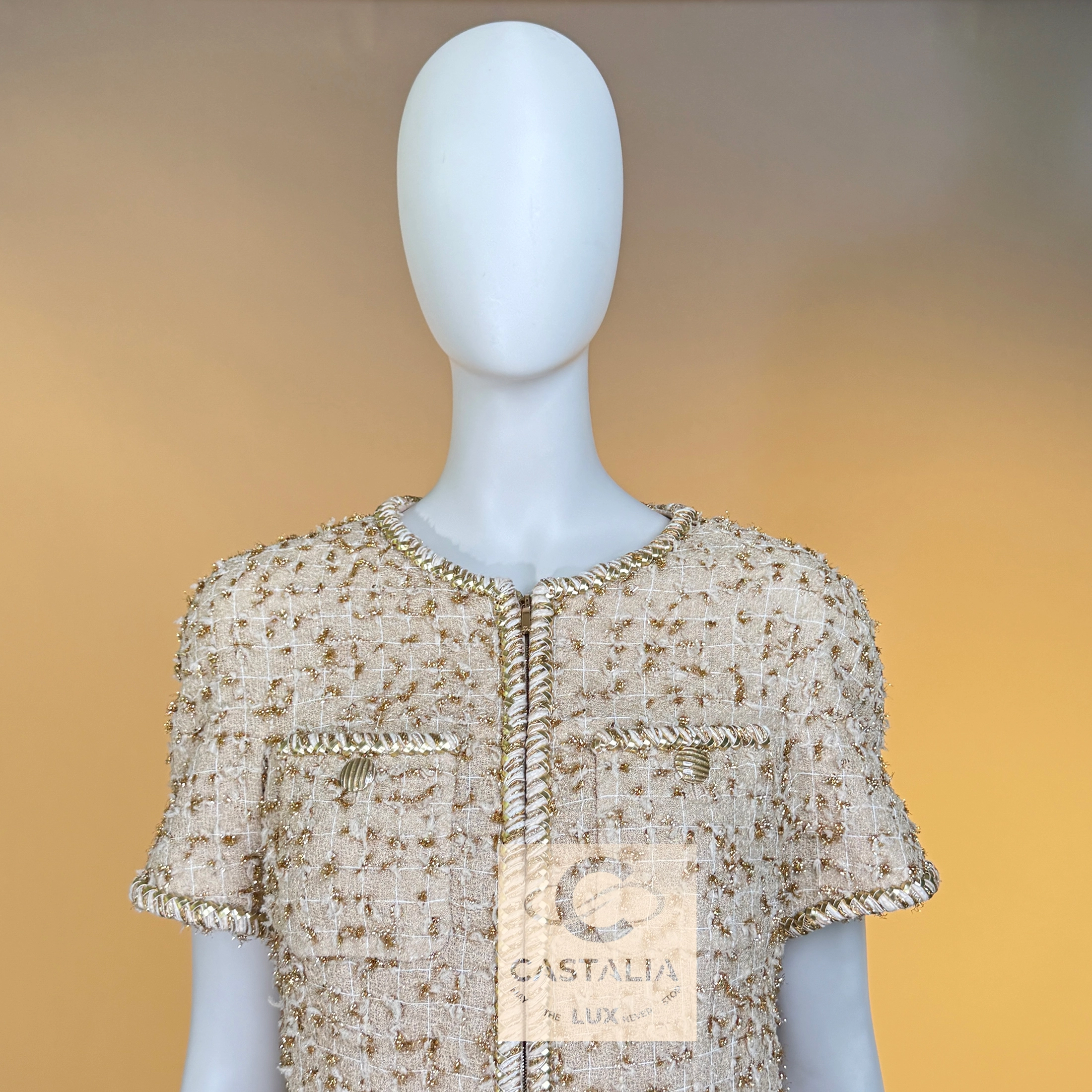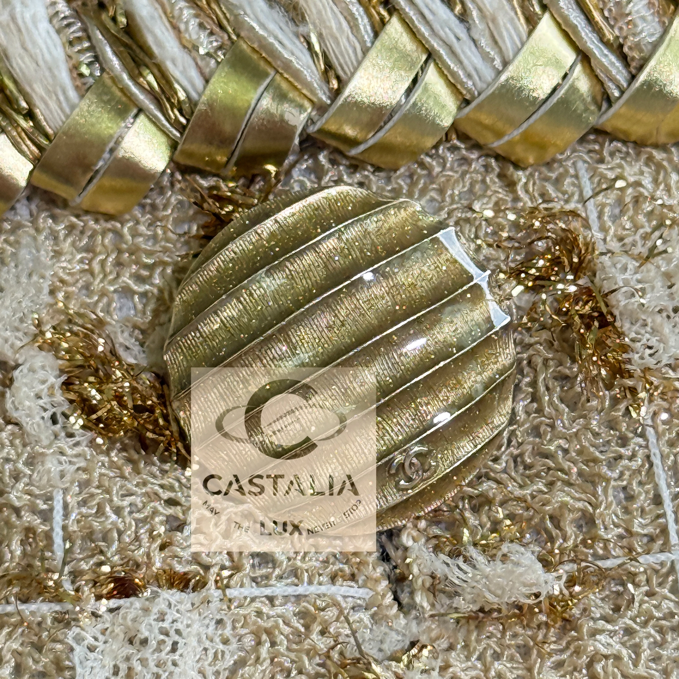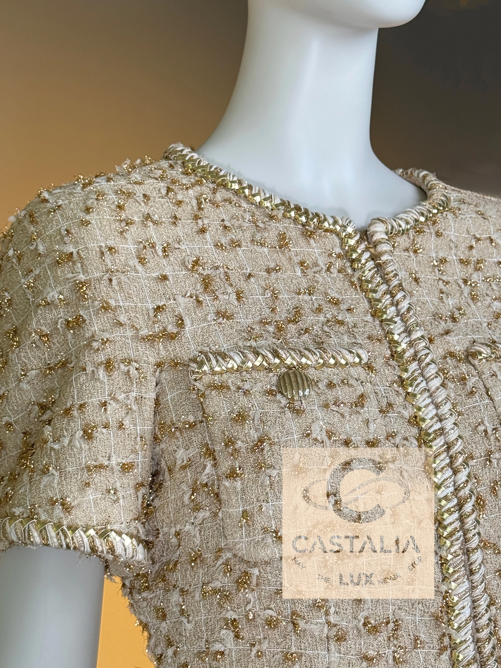 — Woven from precious nude-beige Lesage tweed interlaced with shimmering golden threads, its surface recalls sunlight glistening on coastal sands