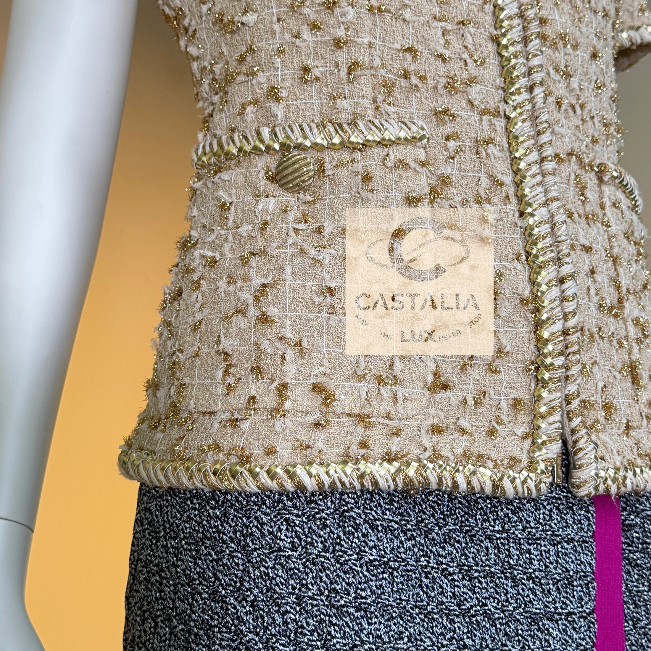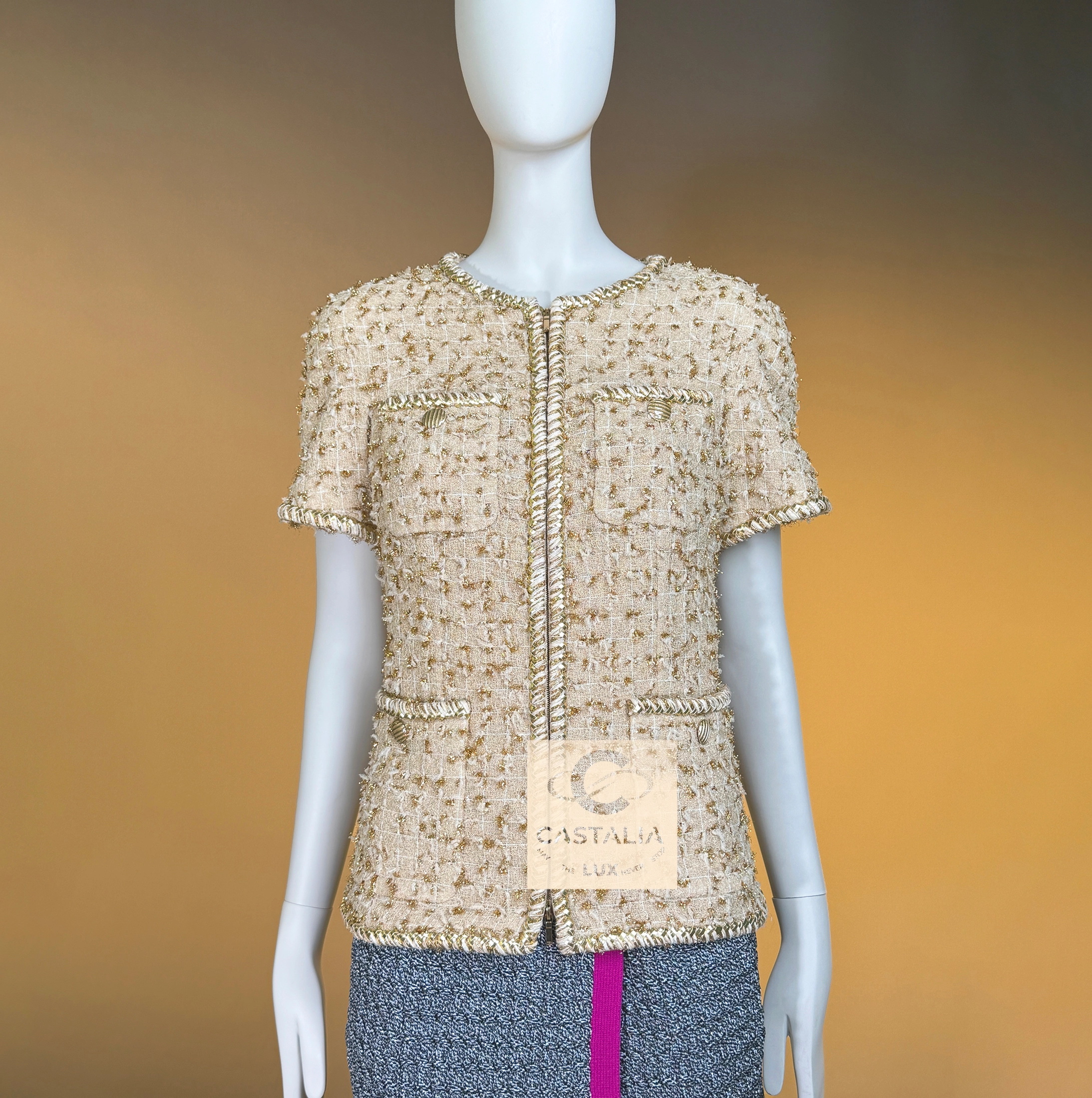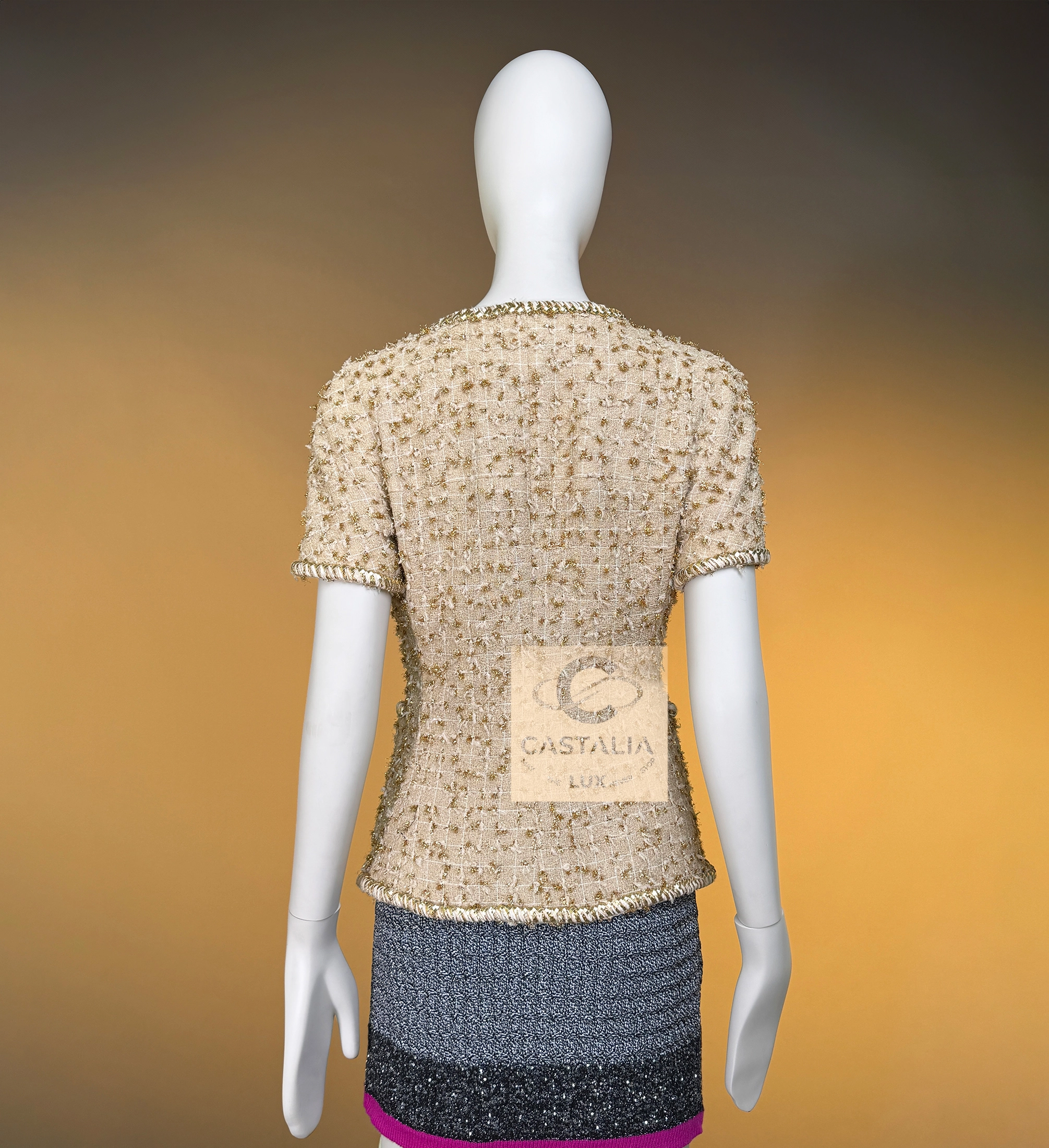 — Woven from precious nude-beige Lesage tweed interlaced with shimmering golden threads, its surface recalls sunlight glistening on coastal sands