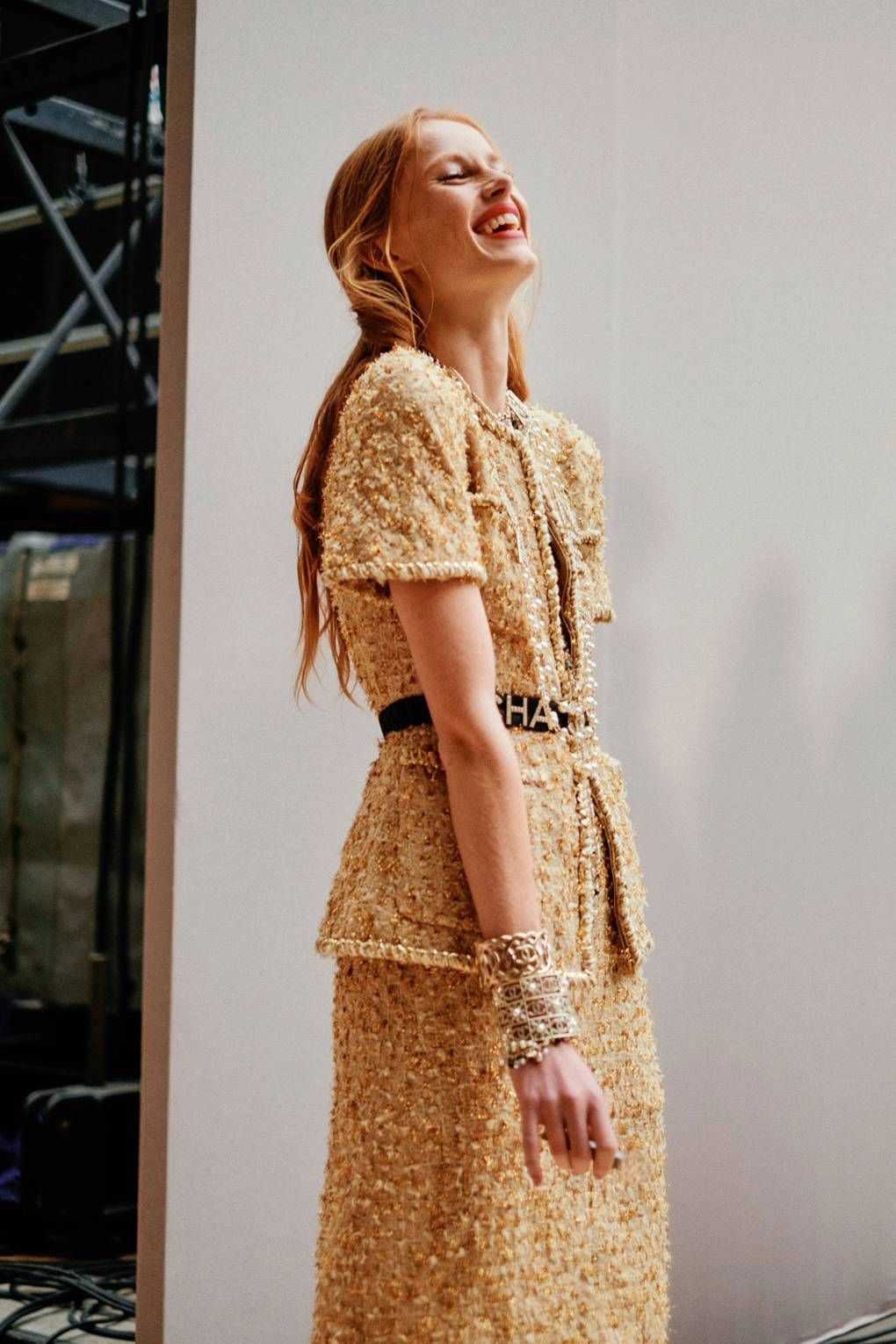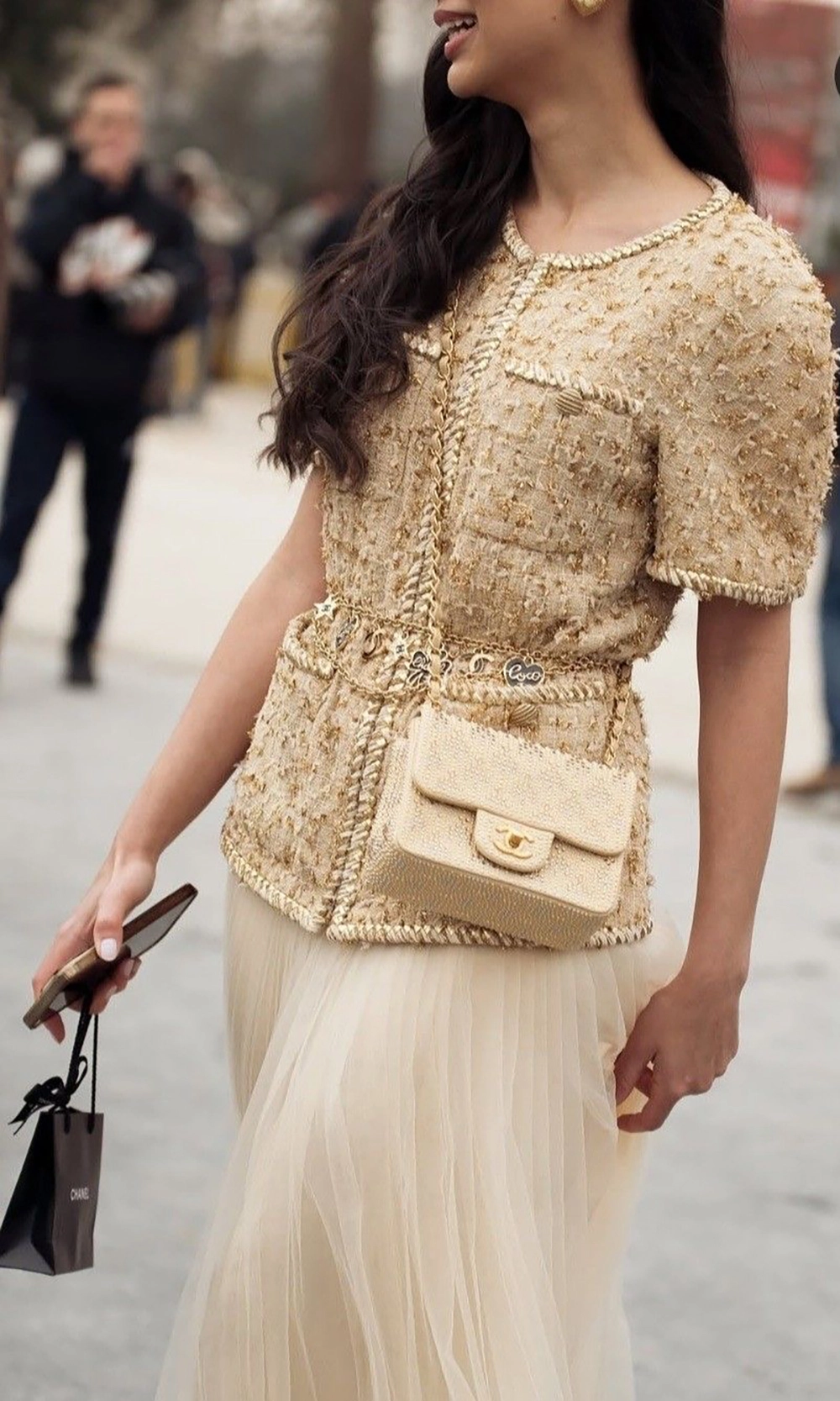 — Woven from precious nude-beige Lesage tweed interlaced with shimmering golden threads,