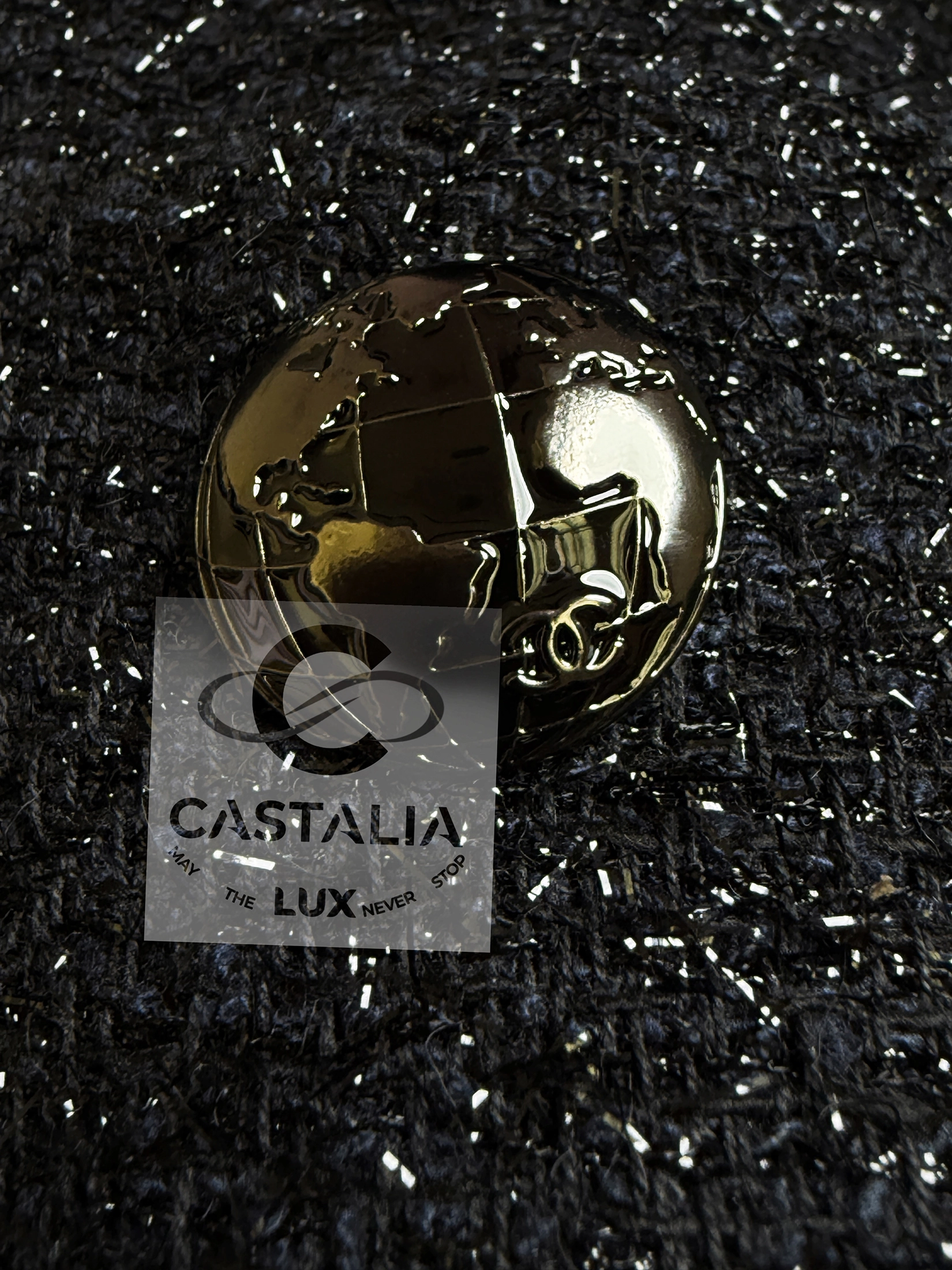 — jewel Globe-shaped CC logo buttons anchor the front, each a quiet axis of orientation in Chanel’s mapped elegance