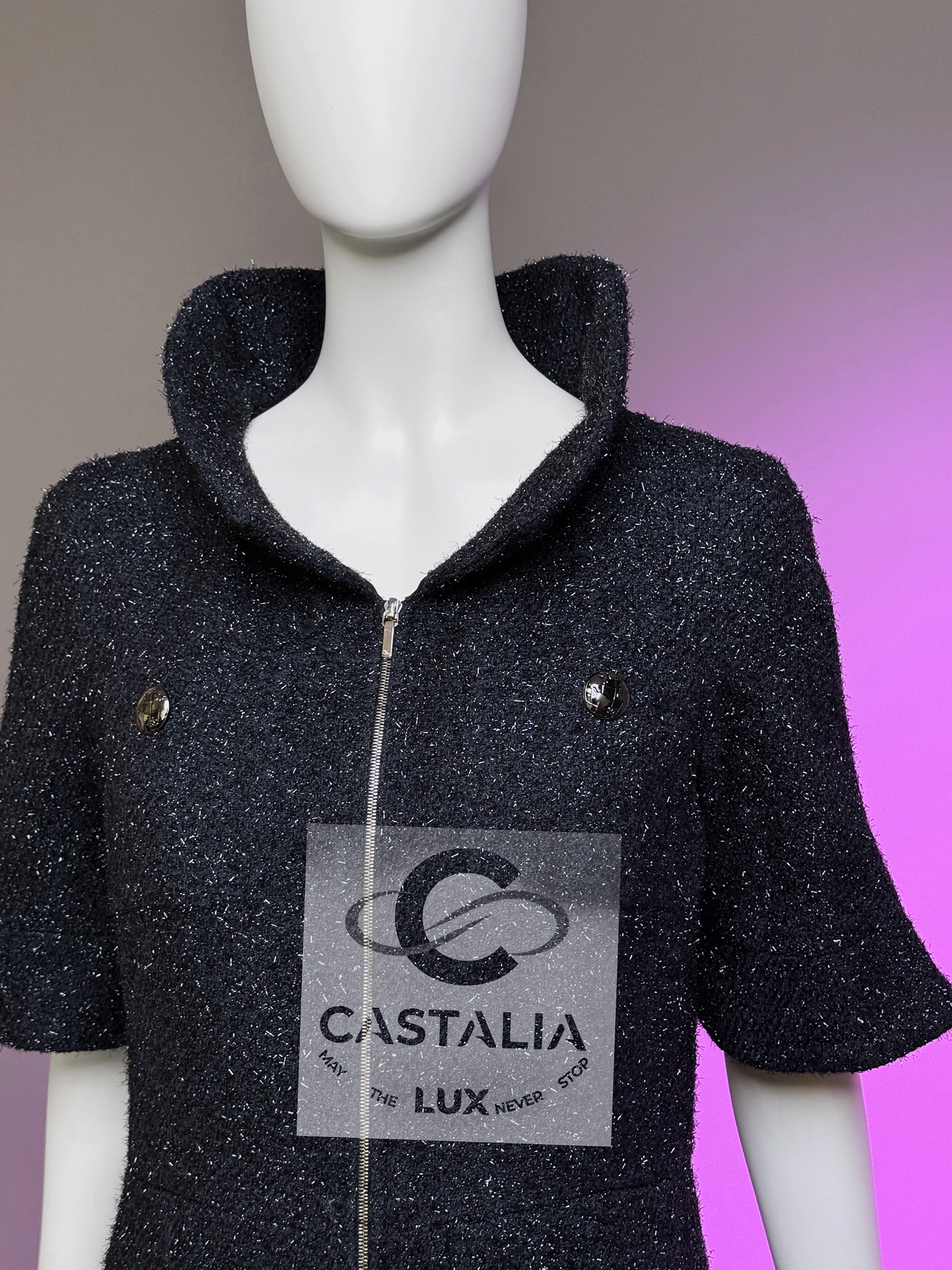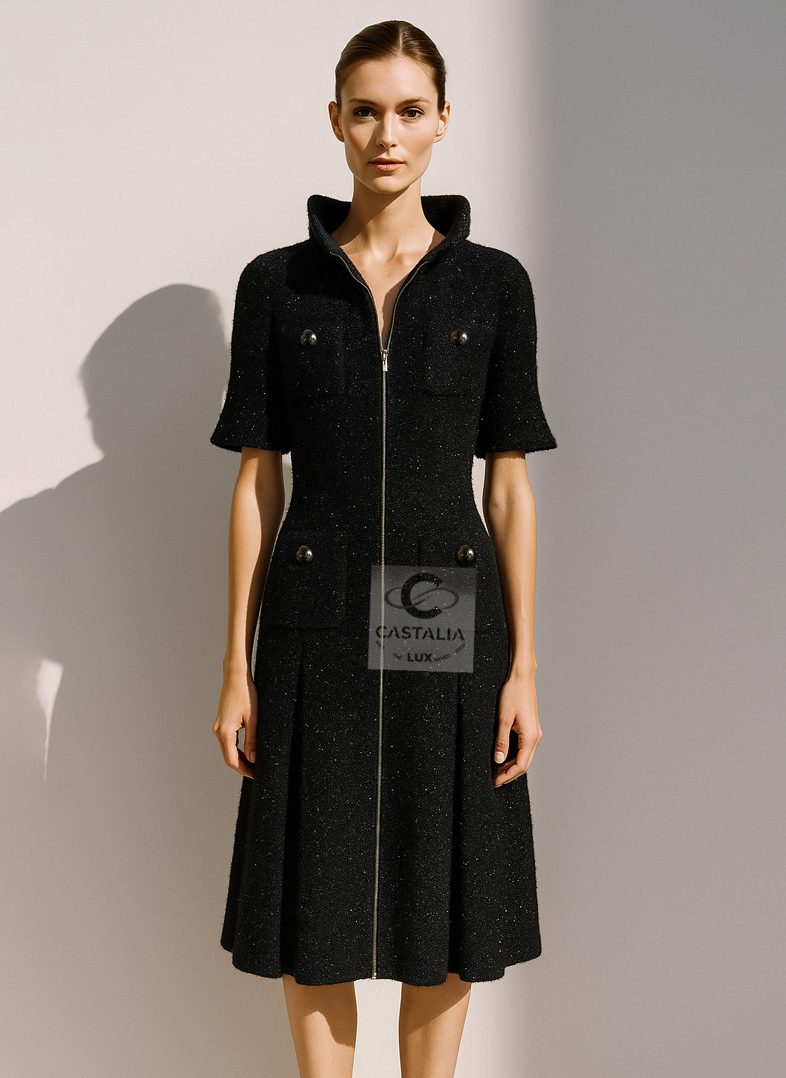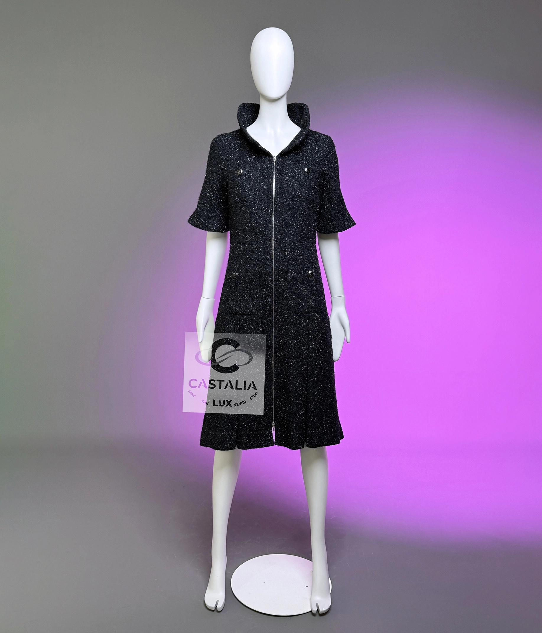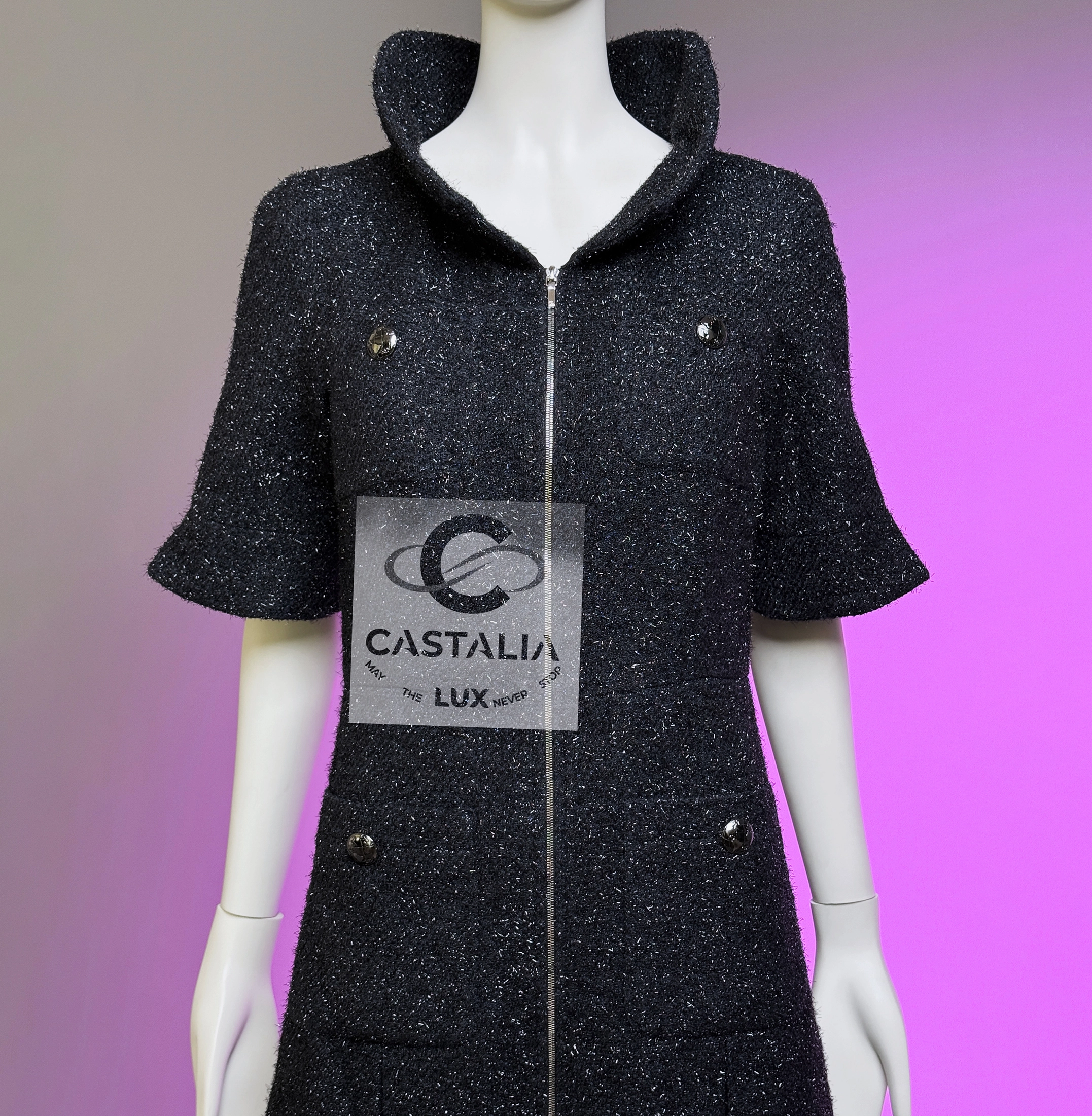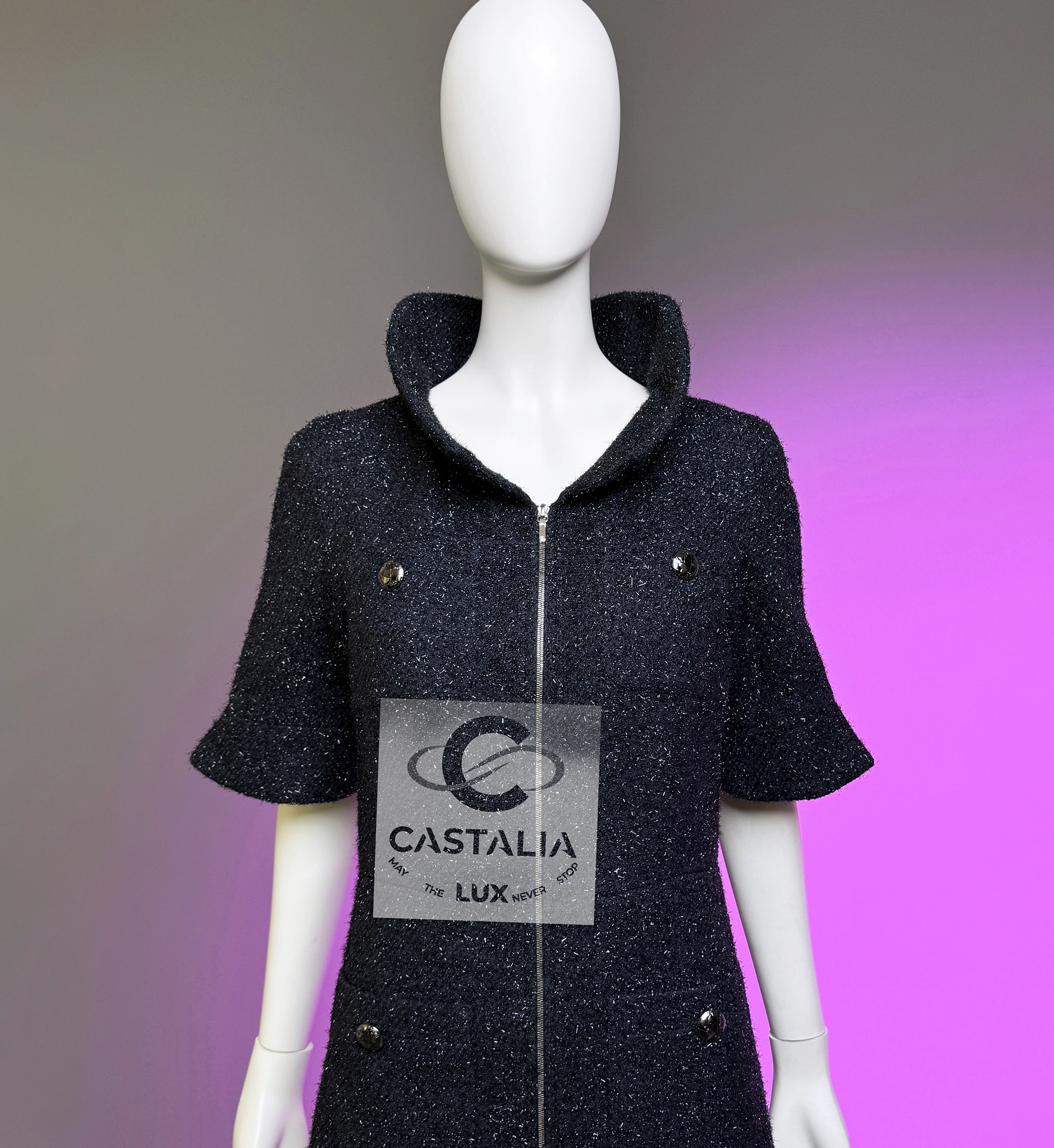~ This collector’s black shimmer Lesage tweed jacket dress is suspended between time zones and inner orbits—this rare Chanel runway piece captures the geometry of movement in a world redefined