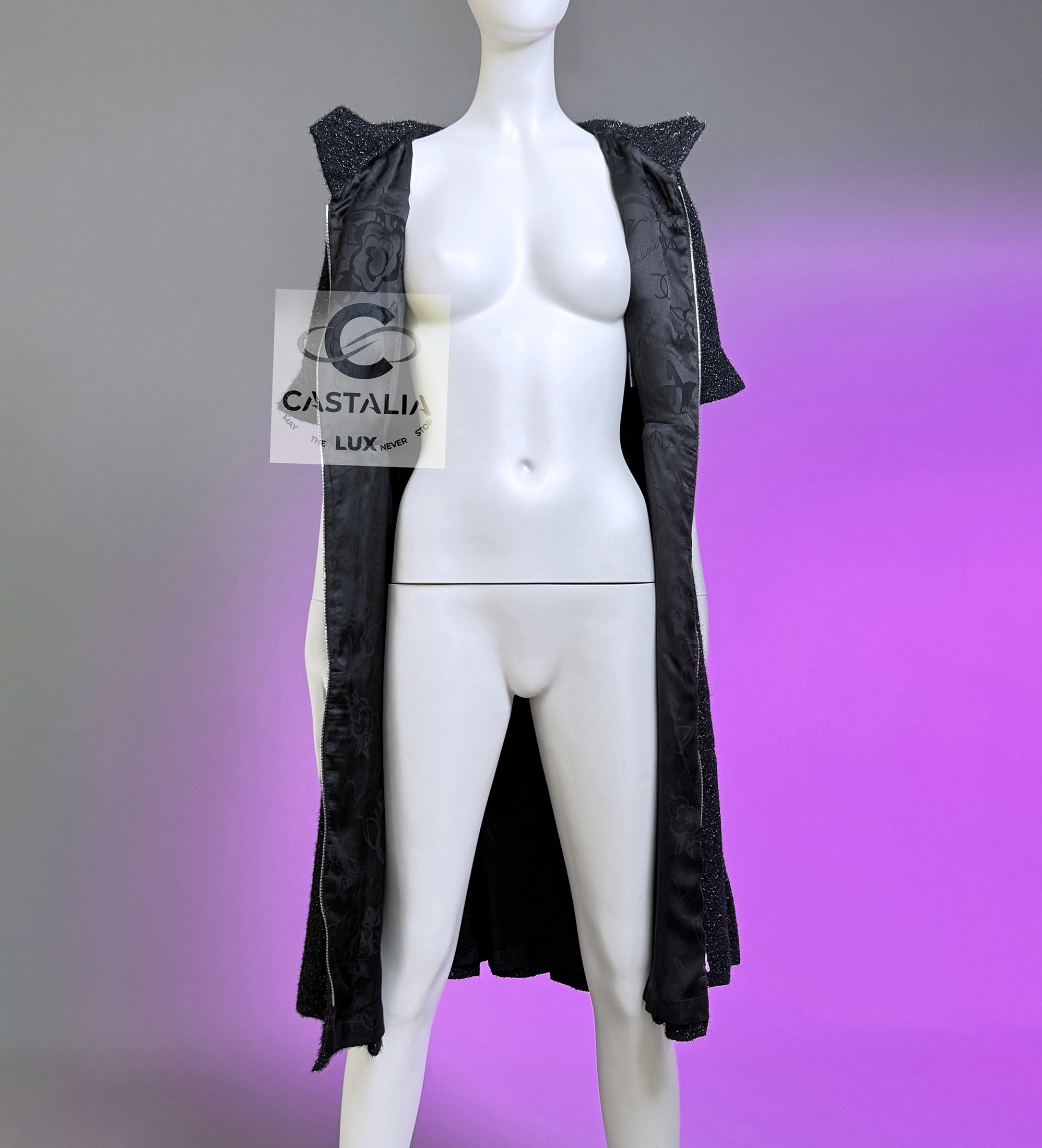 — Woven in cosmic black shimmer tweed, the fabric catches light like distant signals—subtle, encoded, deliberate