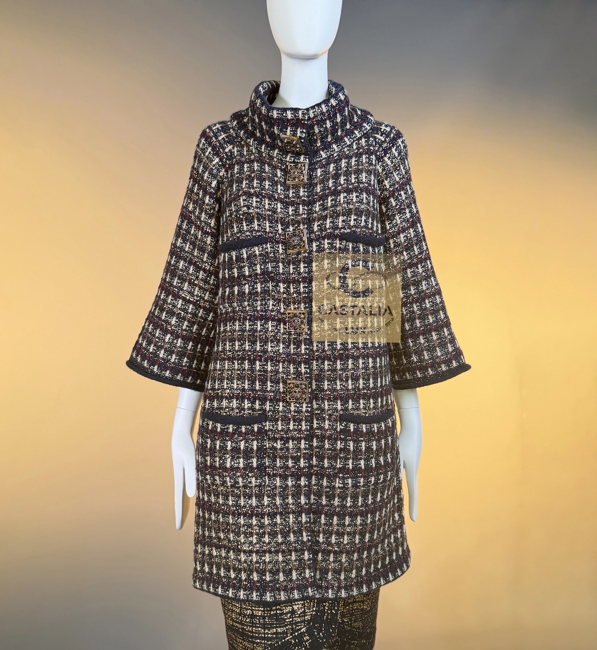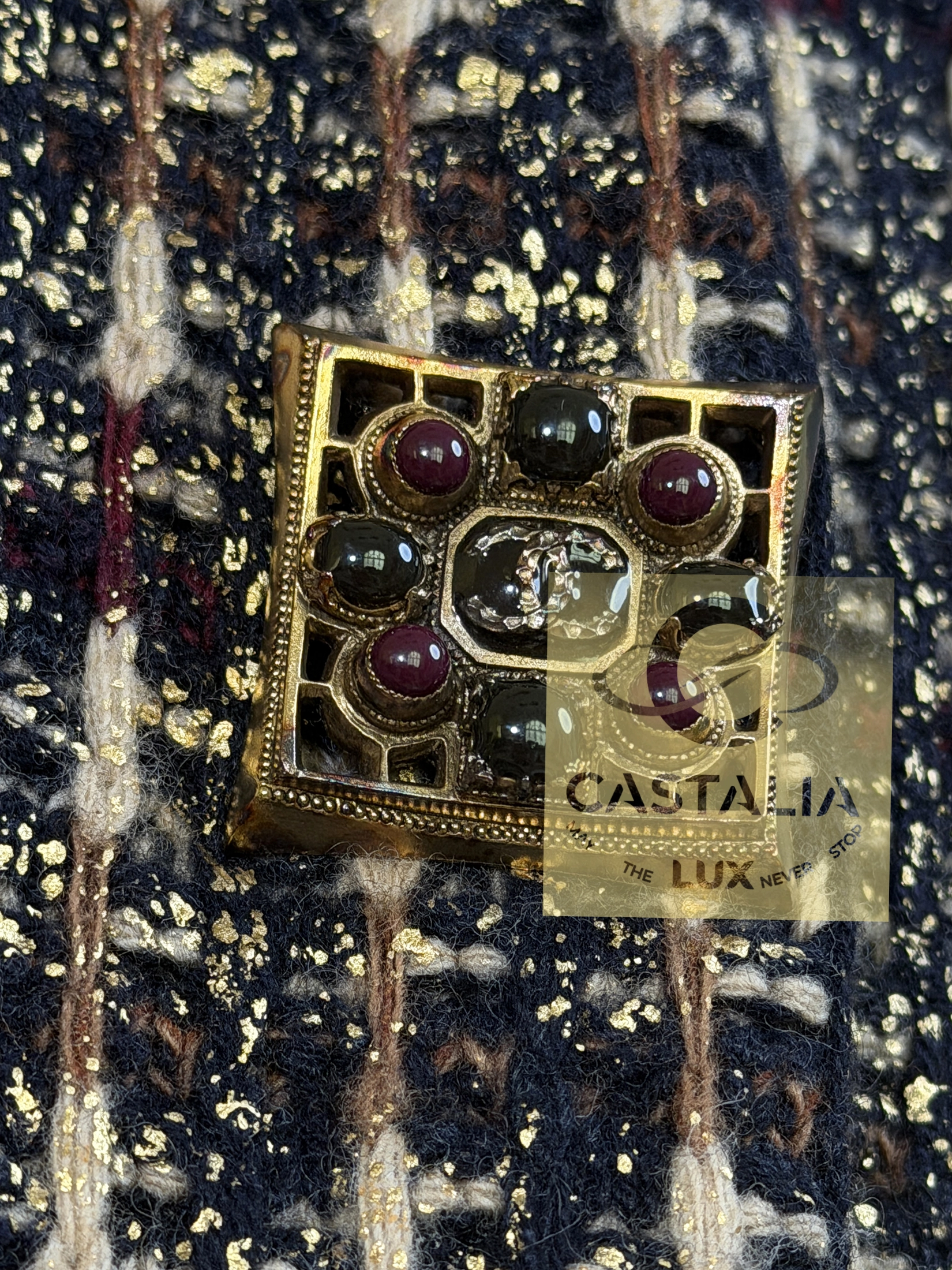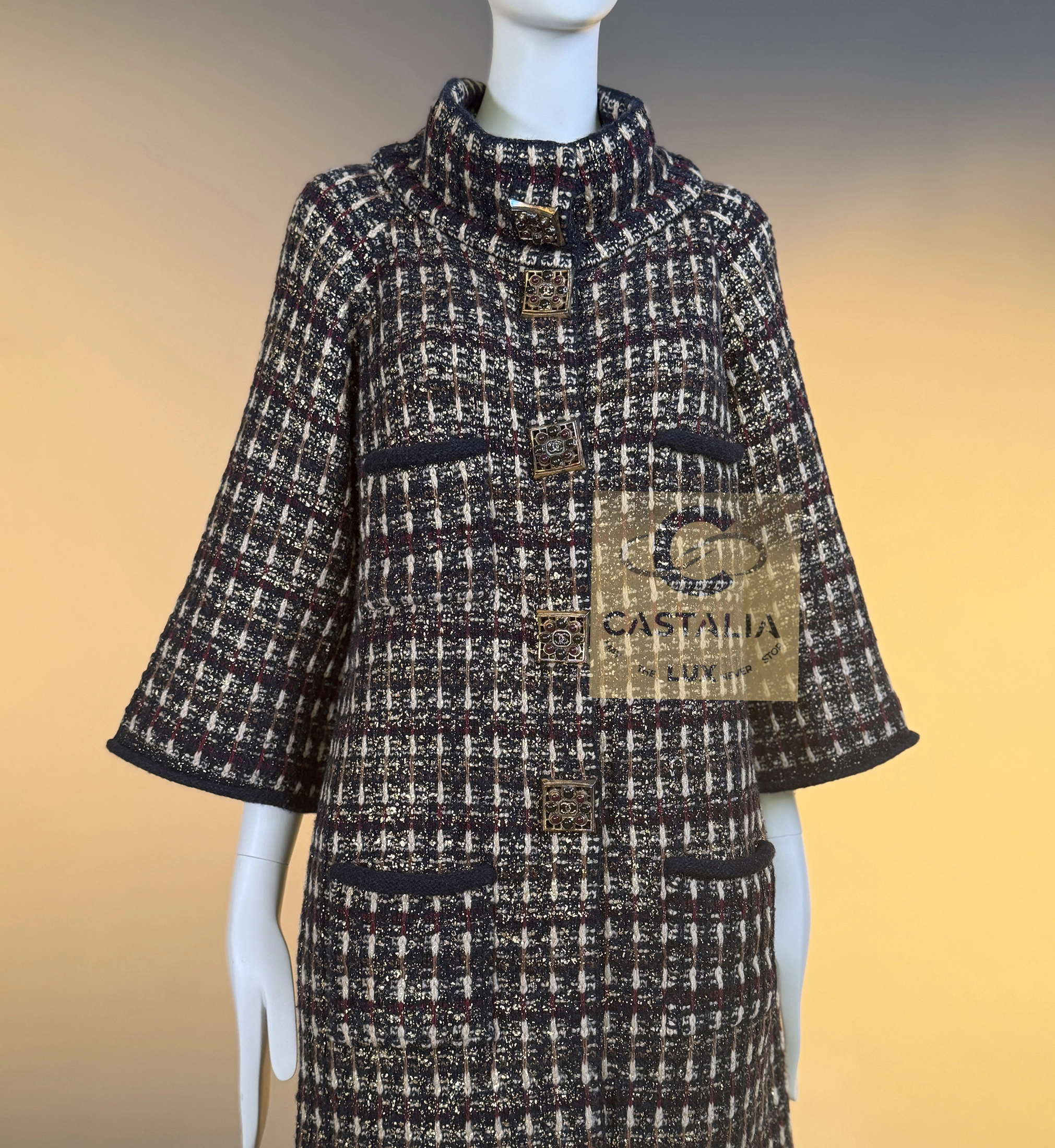 Chanel 16K$ Paris / Byzance Art Level Runway Coat — 2011 Metiers d’ArtCollection by Karl Lagerfeld ~ With initial boutique value over 16,000, today’s boutique value for this level pieces exceeds 20,000$ ~ An exquisite artifact for the true Chanel connoisseur, this coat stands as a rare testament to the maison’s ability to merge fashion with the language of empire ~ This is more than a coat; it is a portal — a garment in which past and present meet in an unbroken line, draping the wearer in the enduring majesty of Chanel’s own Byzantium. // Size mark 36 FR / Condition: never worn // — structure is defined by an iconic four–patch–pocket silhouette and a noble stand collar, cut in sumptuous tweed that carries the weight of history with modern precision — masterpiece jewel Gripoix buttons bearing the CC logo, each one a miniature reliquary — a fragment of light captured in glass and gold — subtle shimmer coating catches movement like Byzantine mosaics catching candlelight, a quiet homage to the lost grandeur of the lost Eastern empire