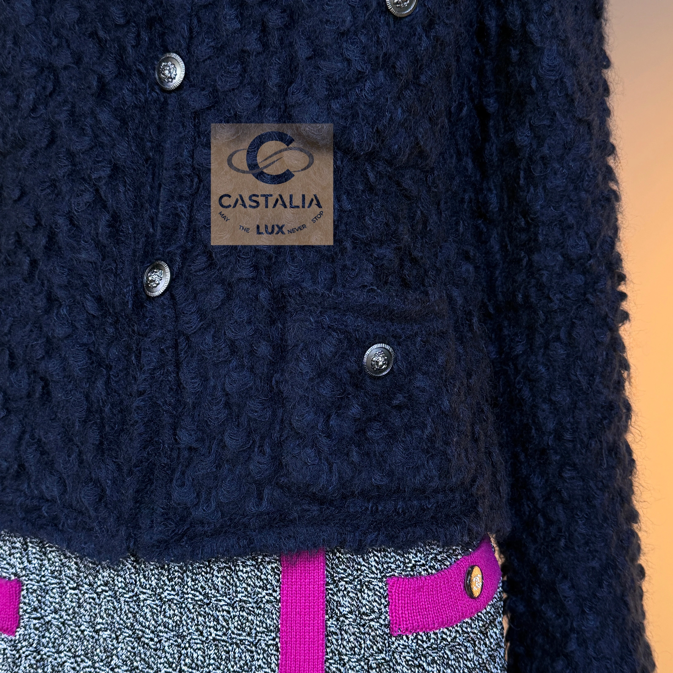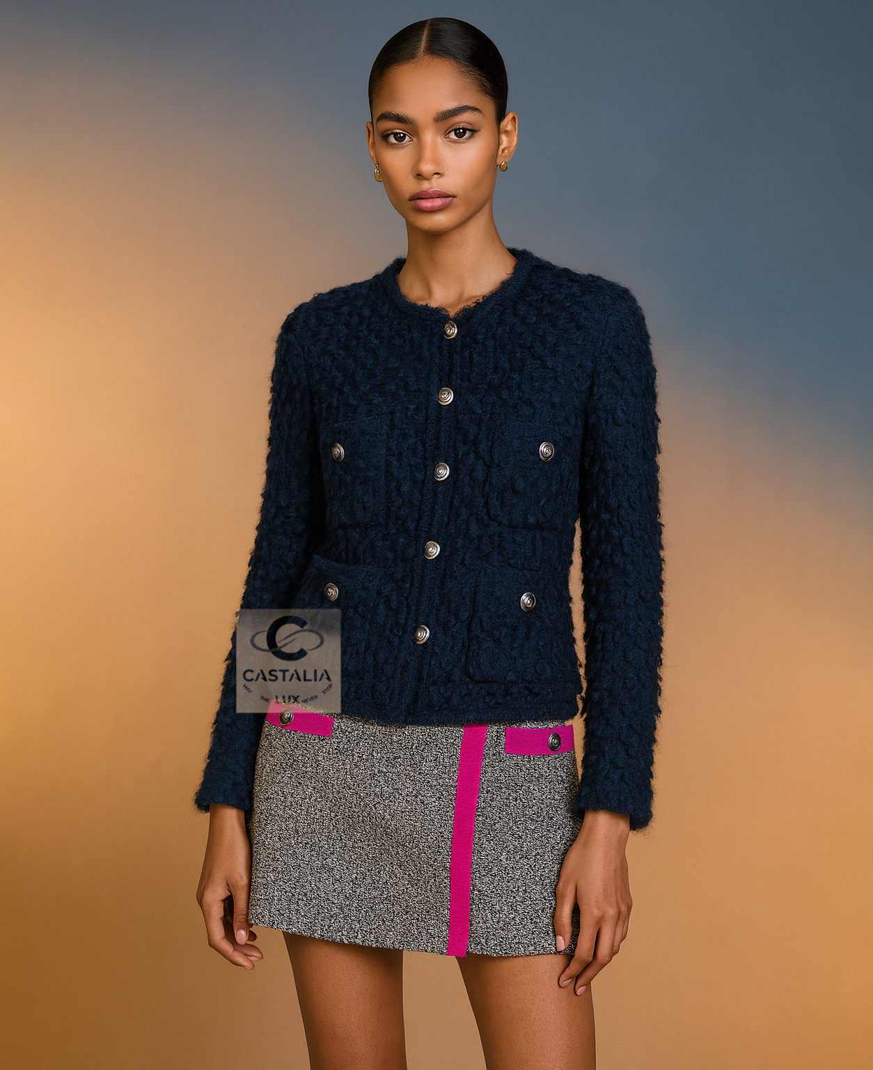 — Woven from fluffy fantasy tweed in deep dark navy and black, the texture evokes nocturnal velvet and London mist — soft yet sculptural, light yet infinitely rich