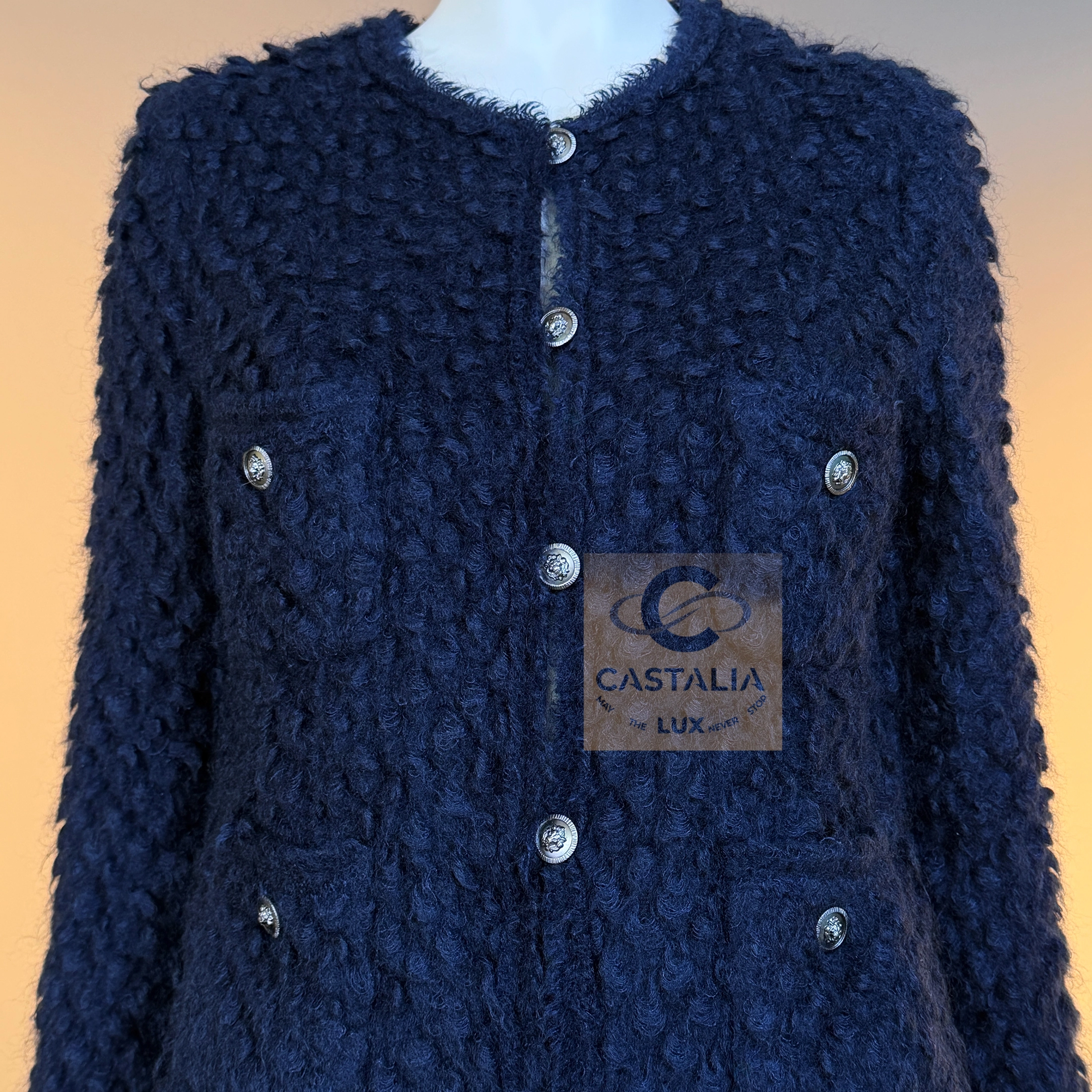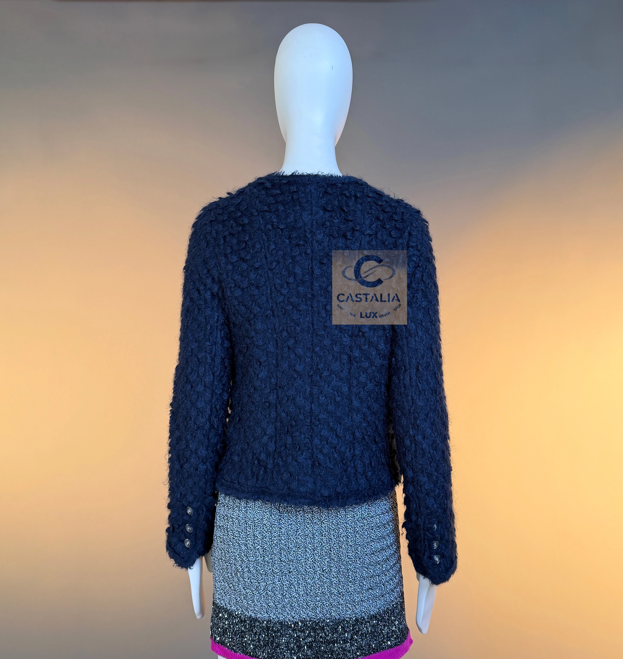 CHANEL Paris / LONDON Métiers d’Art Collection — “The Little Black Jacket” — A Collectible Masterpiece by Karl Lagerfeld ~ From the runway of Chanel’s Paris / London Métiers d’Art, this collectible Little Black Jacket is a sublime reinterpretation of Coco Chanel’s eternal code — where restraint becomes radiance, and tradition becomes transcendence // Size mark 40 FR / Condition: never worn // — Woven from fluffy fantasy tweed in deep dark navy and black, the texture evokes nocturnal velvet and London mist — soft yet sculptural, light yet infinitely rich — iconic four-pocket silhouette, perfectly balanced in its geometry, stands as the visual mantra of Chanel’s design language — a silent dialogue between order and intuition — silver-tone CC logo buttons, each crowned with a lion’s head motif, symbol of power, protection, and the maison’s own Leo spirit — Tonal silk lining and chain-link hem complete the construction, ensuring the garment falls with architectural precision — the couture equivalent of a whispered symphony