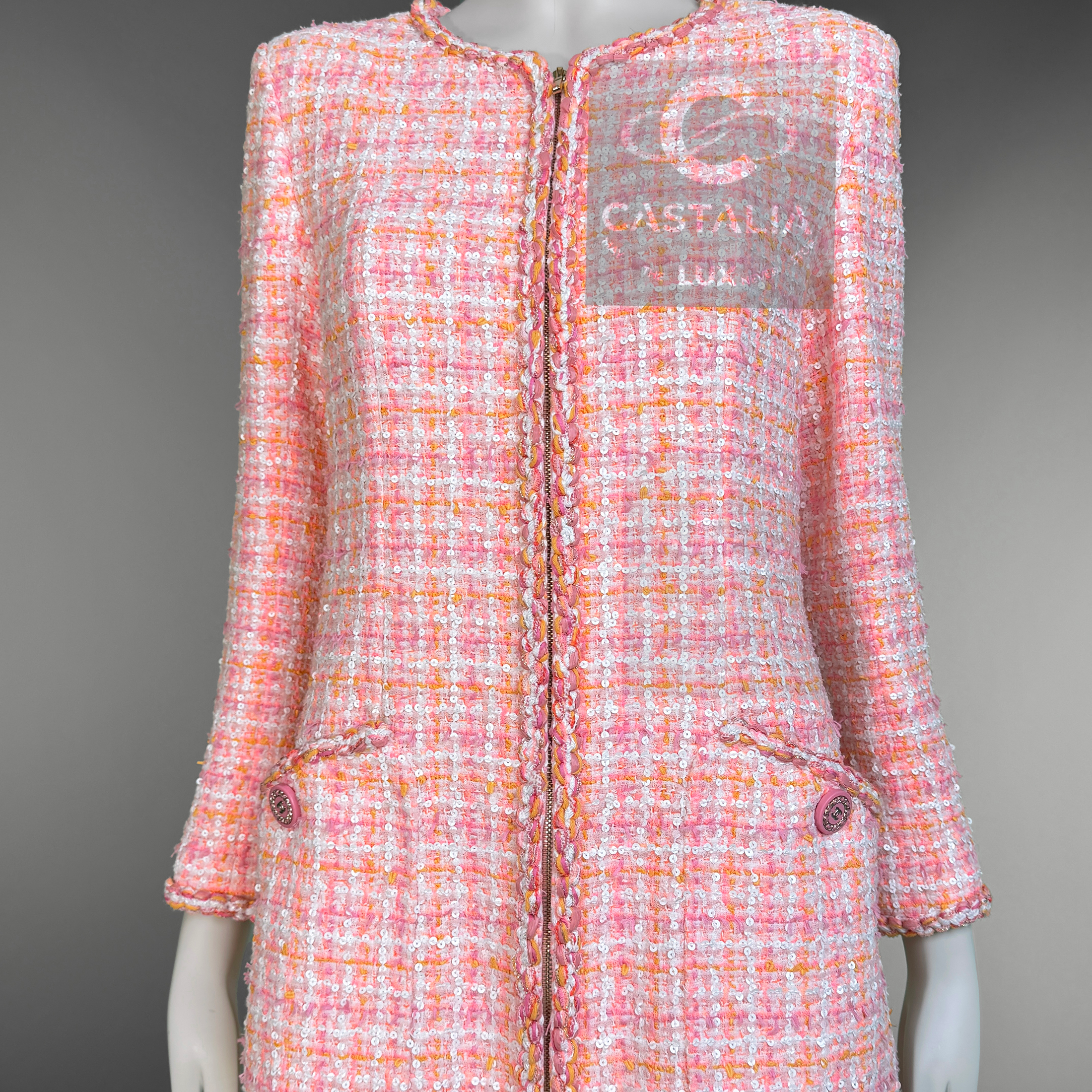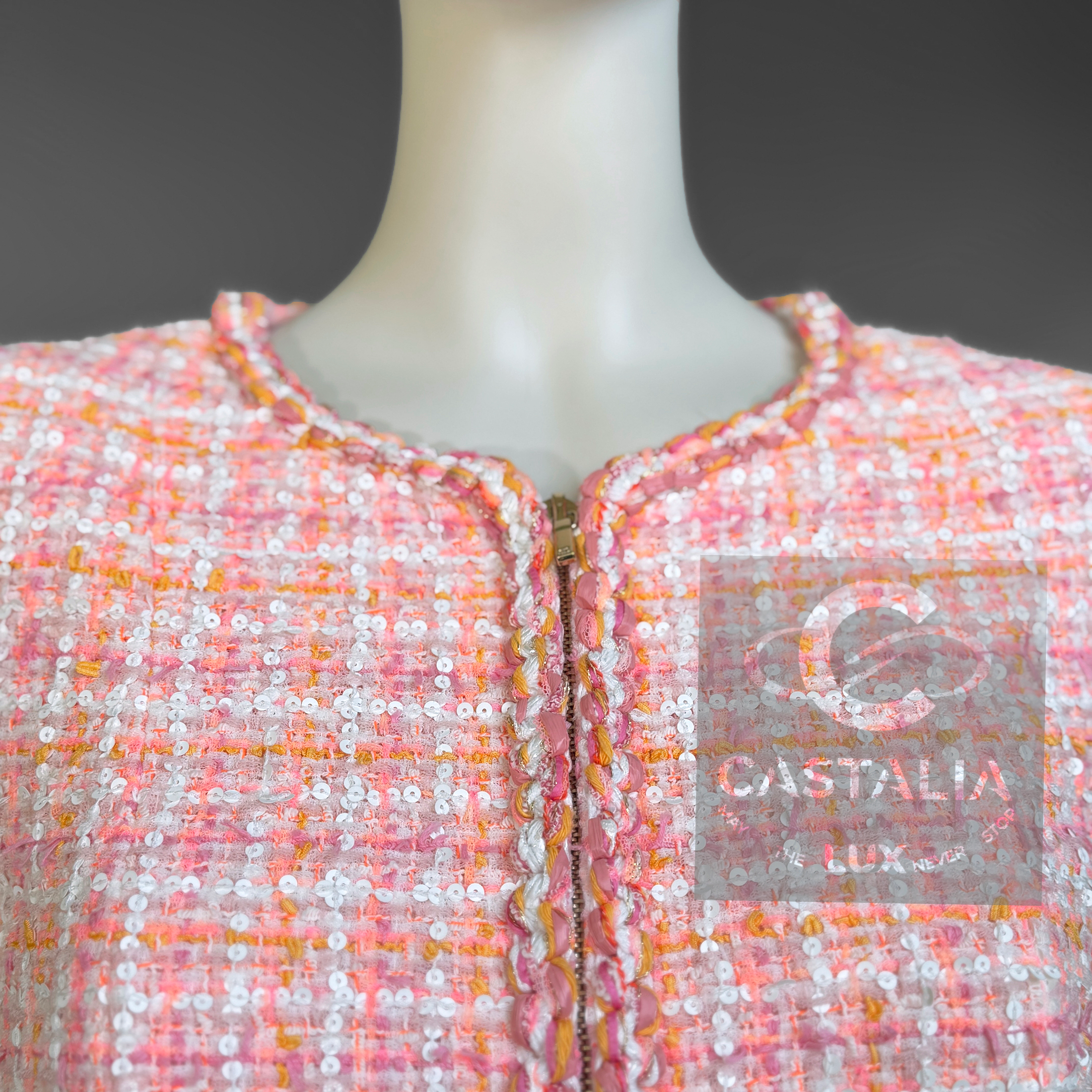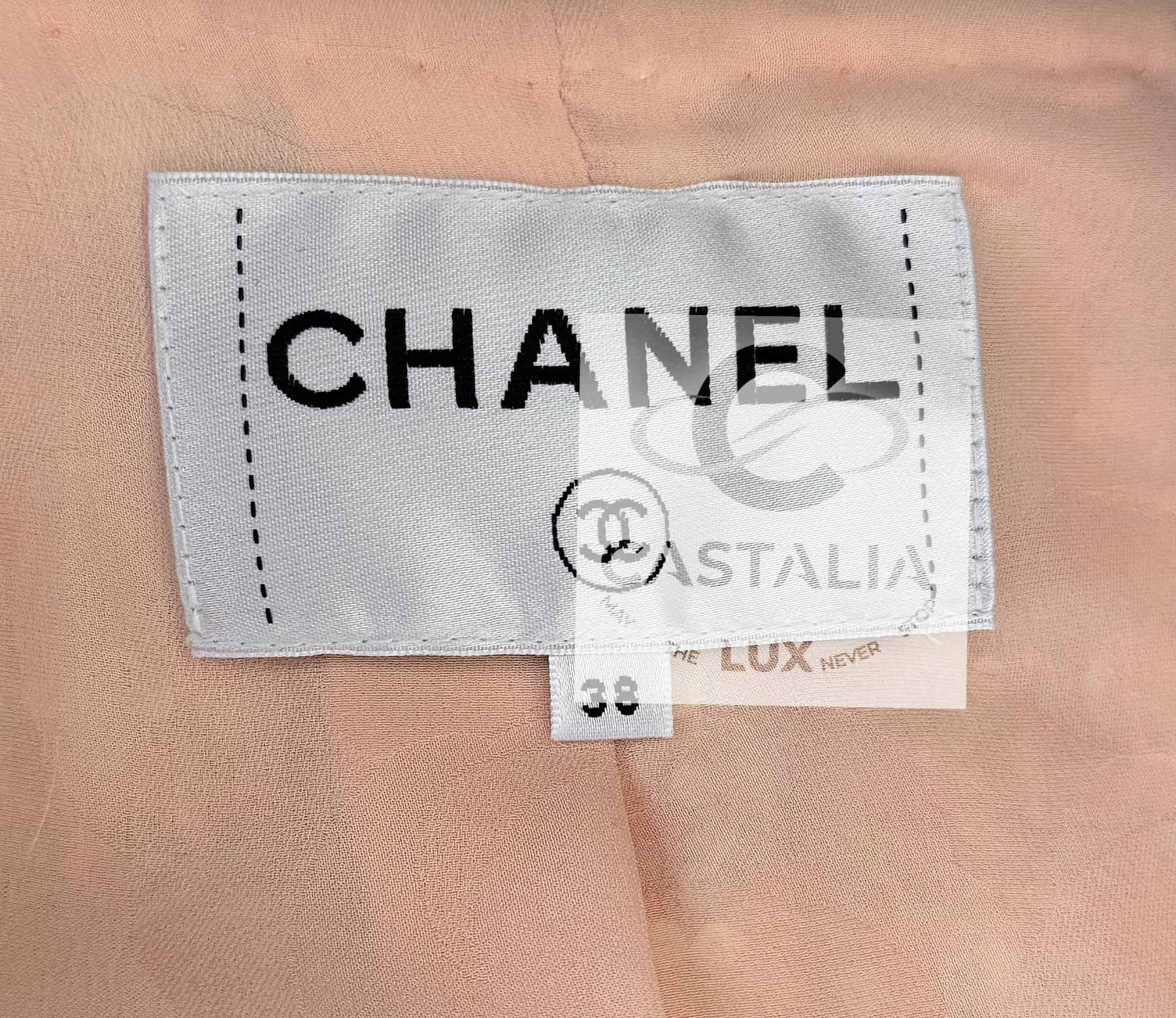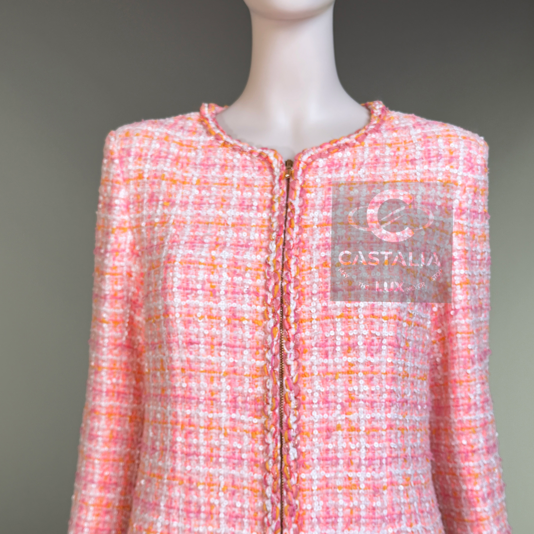 An artifact of luminous rarity, this Chanel masterpiece from Karl Lagerfeld’s La Pausa 2019 Cruise collection is more than couture — it is an emblem of the Maison’s maritime reverie, immortalized on Penélope Cruz and gracing magazine covers worldwide. ~ In the lexicon of Chanel, it is a port of call for connoisseurs; in the realm of collecting, it is a compass that points unerringly toward eternity. // Size mark 38 FR / Condition: never worn // ~ Woven in Lesage’s storied ateliers, its peach-hued tweed is alive with the subtlest constellation of sequins — glimmers like sea spray caught at dawn - CC logo buttons at pockets and cuffs - front zip fastening with CC insignia - sealing within a tonal silk lining that moves like calm water beneath.