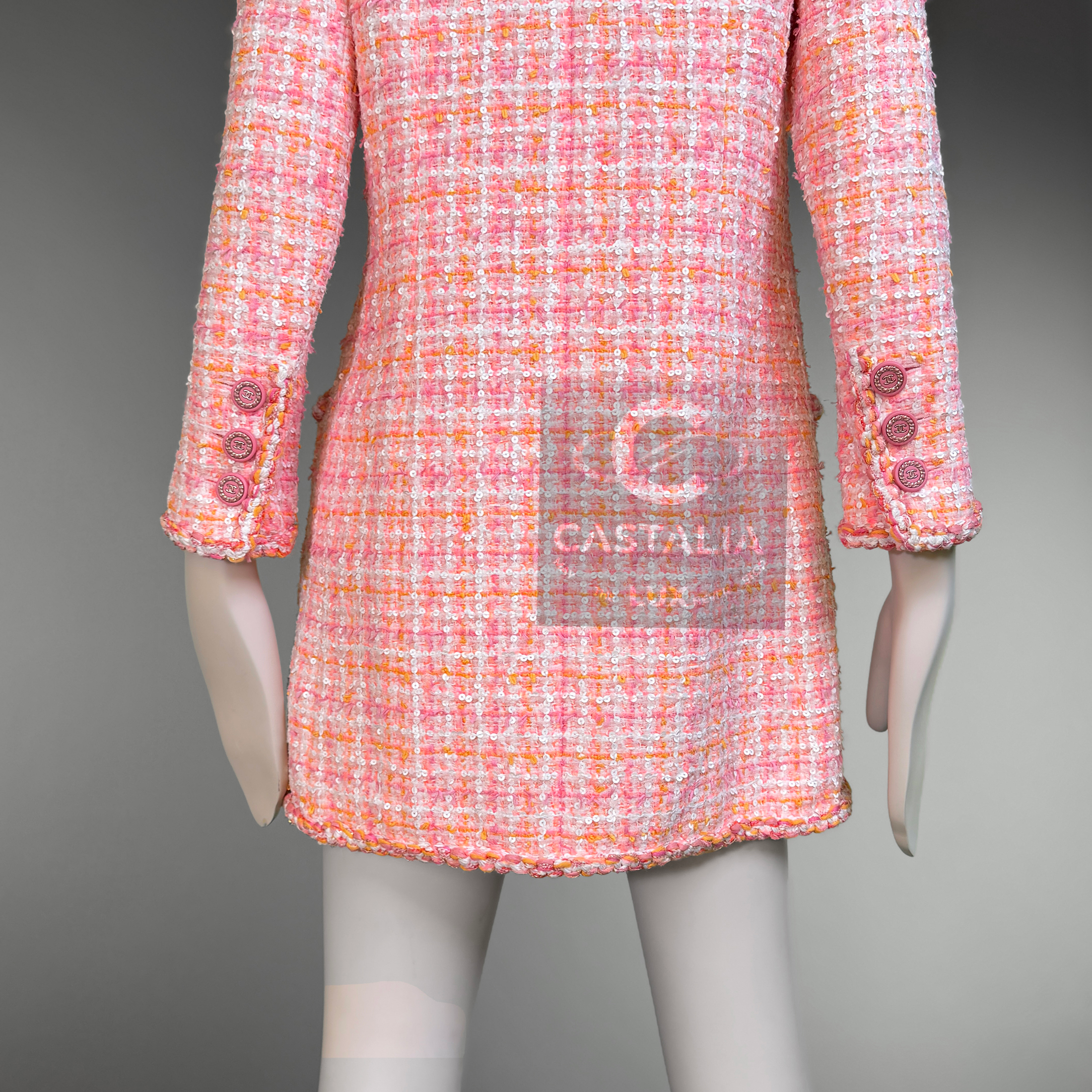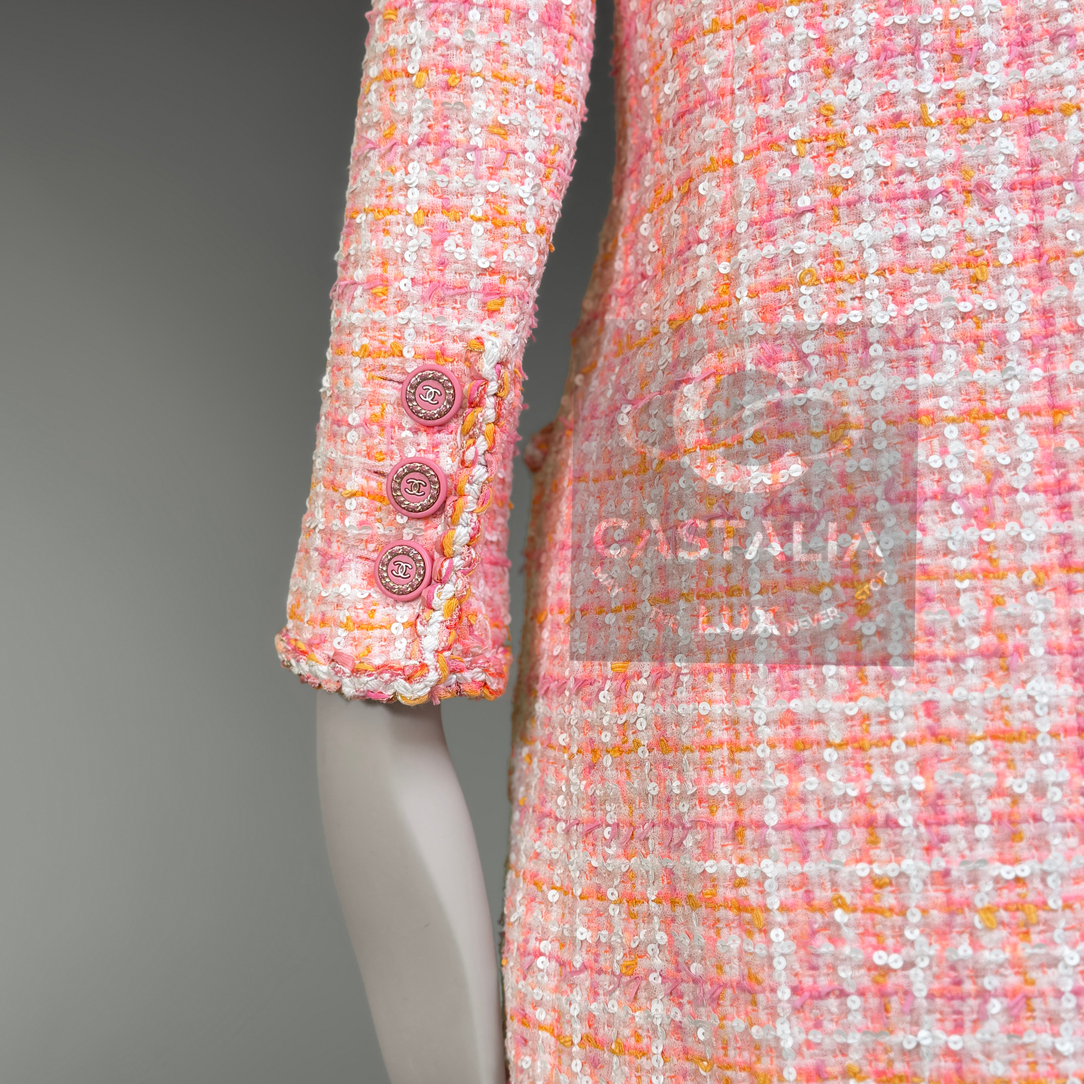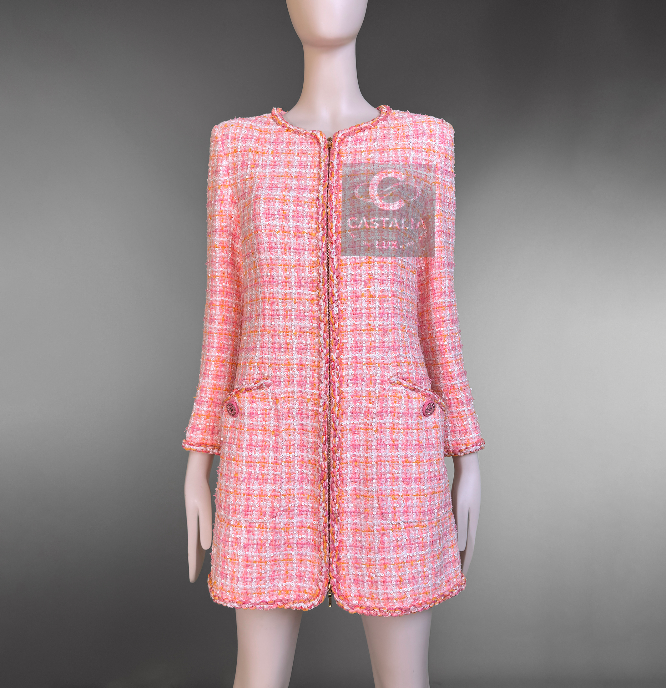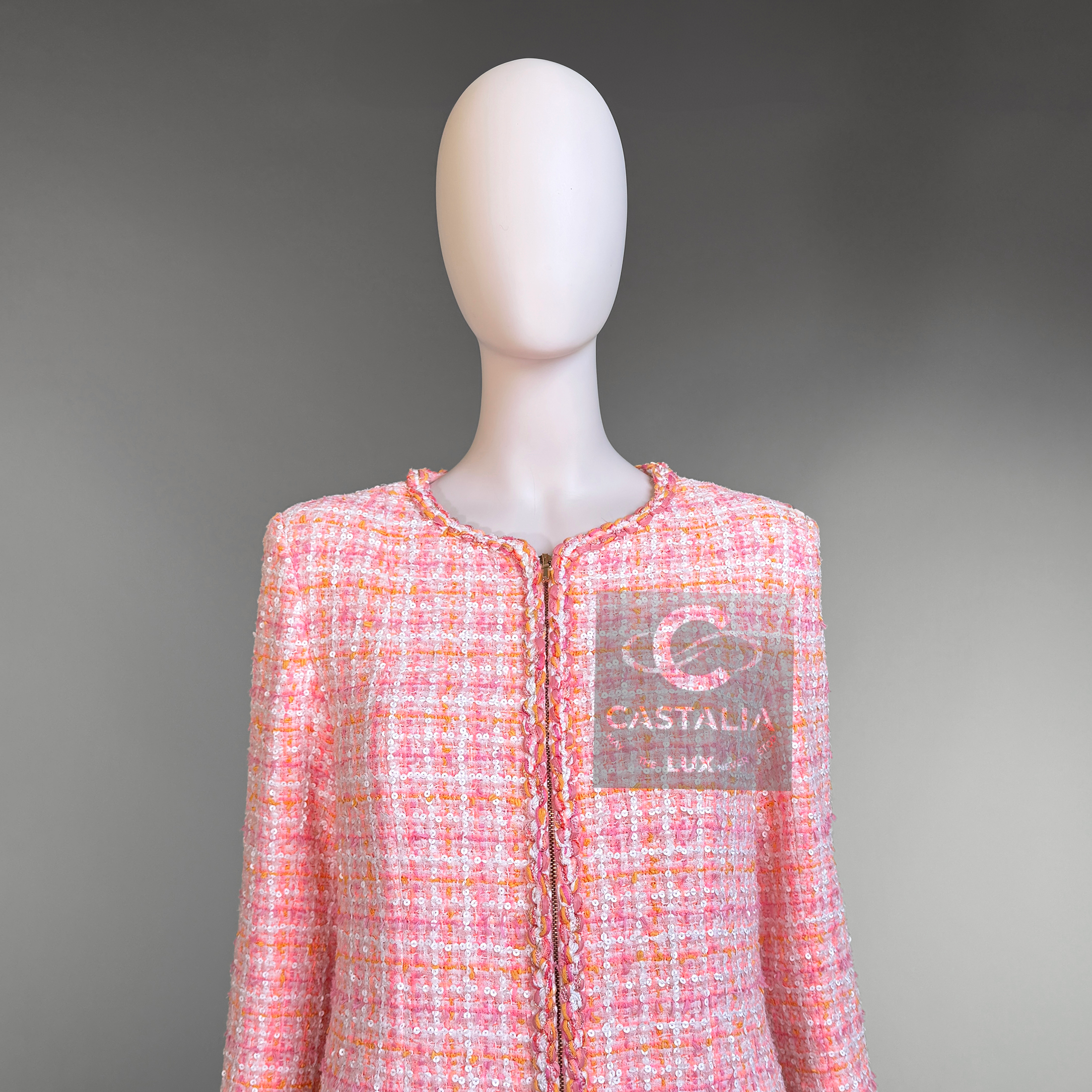 An artifact of luminous rarity, this Chanel masterpiece from Karl Lagerfeld’s La Pausa 2019 Cruise collection is more than couture — it is an emblem of the Maison’s maritime reverie, immortalized on Penélope Cruz and gracing magazine covers worldwide. ~ In the lexicon of Chanel, it is a port of call for connoisseurs; in the realm of collecting, it is a compass that points unerringly toward eternity. // Size mark 38 FR / Condition: never worn // ~ Woven in Lesage’s storied ateliers, its peach-hued tweed is alive with the subtlest constellation of sequins — glimmers like sea spray caught at dawn - CC logo buttons at pockets and cuffs - front zip fastening with CC insignia - sealing within a tonal silk lining that moves like calm water beneath.