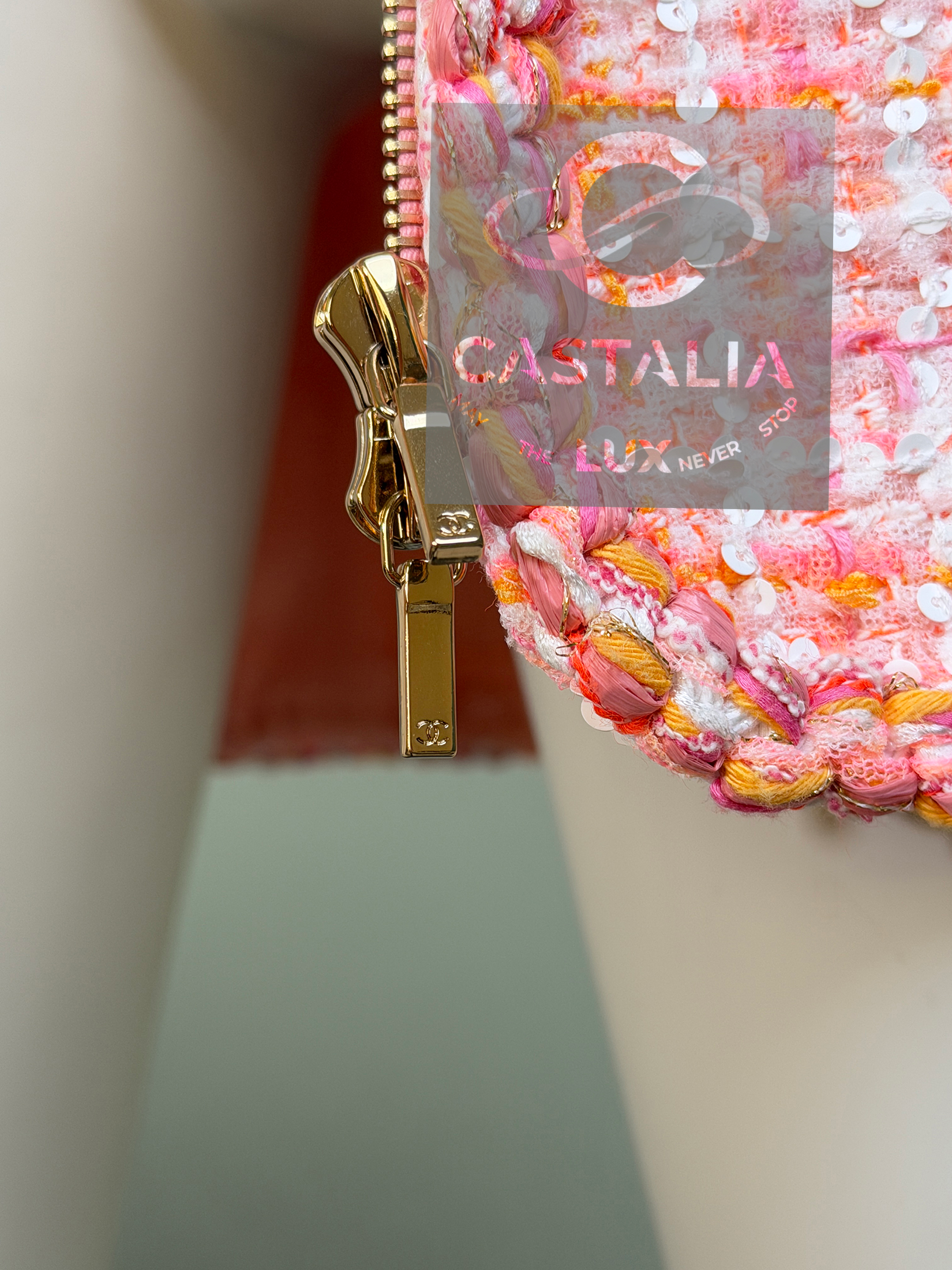 ~ Woven in Lesage’s storied ateliers, its peach-hued tweed is alive with the subtlest constellation of sequins — glimmers like sea spray caught at dawn