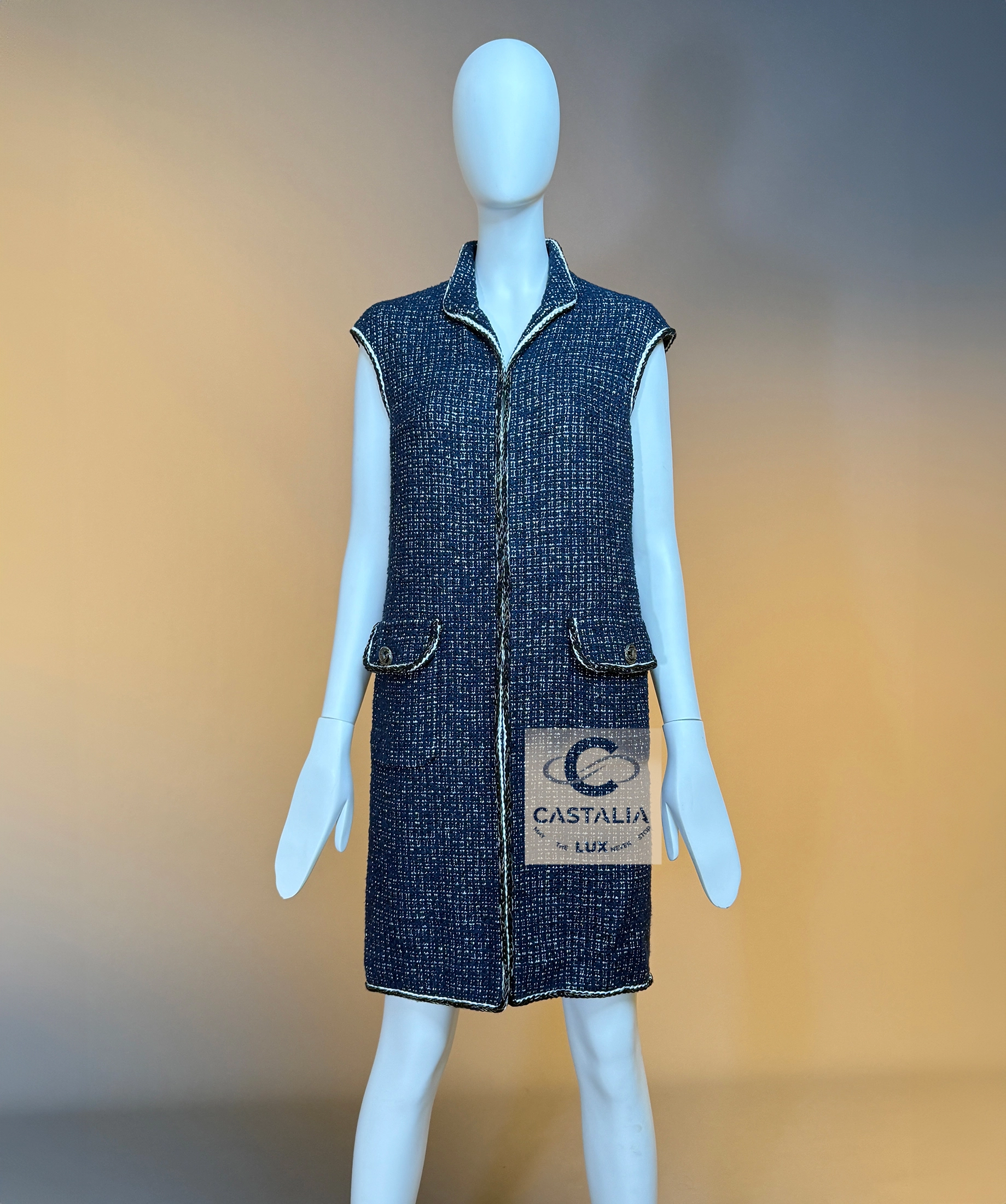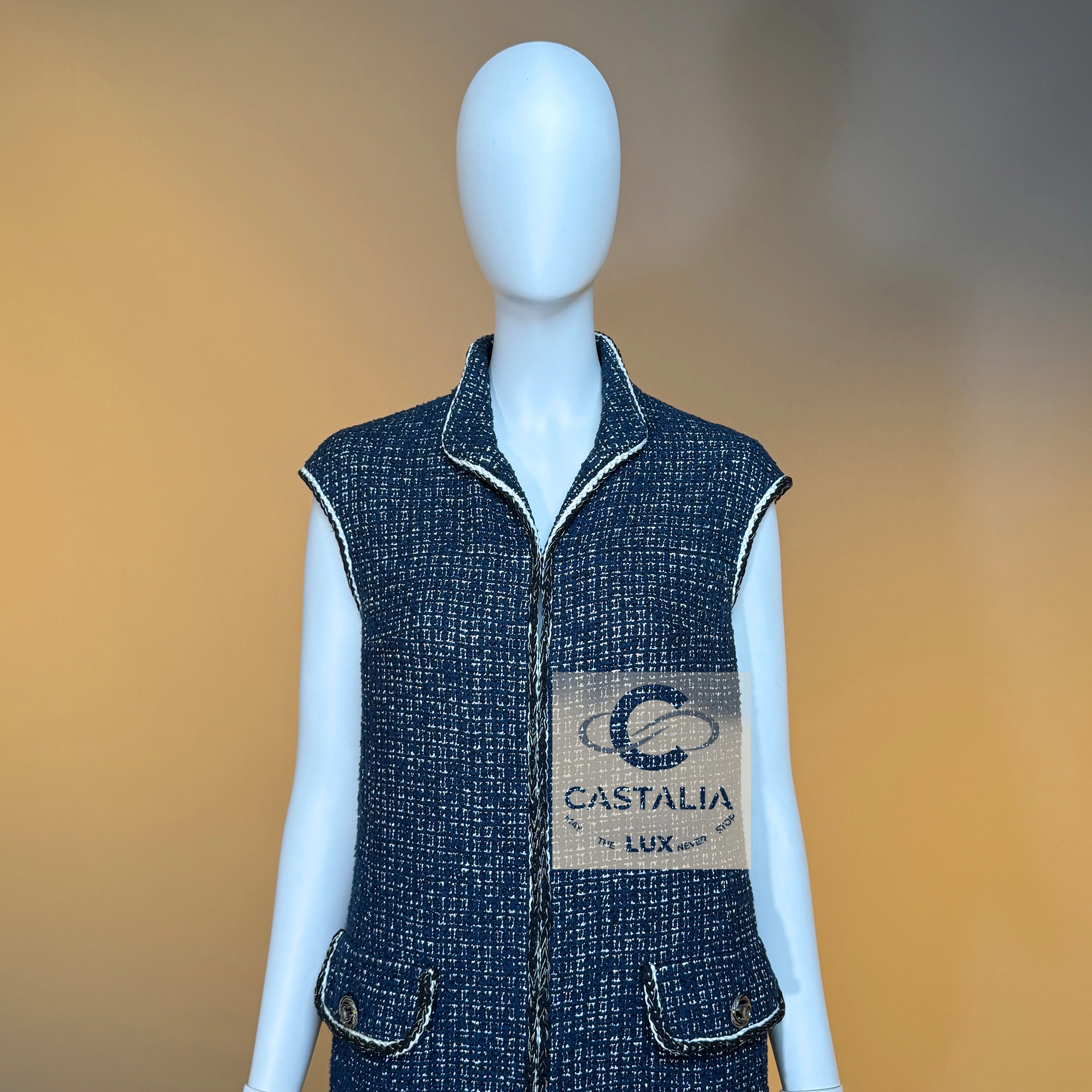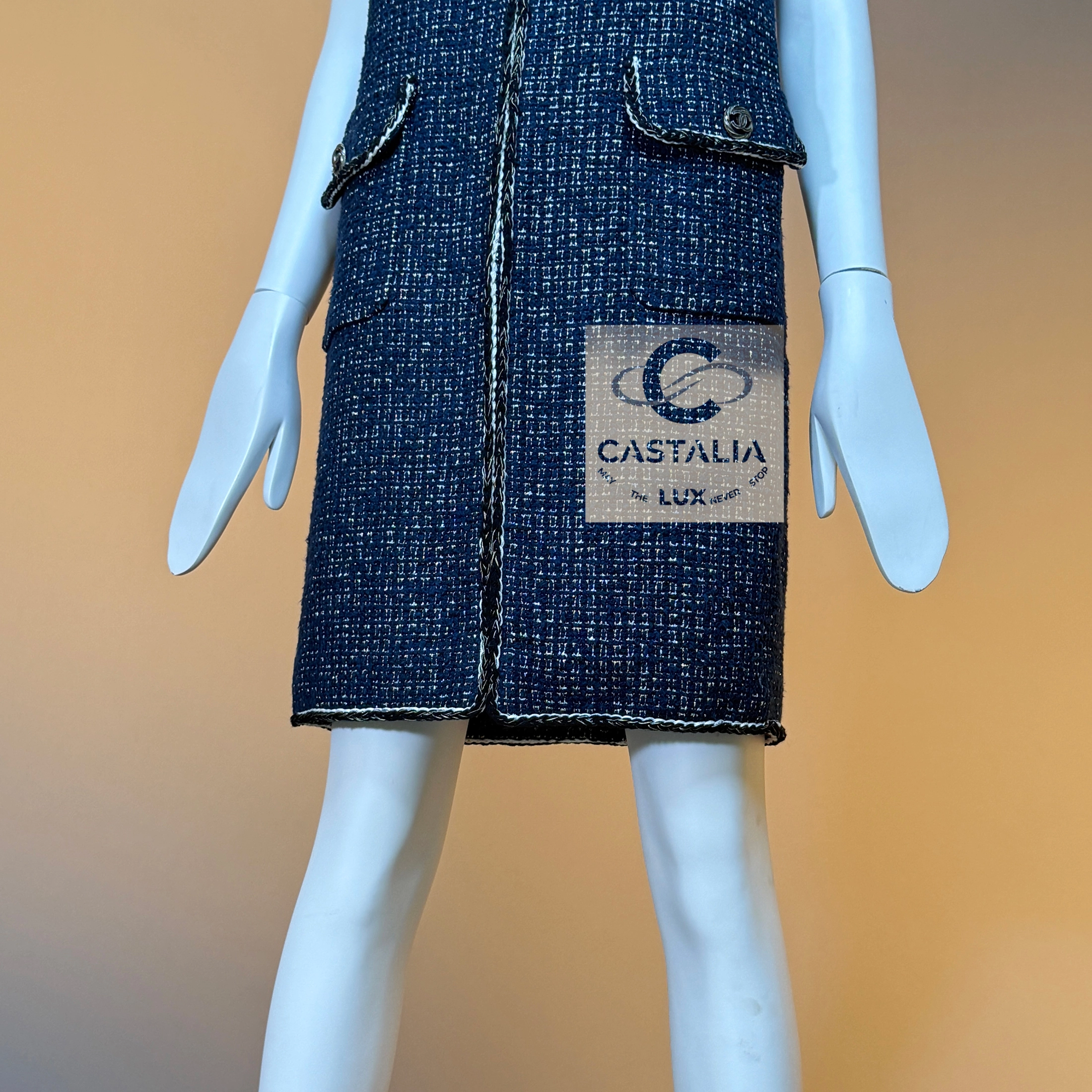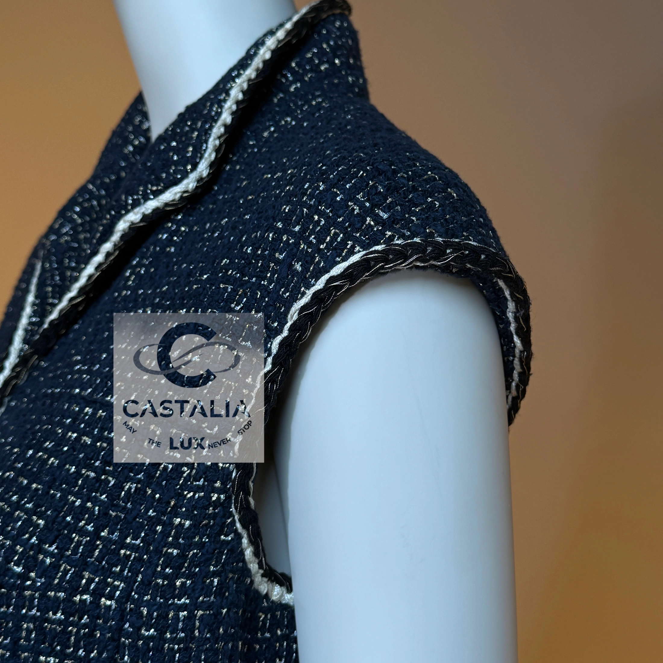 ~This CHANEL sleeveless jacket vest, cut in the Maison’s most precious Lesage tweed, weaves deep navy with elusive threads of gold and silver, catching illumination as if the fabric itself remembers the shimmer of twilight horizons // Size mark 34 FR / Condition: never worn // — silhouette is long and refining, a vertical axis traced by the maison’s signature braided trims, each line a subtle proclamation of heritage — Two front patch pockets, each crowned with a CC logo button, serve not merely as function but as the seal of couture authority — Beneath the surface, a tonal silk lining glides against the skin—an invisible luxury for the wearer alone — closes with a concealed hook-and-eye, a gesture of discretion that lets the shimmer breathe without interruption