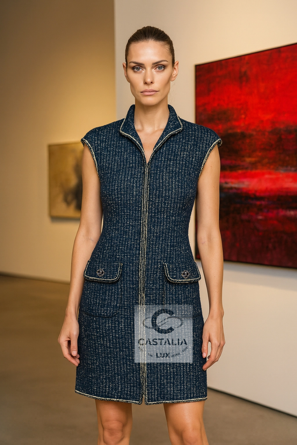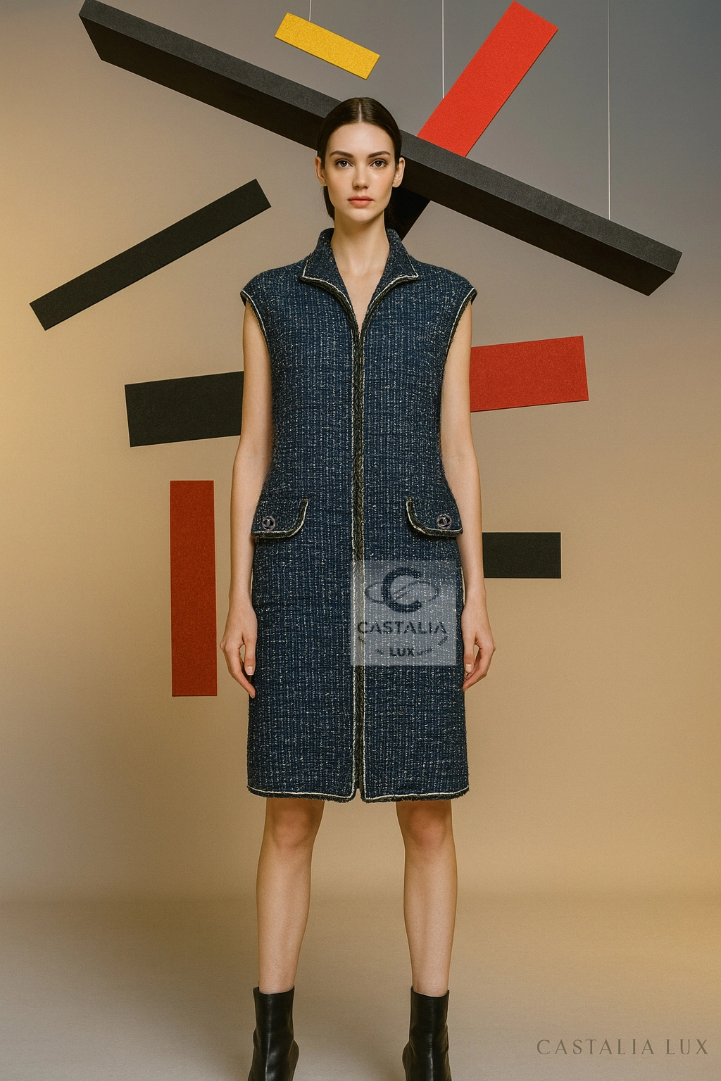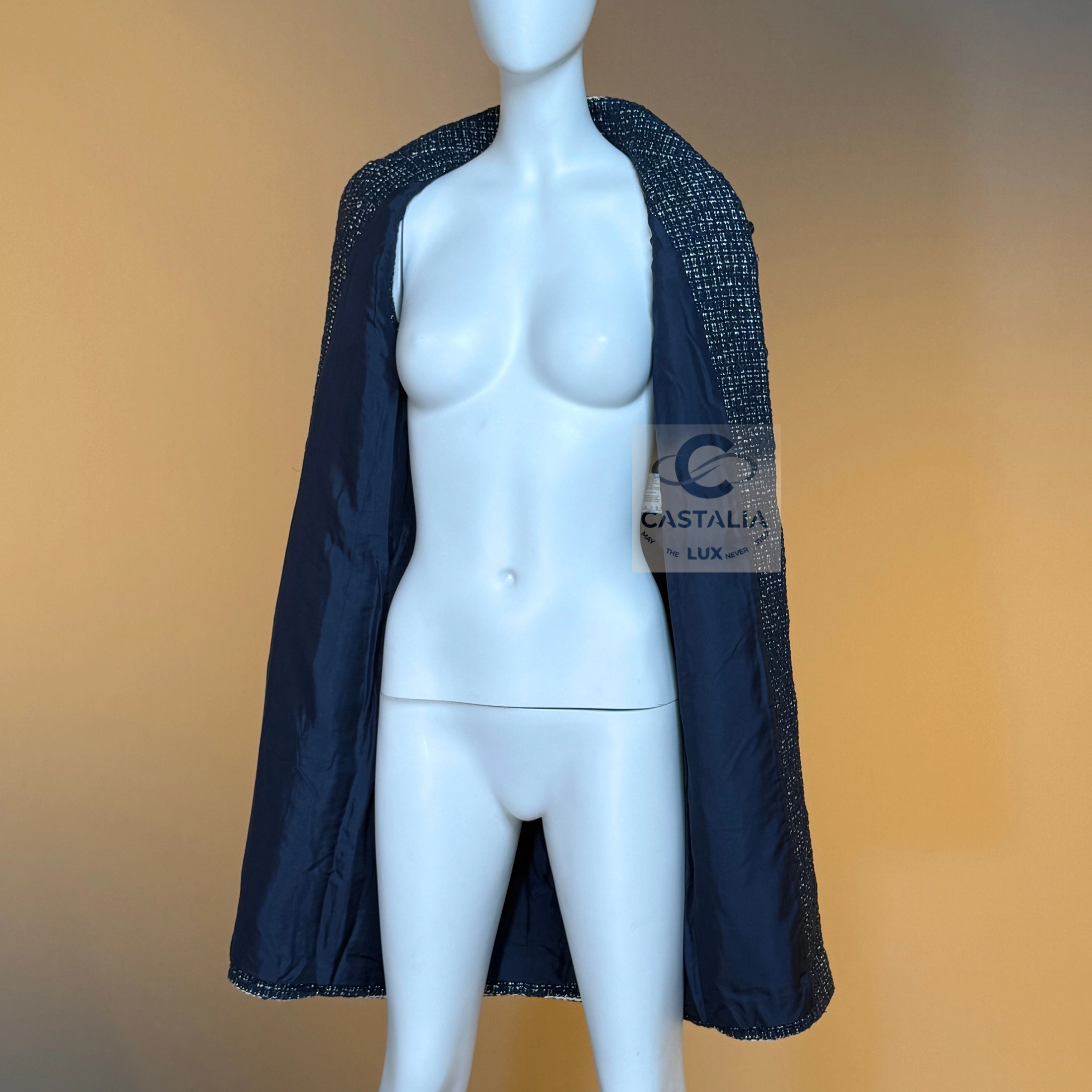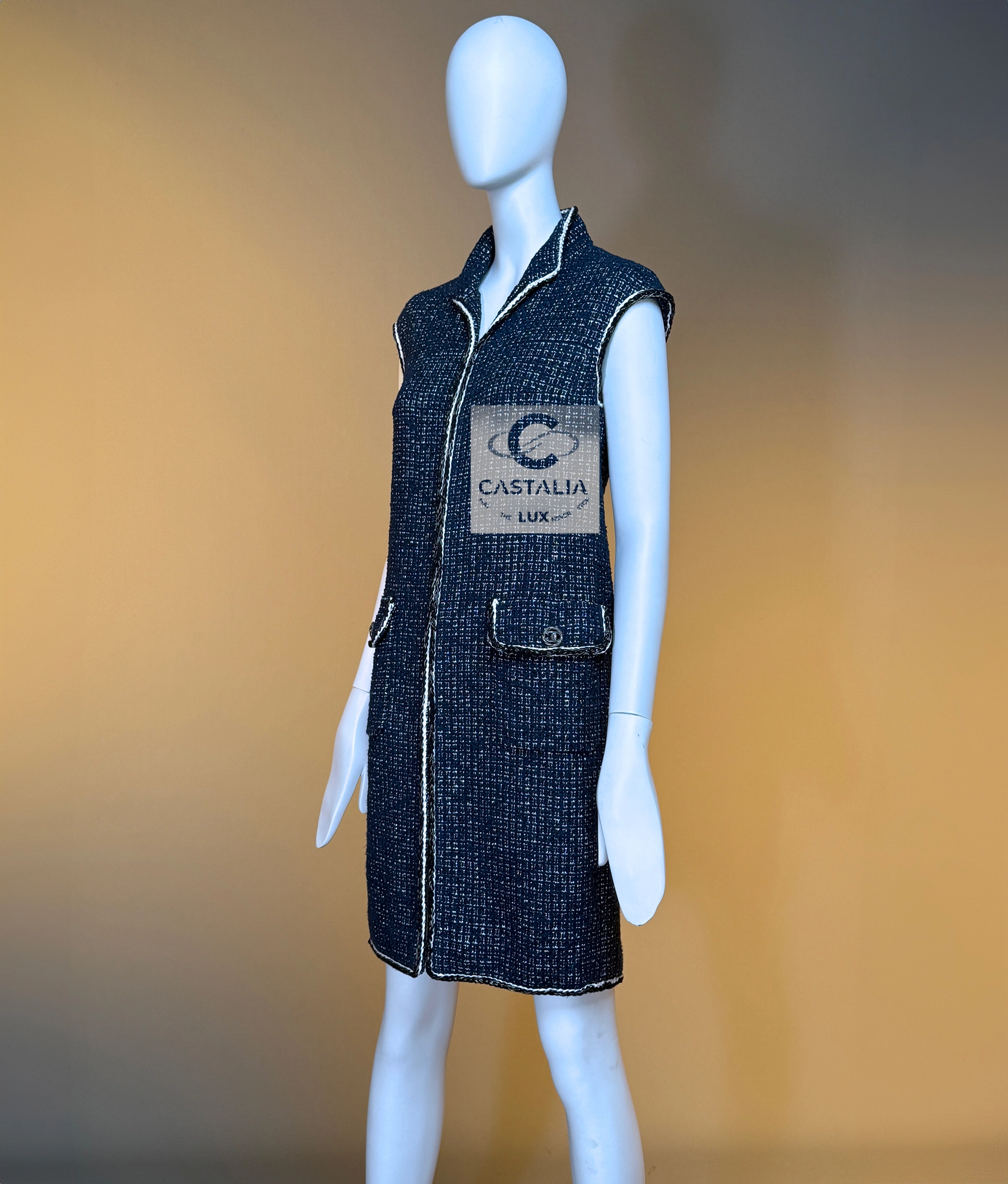 ~This CHANEL sleeveless jacket vest, cut in the Maison’s most precious Lesage tweed, weaves deep navy with elusive threads of gold and silver, catching illumination as if the fabric itself remembers the shimmer of twilight horizons // Size mark 34 FR / Condition: never worn // — silhouette is long and refining, a vertical axis traced by the maison’s signature braided trims, each line a subtle proclamation of heritage — Two front patch pockets, each crowned with a CC logo button, serve not merely as function but as the seal of couture authority — Beneath the surface, a tonal silk lining glides against the skin—an invisible luxury for the wearer alone — closes with a concealed hook-and-eye, a gesture of discretion that lets the shimmer breathe without interruption