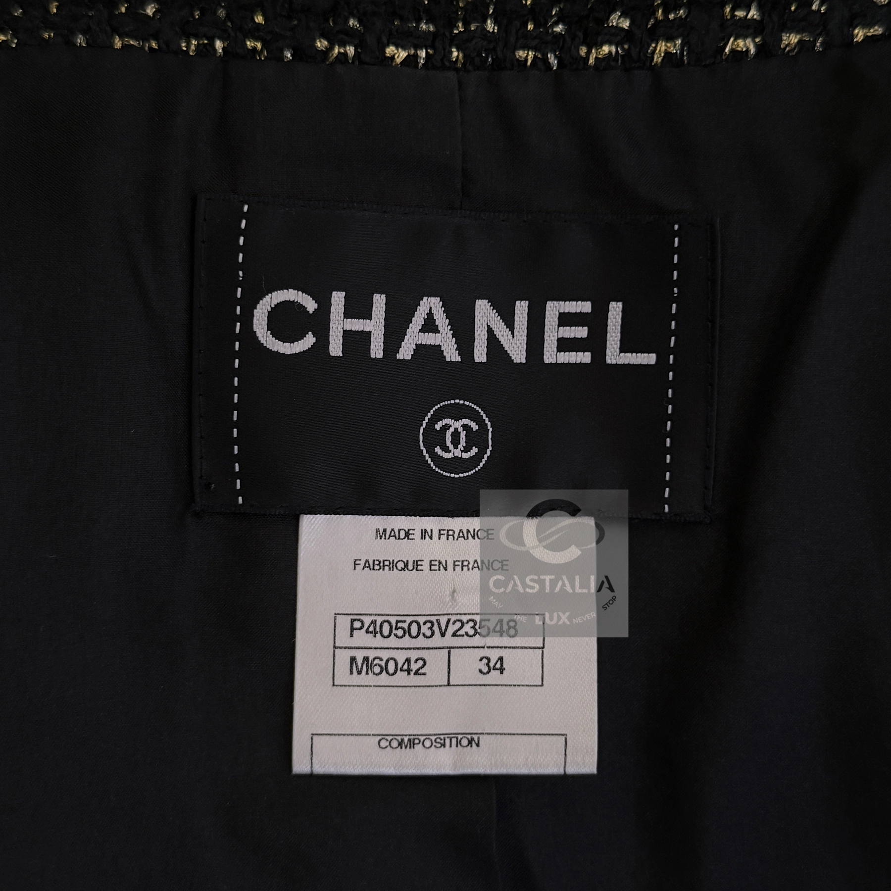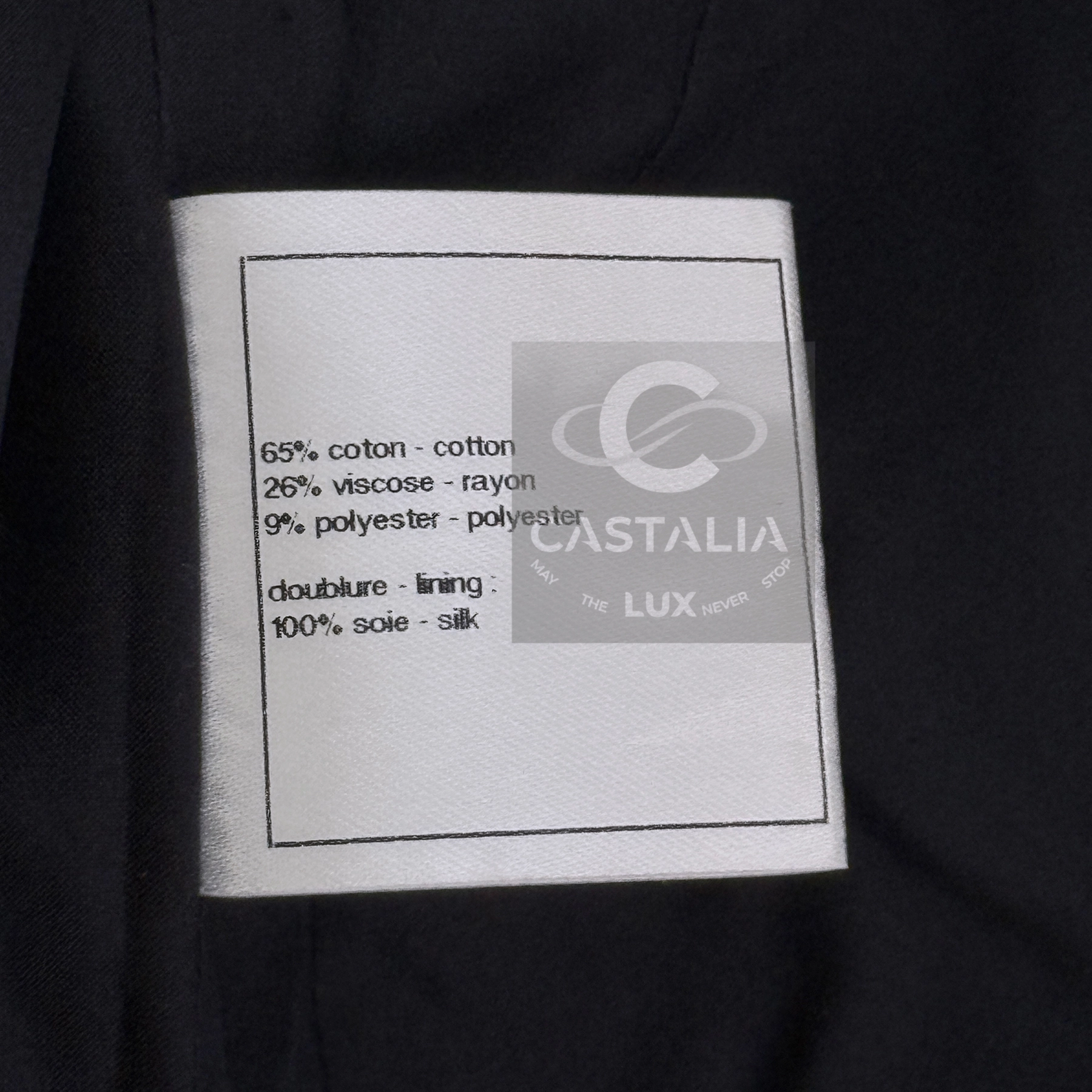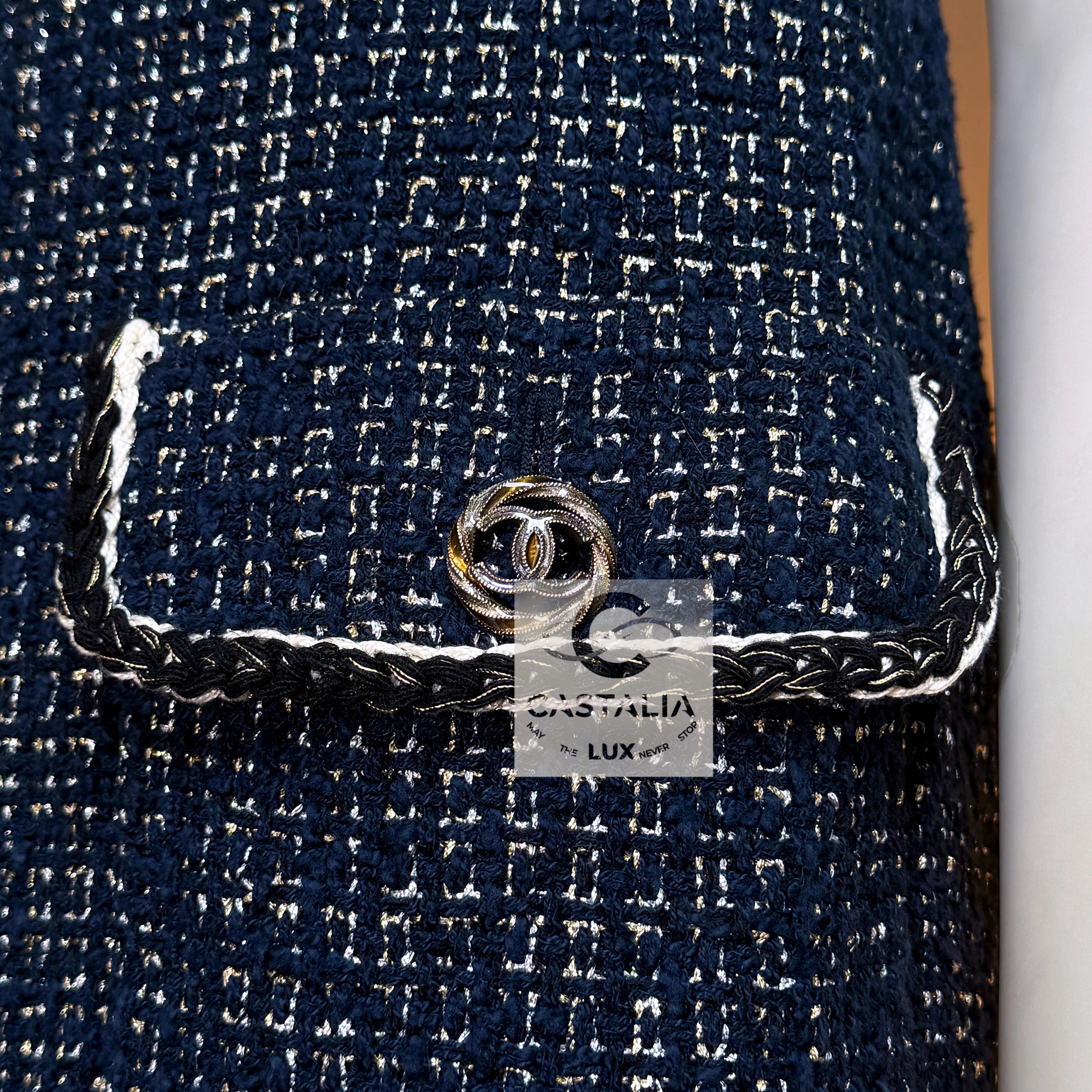 — Two front patch pockets, each crowned with a CC logo button, serve not merely as function but as the seal of couture authority