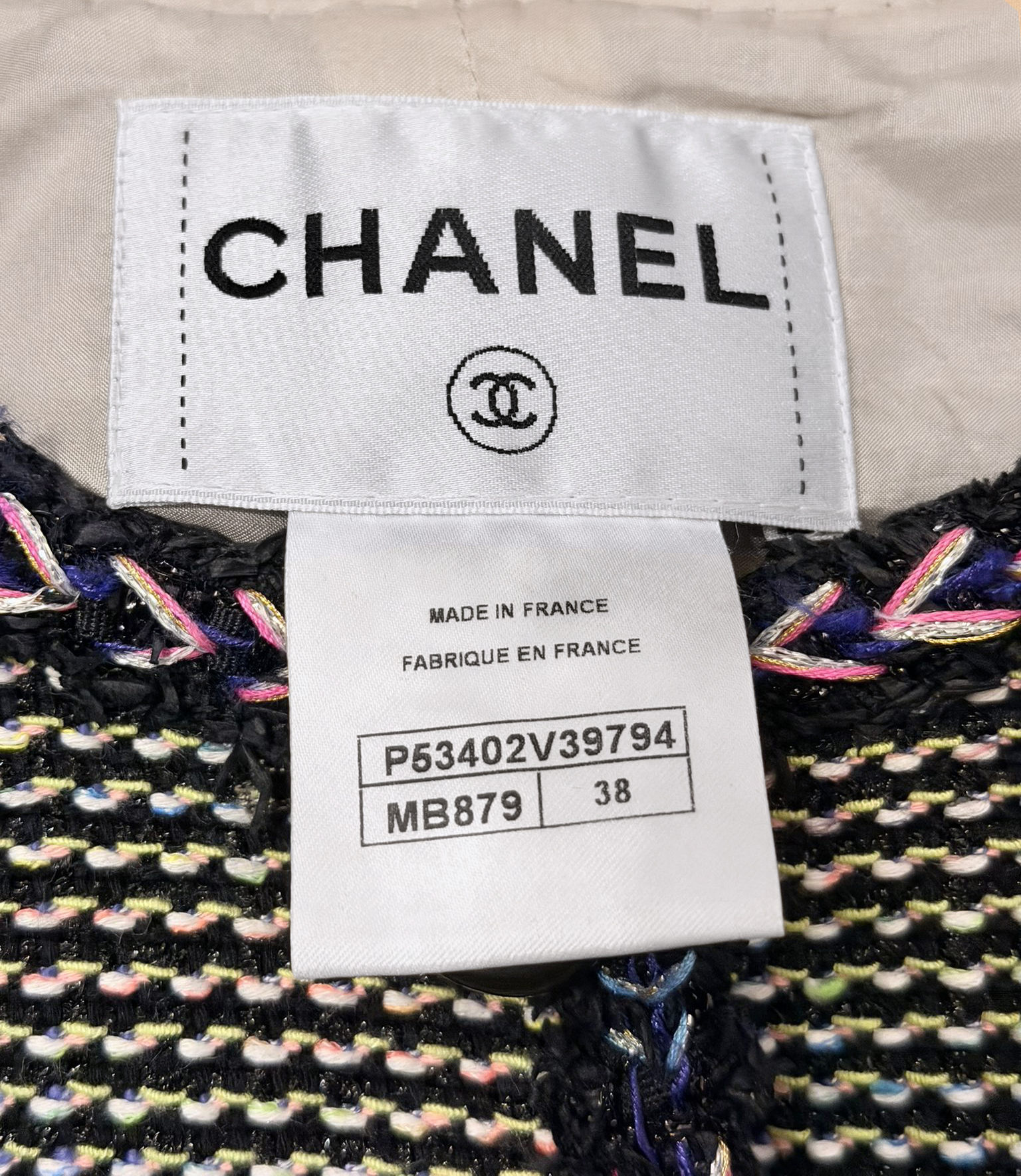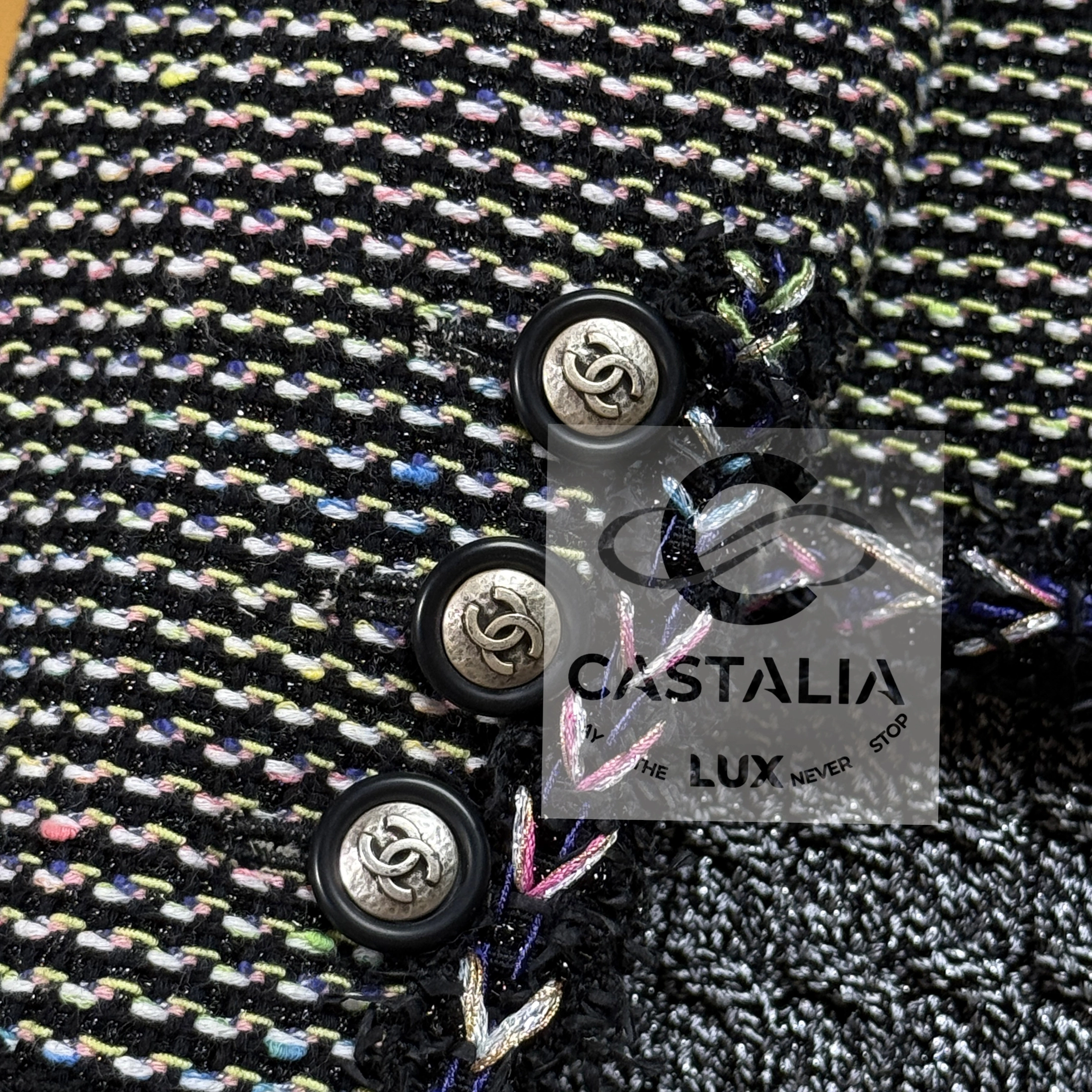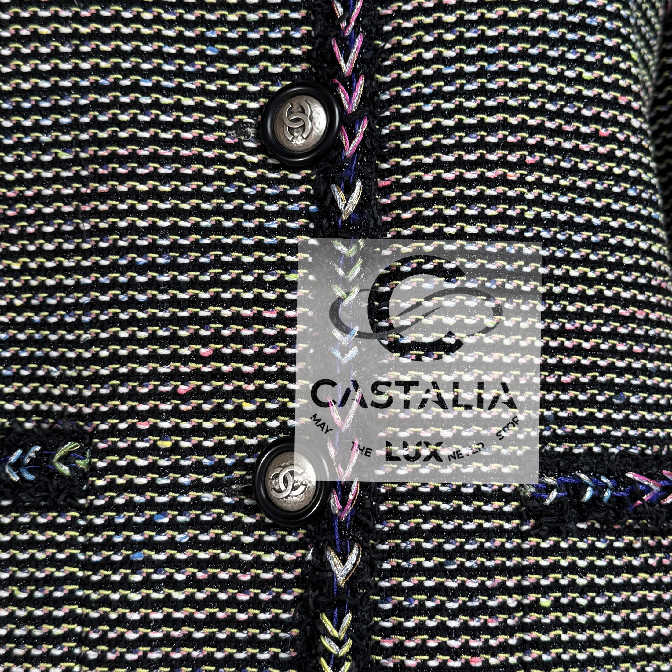 CHANEL Iridescent Black Lesage Tweed Jacket — As seen on Kristen Stewart and on the covers of leading magazines — A jacket that is more than attire: it is a relic of Chanel’s eternal grammar, a garment where shimmer becomes language // Size mark 38 FR / Condition: never worn // • Woven by Lesage in shimmering black tweed, interlaced with rainbow iridescence, it carries the aura of a night sky ignited with hidden constellations • Every detail is a testament to couture devotion: metallic hand-woven trim glimmers like threads of starlight • CC logo silver-tone buttons crown the front, cuffs, and epaulettes like miniature seals of power • Inside, the tonal silk lining and signature chain link complete the piece with the unseen gravity of tradition