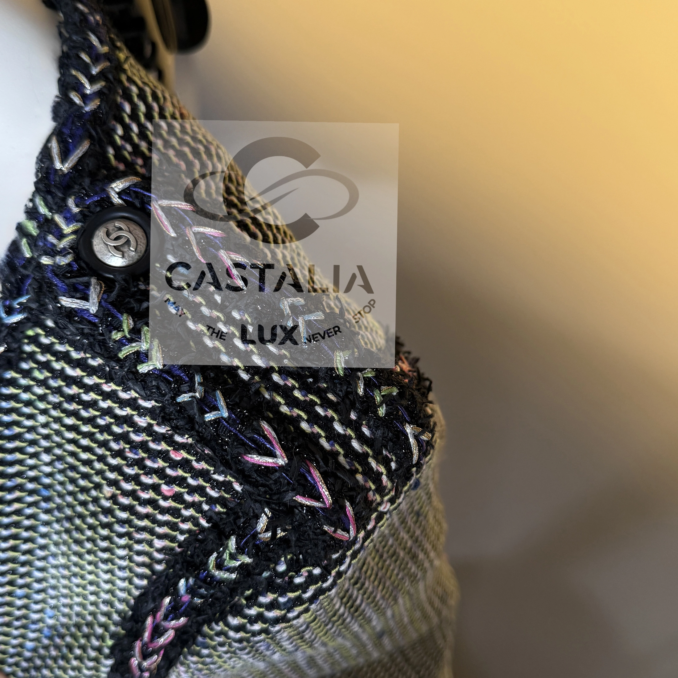 — Woven by Lesage in shimmering black tweed, interlaced with rainbow iridescence, it carries the aura of a night sky ignited with hidden constellations