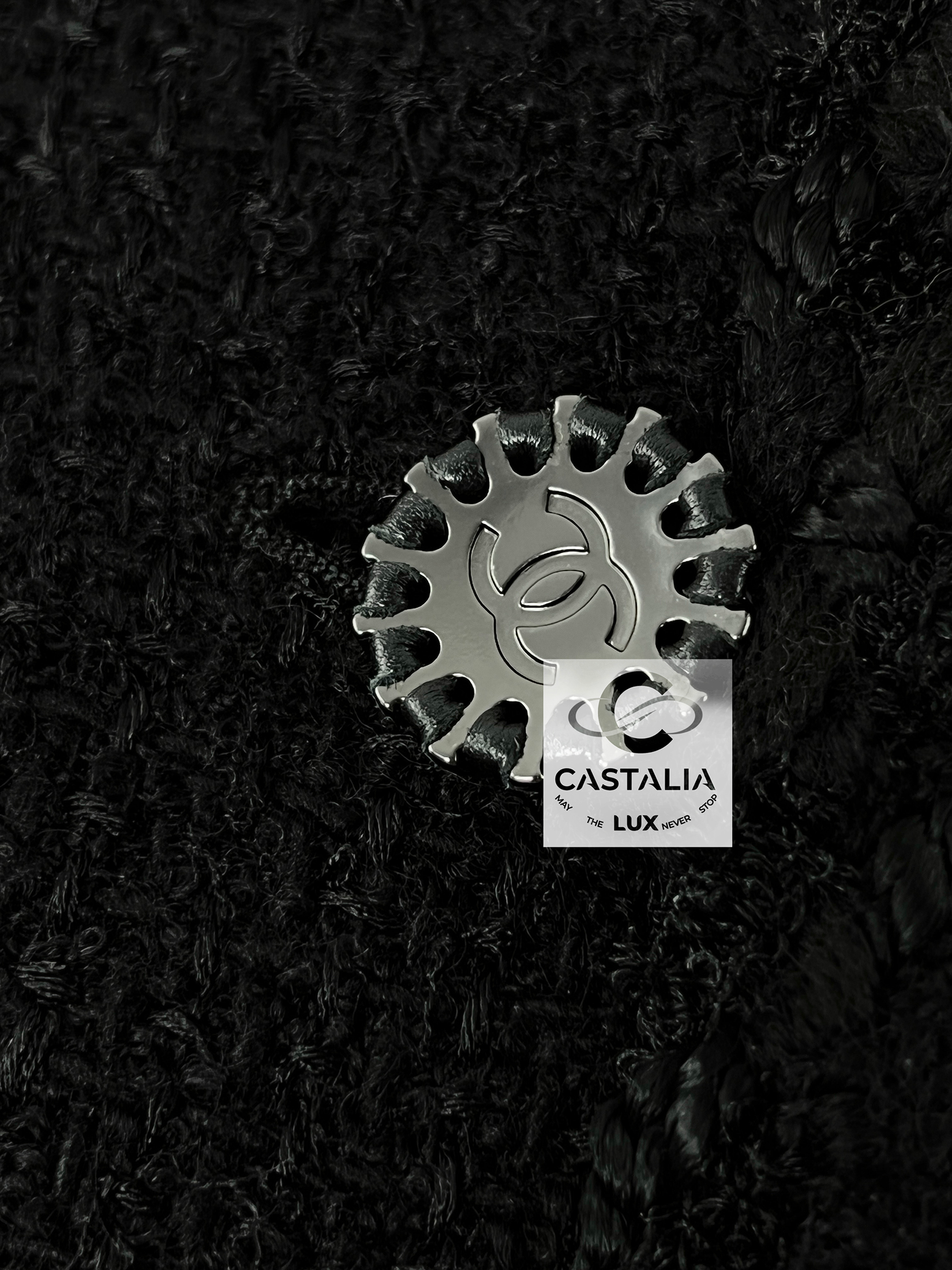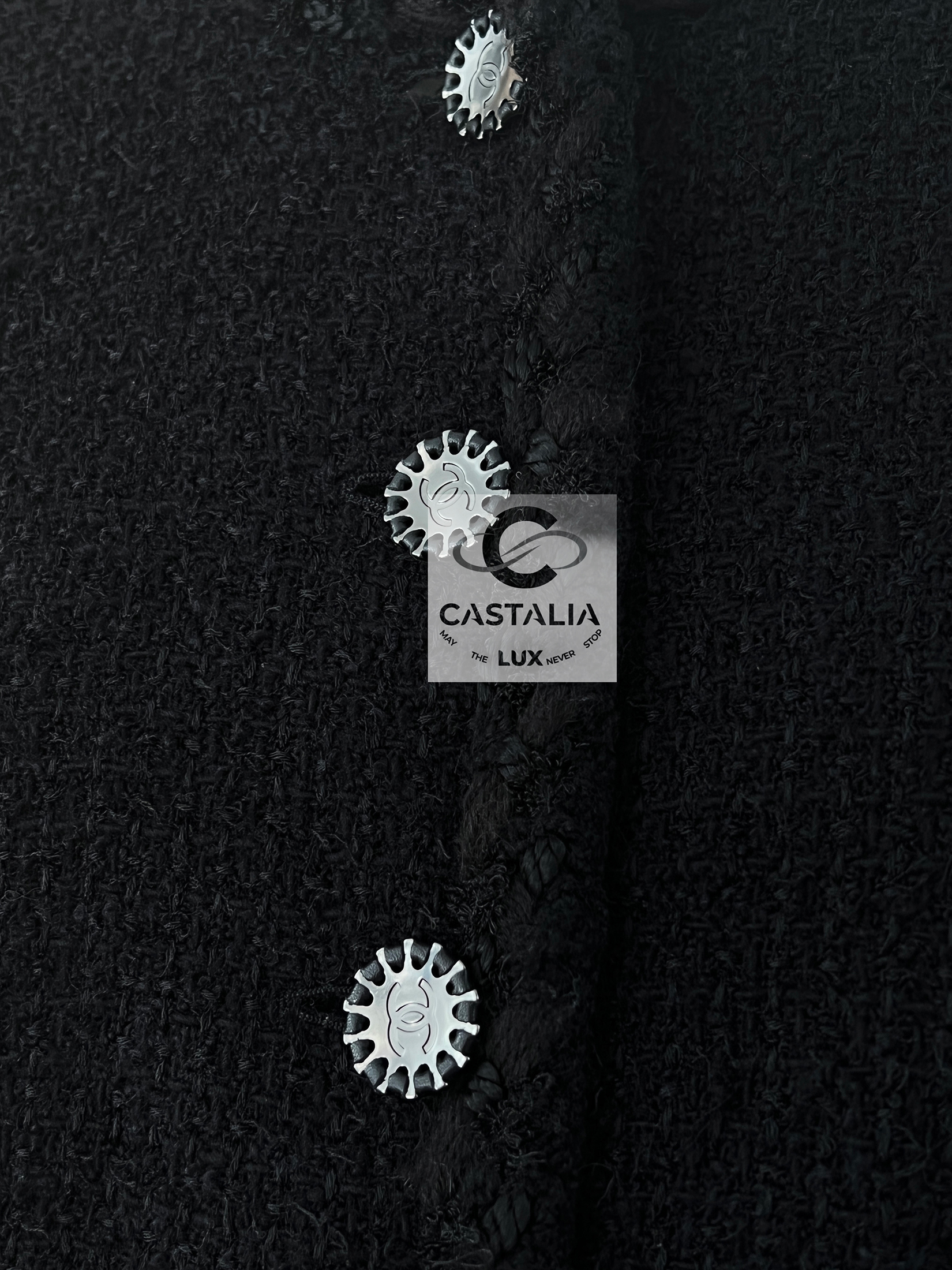 — front is adorned with signature silver-tone CC logo buttons—sunburst medallions that gleam with quiet grandeur. Each button anchors the jacket in Chanel’s lexicon of eternal codes.