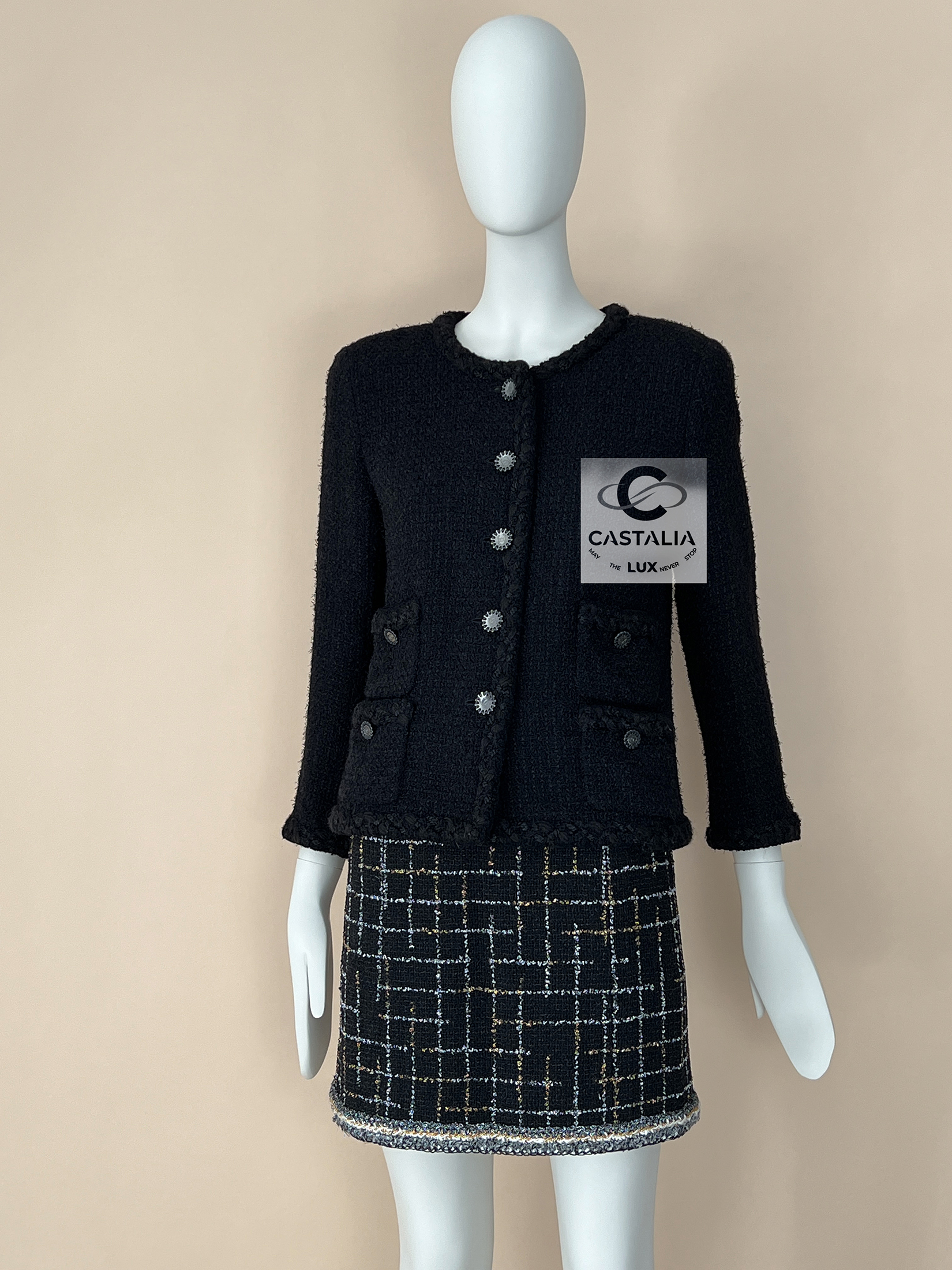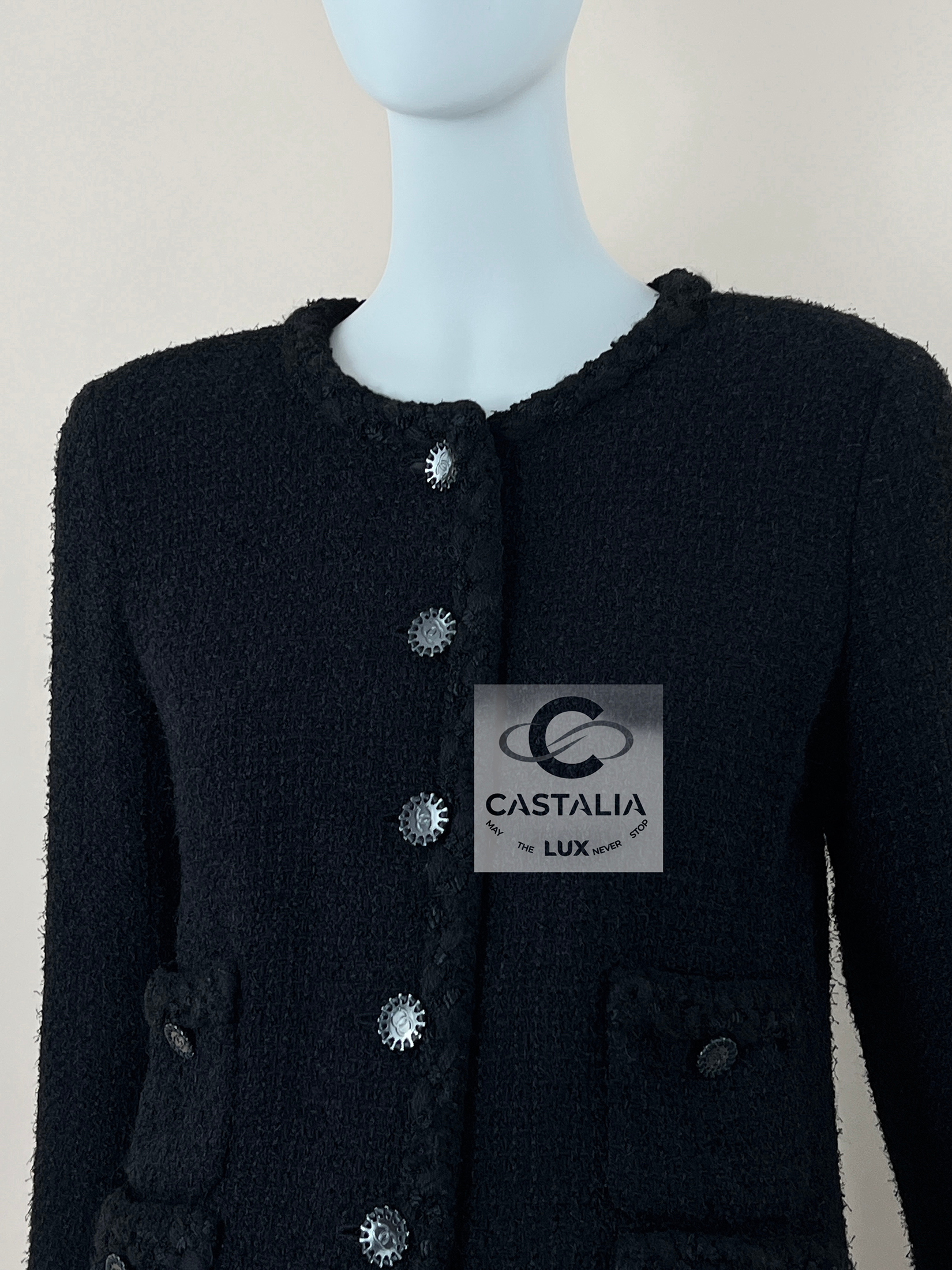 CHANEL – The Ultimate Little Black Jacket — The Icon of Icons. — ~ A garment that made history—and still shapes it. This is not just a jacket. This is the jacket. ~ The most iconic, most coveted, and most referenced black tweed jacket in the history of Chanel — little black jacket from 2011 Cruise Collection ~ Immortalized in the landmark book The Little Black Jacket by Karl Lagerfeld and Carine Roitfeld, this exact model has graced the shoulders of cultural titans—from Pharrell Williams to global tastemakers—becoming a symbol of timeless power and creative rebellion // Size mark 36 FR / Condition: never worn // — Crafted in jet-black Lesage tweed with a sublime hand, its structure is unmistakable: the four-pocket silhouette that changed fashion forever — Trimmed with tonal woven braid and discreet leather, every edge whispers restraint, discipline, and perfection — front is adorned with signature silver-tone CC logo buttons—sunburst medallions that gleam with quiet grandeur. Each button anchors the jacket in Chanel’s lexicon of eternal codes. An artifact of high fashion history. A masterpiece of modernity. The jacket that continues to rewrite the rules.