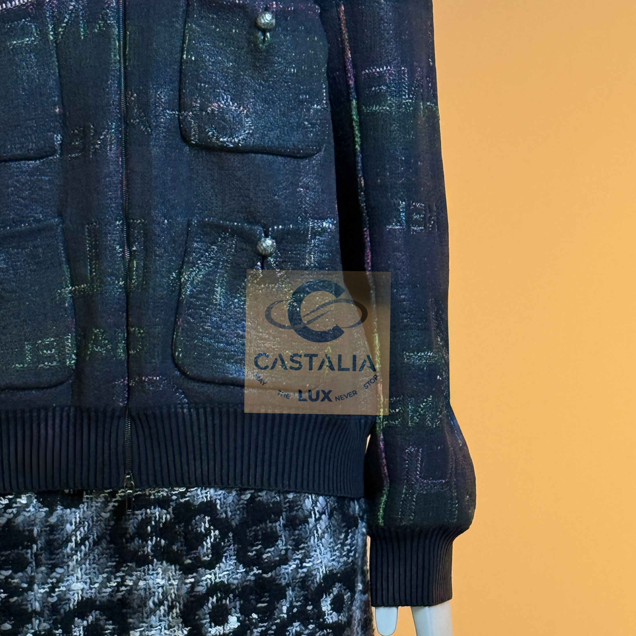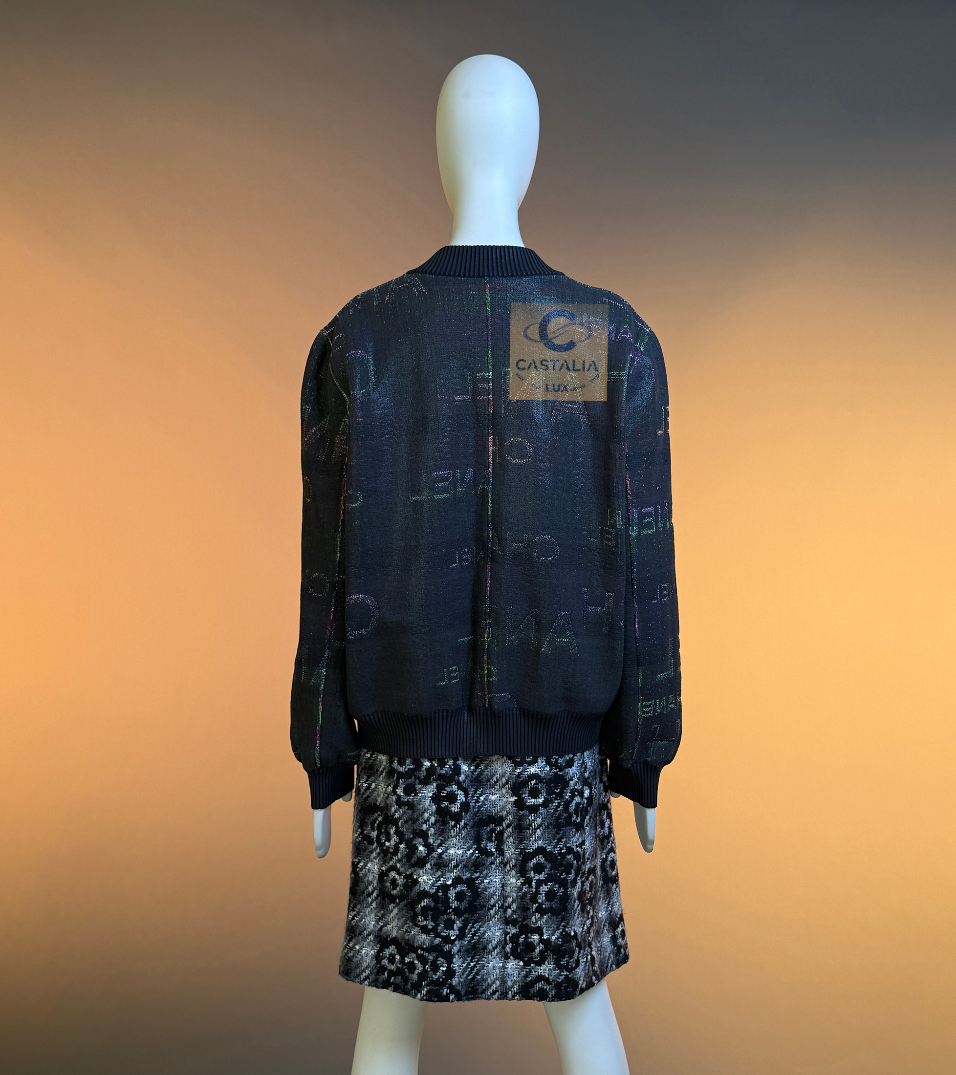 — A modern Chanel bomber that reads like the house name turned into fabric — logo lettering dispersed across a nocturne, subtly iridescent surface, as if the brand’s language has been woven into the night itself
