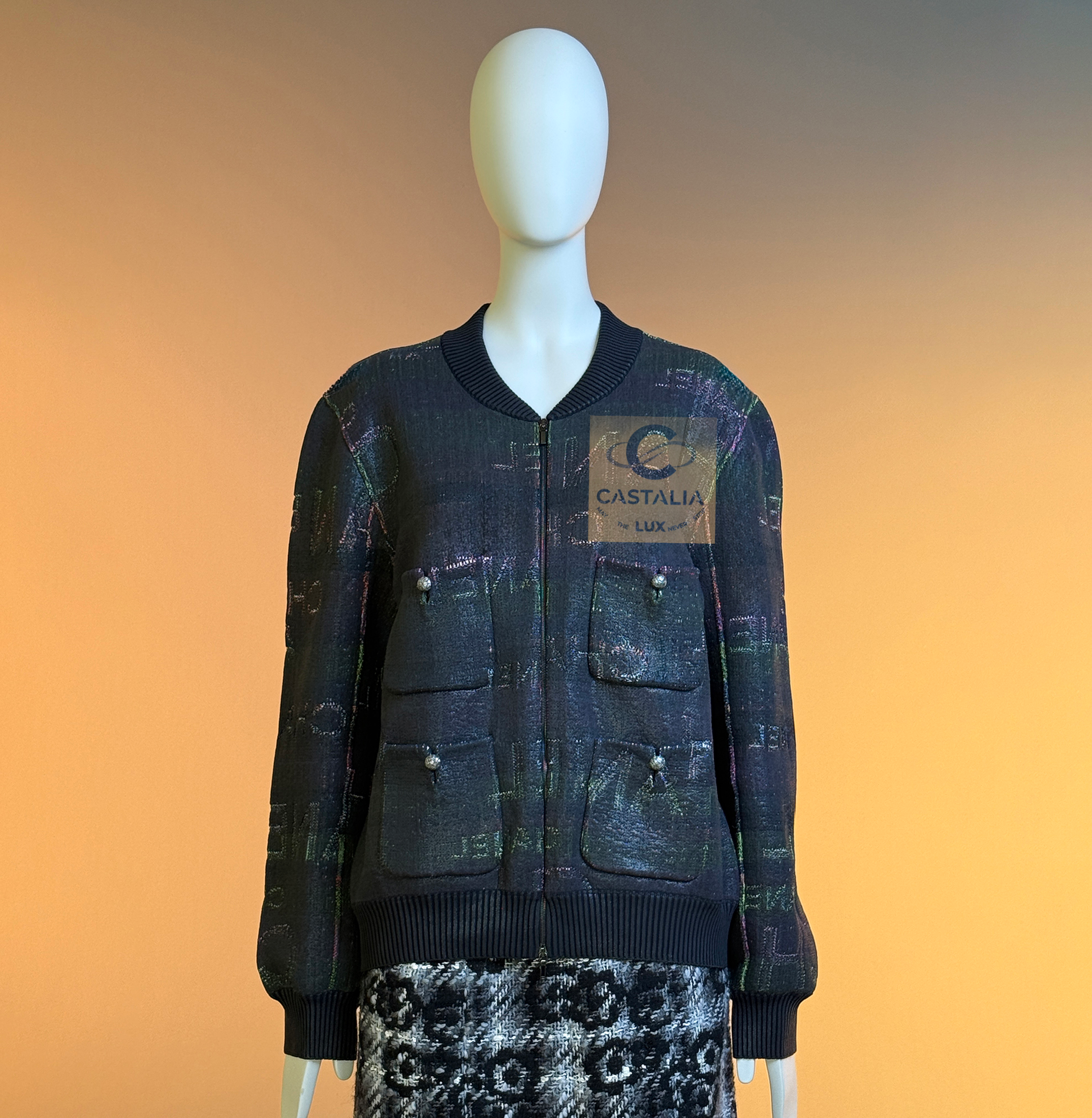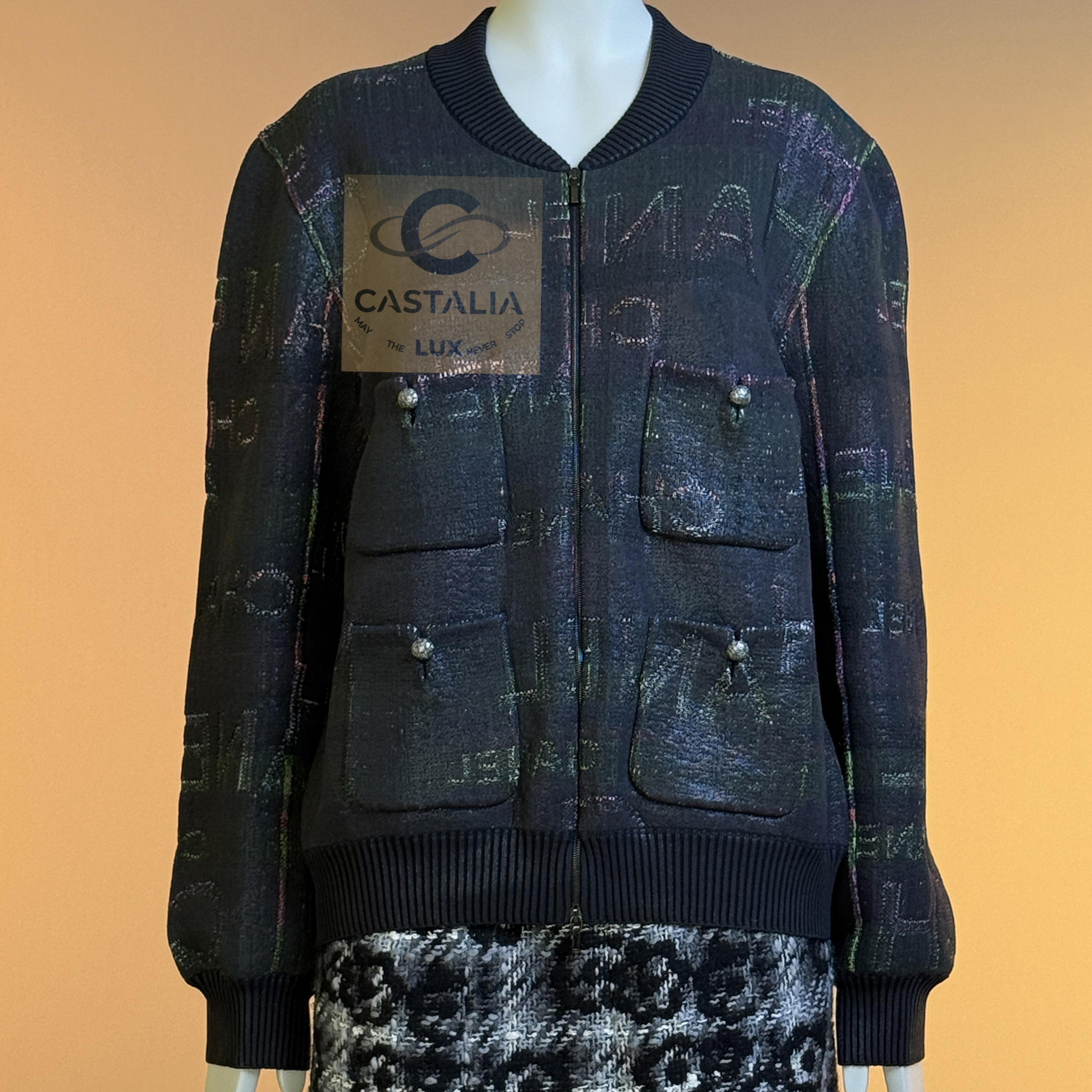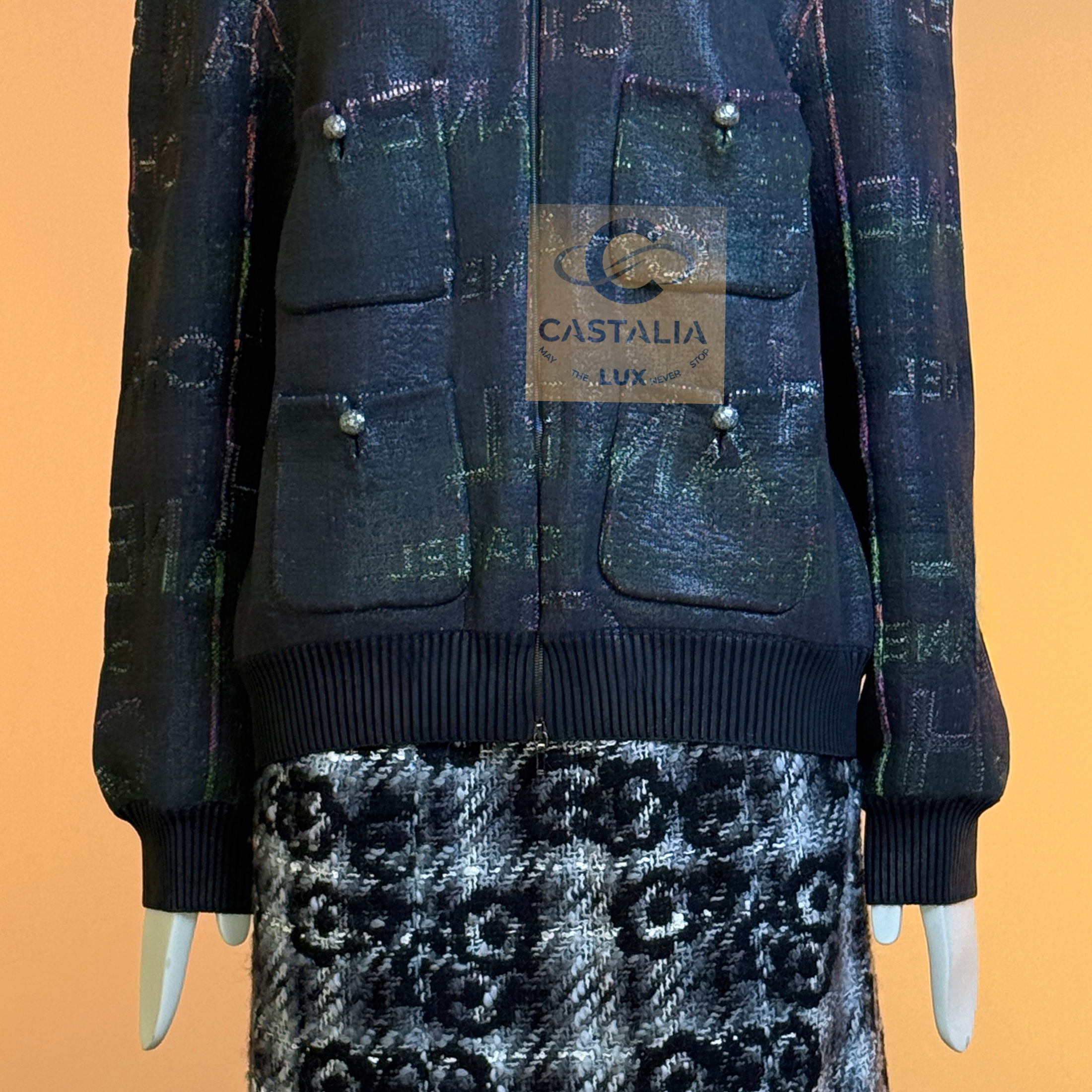 CHANEL · Logo Lettering Shimmer Bomber Jacket with CC Buttons — A modern Chanel bomber that reads like the house name turned into fabric — logo lettering dispersed across a nocturne, subtly iridescent surface, as if the brand’s language has been woven into the night itself — This is not a casual jacket; it’s a contemporary relic: sport silhouette, couture codes, and unmistakable Chanel syntax fused into one object. // Size mark 50 FR (may fit smaller sizes) / Condition: never worn // • Crafted from an intricate textile finished with a subtle shimmer coating — the surface catches light in quiet pulses, never glossy, always refined • The CHANEL logo lettering appears all over like a palimpsest: readable in certain angles, hidden in others, creating a constellation effect across the black ground. — House Codes · The Four-Pocket Canon — • The iconic four patch pockets give the front its institutional architecture — the same Chanel façade that collectors recognize instantly, translated here into a bomber register • CC logo buttons at the pockets act as miniature seals, confirming provenance at the points of touch • Front fastening with a logo zipper — clean, architectural punctuation that aligns with the bomber’s utilitarian lineage while staying strictly Chanel. — Silhouette · Casual Lounge, Elevated — • Ribbed collar, cuffs, and hem create the true bomber-style structure — relaxed but disciplined, designed to sit with effortless authority and move with ease.