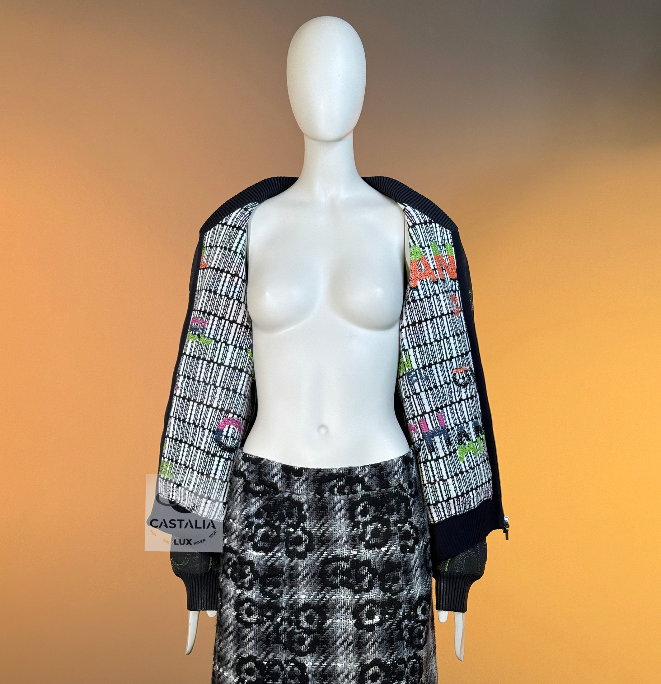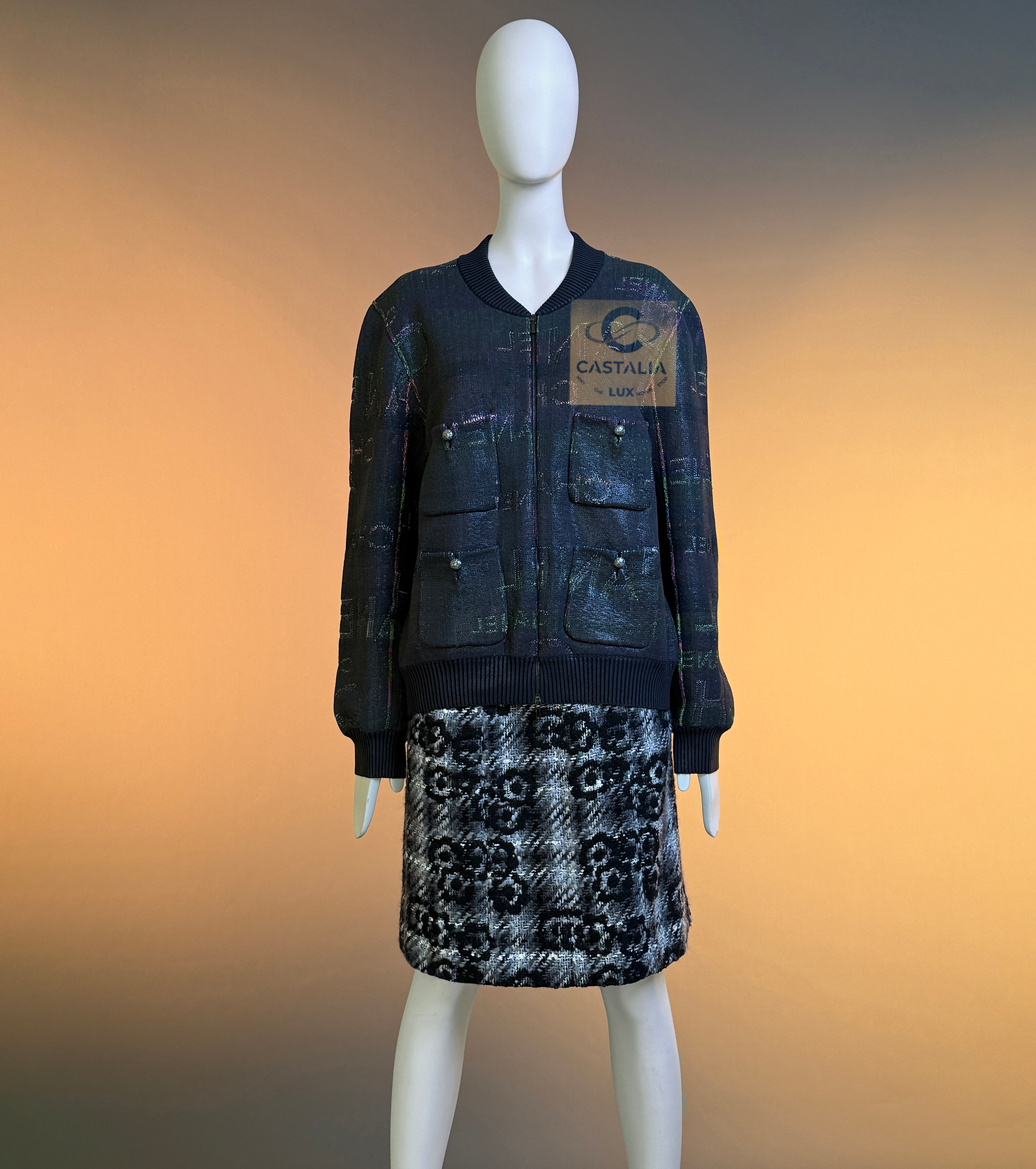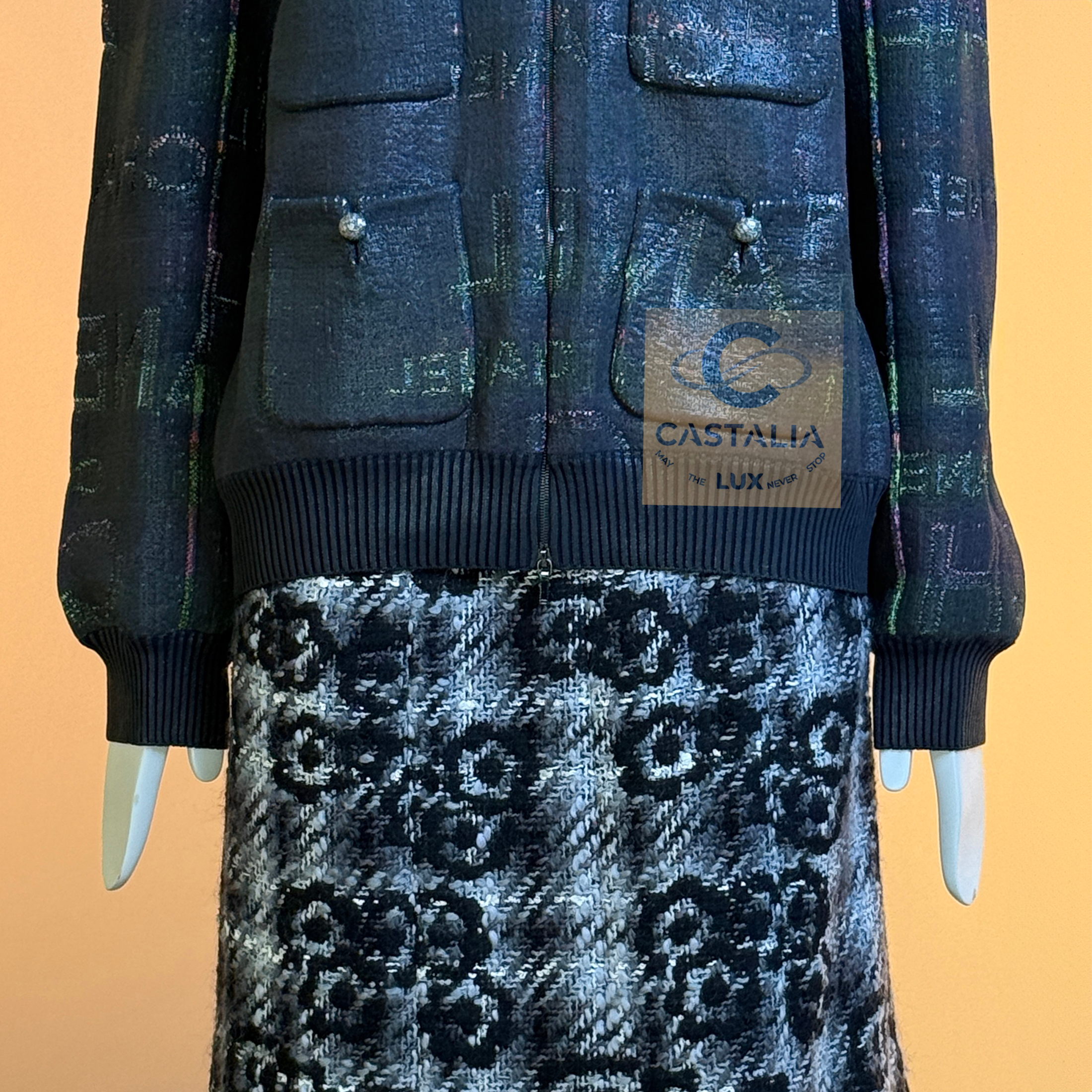 CHANEL · Logo Lettering Shimmer Bomber Jacket with CC Buttons — A modern Chanel bomber that reads like the house name turned into fabric — logo lettering dispersed across a nocturne, subtly iridescent surface, as if the brand’s language has been woven into the night itself — This is not a casual jacket; it’s a contemporary relic: sport silhouette, couture codes, and unmistakable Chanel syntax fused into one object. // Size mark 50 FR (may fit smaller sizes) / Condition: never worn // • Crafted from an intricate textile finished with a subtle shimmer coating — the surface catches light in quiet pulses, never glossy, always refined • The CHANEL logo lettering appears all over like a palimpsest: readable in certain angles, hidden in others, creating a constellation effect across the black ground. — House Codes · The Four-Pocket Canon — • The iconic four patch pockets give the front its institutional architecture — the same Chanel façade that collectors recognize instantly, translated here into a bomber register • CC logo buttons at the pockets act as miniature seals, confirming provenance at the points of touch • Front fastening with a logo zipper — clean, architectural punctuation that aligns with the bomber’s utilitarian lineage while staying strictly Chanel. — Silhouette · Casual Lounge, Elevated — • Ribbed collar, cuffs, and hem create the true bomber-style structure — relaxed but disciplined, designed to sit with effortless authority and move with ease.