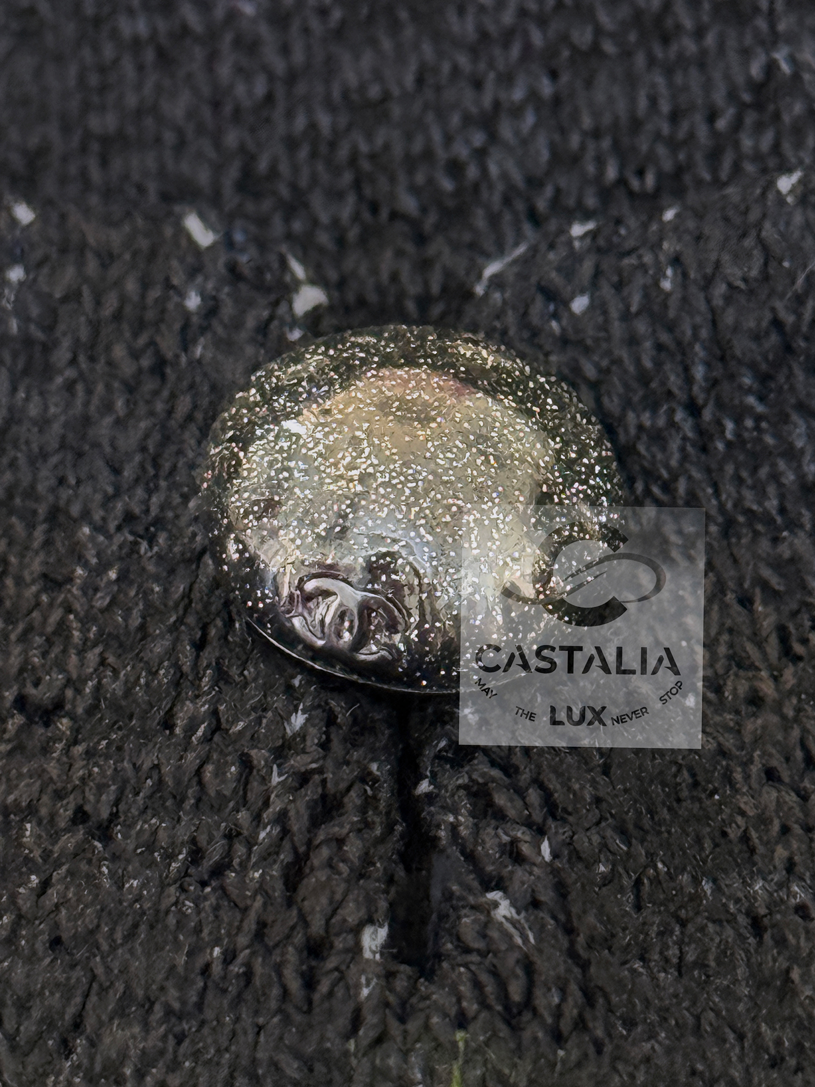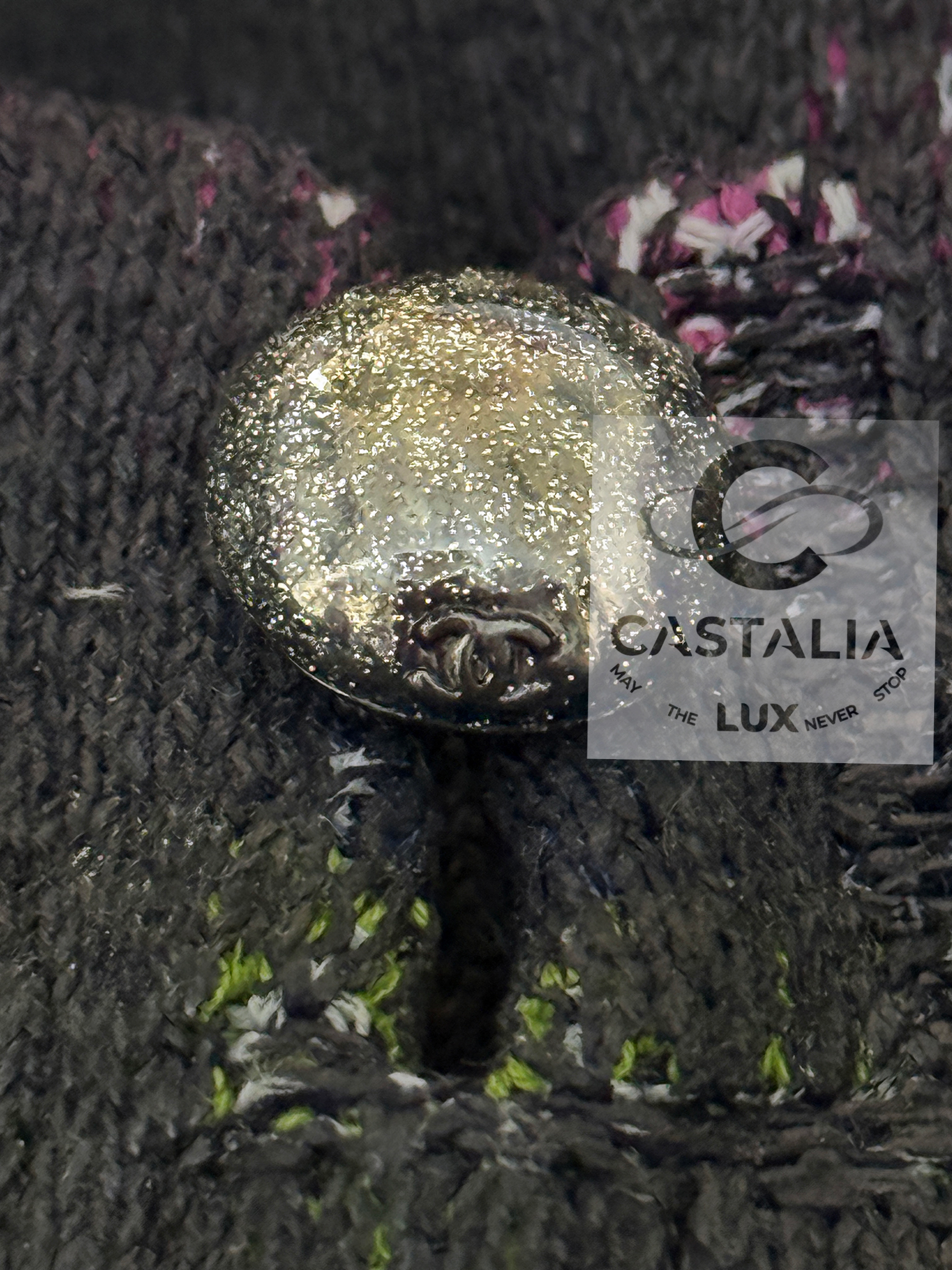 • The CHANEL logo lettering appears all over like a palimpsest: readable in certain angles, hidden in others, creating a constellation effect across the black ground.