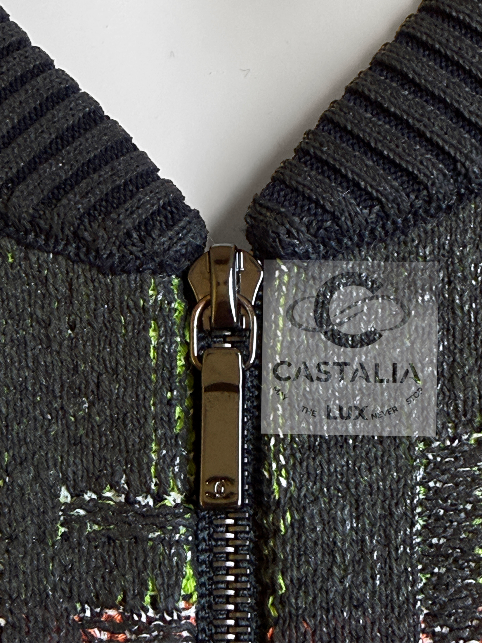 • Front fastening with a logo zipper — clean, architectural punctuation that aligns with the bomber’s utilitarian lineage while staying strictly Chanel.