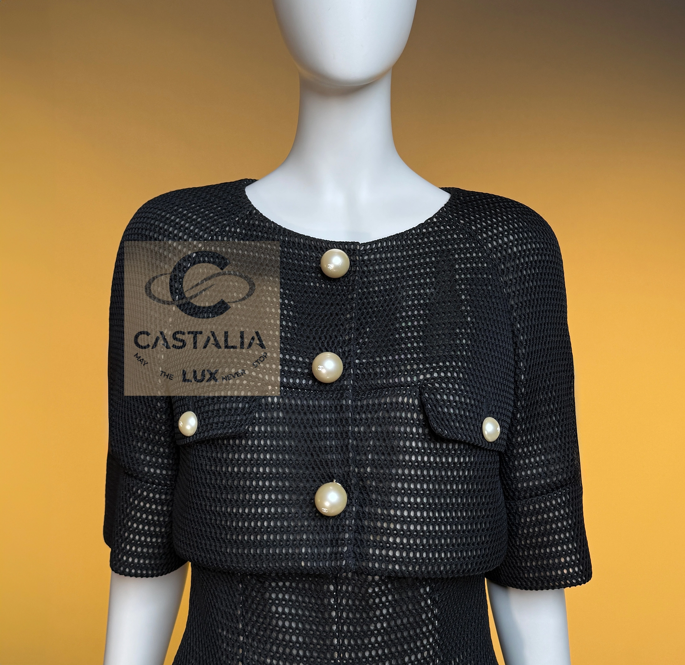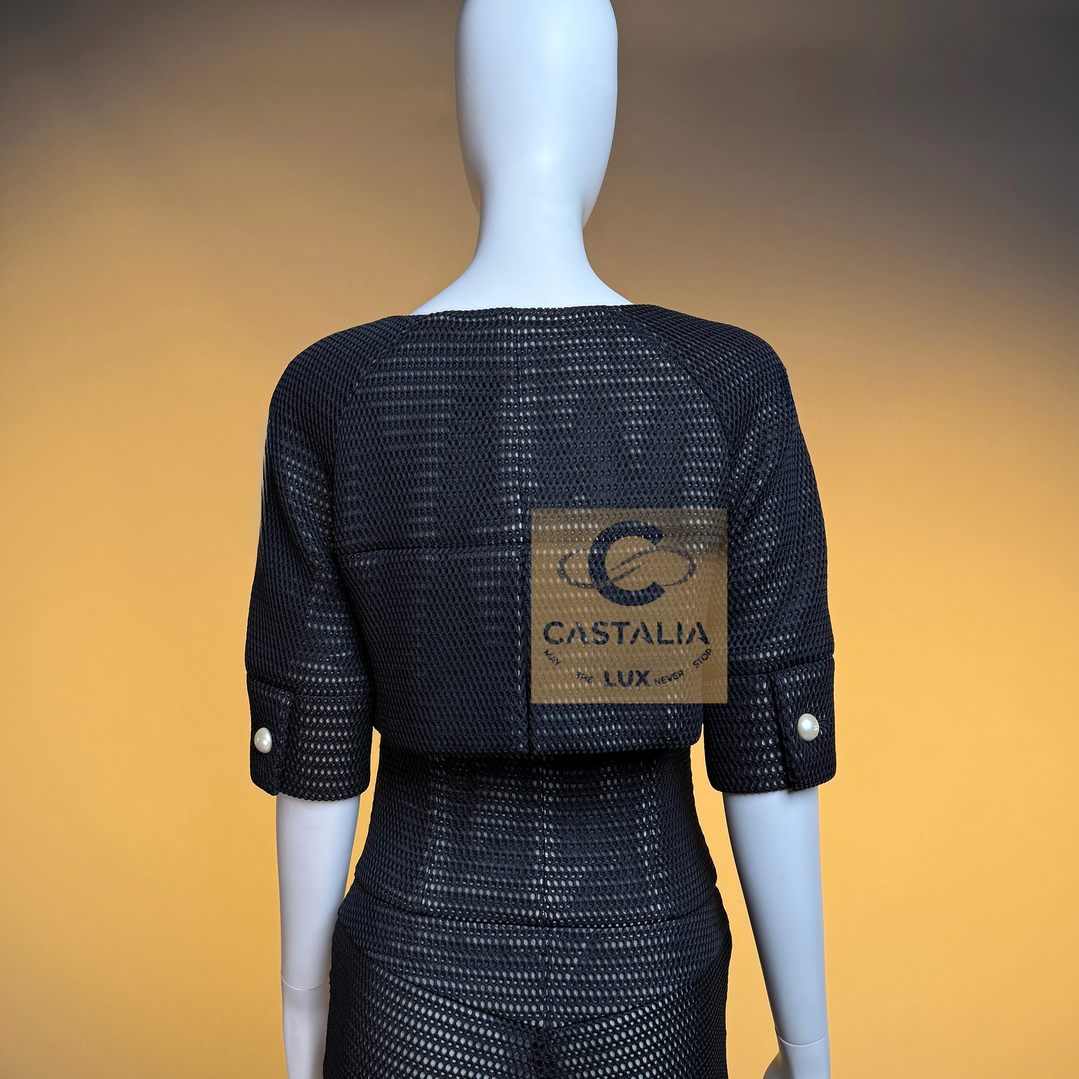 CHANEL Collectors Black Sheer Suit — Spring 2013 Collection by Karl Lagerfeld — As seen in Chanel’s official Ad campaign and captured on Miley Cyrus — ~ A rare apparition from the Spring 2013 campaign, this Chanel collector’s piece stands as one of Karl Lagerfeld’s most provocative couture gestures ~ A relic of Chanel’s mythology, it is at once wearable art and metaphysical theater: a shimmering paradox captured forever in the canon of couture. // Size mark 34 FR / Condition: never worn // — The ensemble consists of a cropped jacket layered over a fitted longline jacket, paired with high-waisted tailored pants — a silhouette that merges strict tailoring with sensual evanescence — Constructed of black, intricate sheer fabric, it reveals a nude lining beneath, conjuring the illusion of the body veiled in shadow and light — Embellished with massive pearl CC logo buttons, which gleam as surreal constellations against the transparency — Finished with a black silk lining and Chanel’s signature chain-link detail at the hem of the jacket, ensuring couture gravity even within weightlessness
