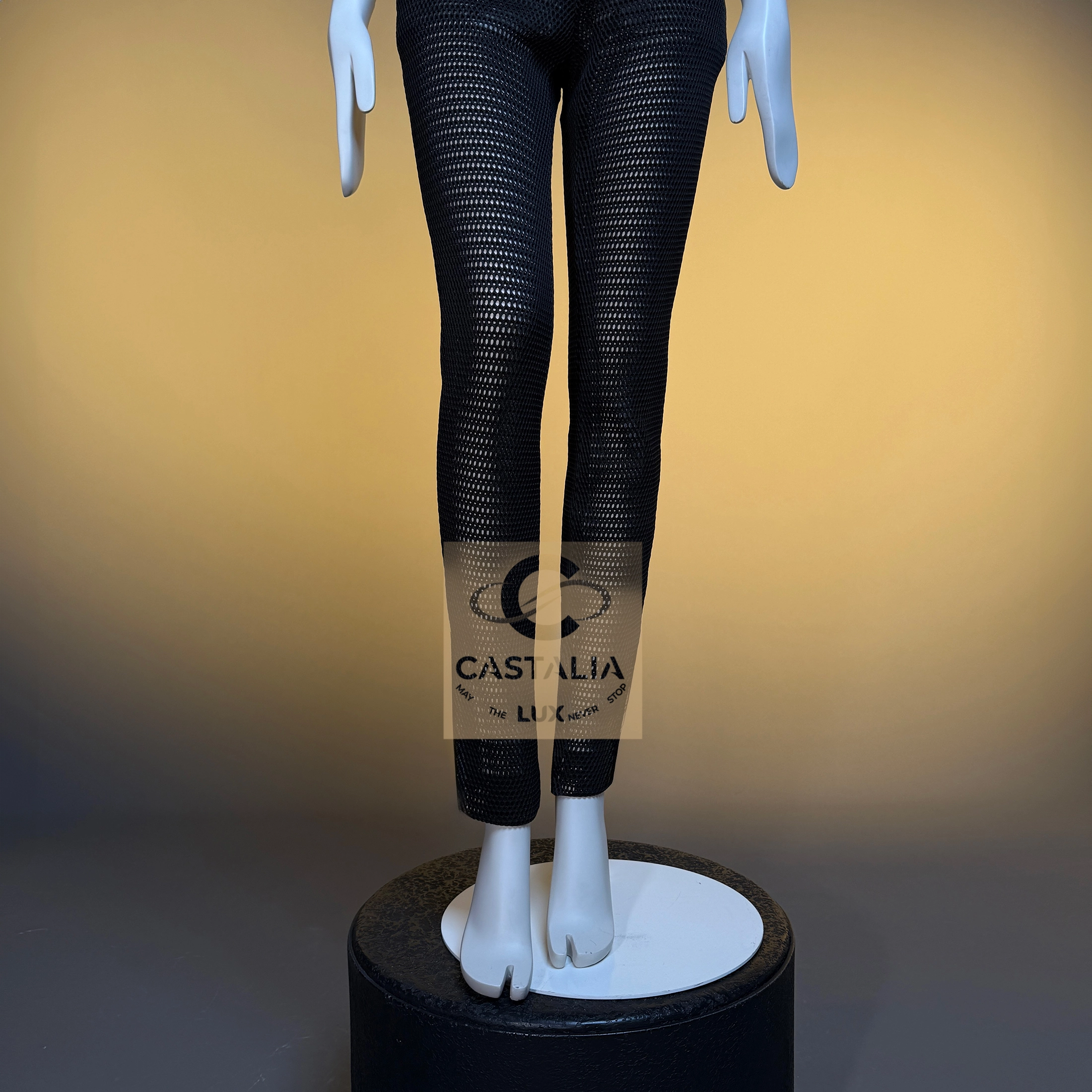— Constructed of black, intricate sheer fabric, it reveals a nude lining beneath, conjuring the illusion of the body veiled in shadow and light