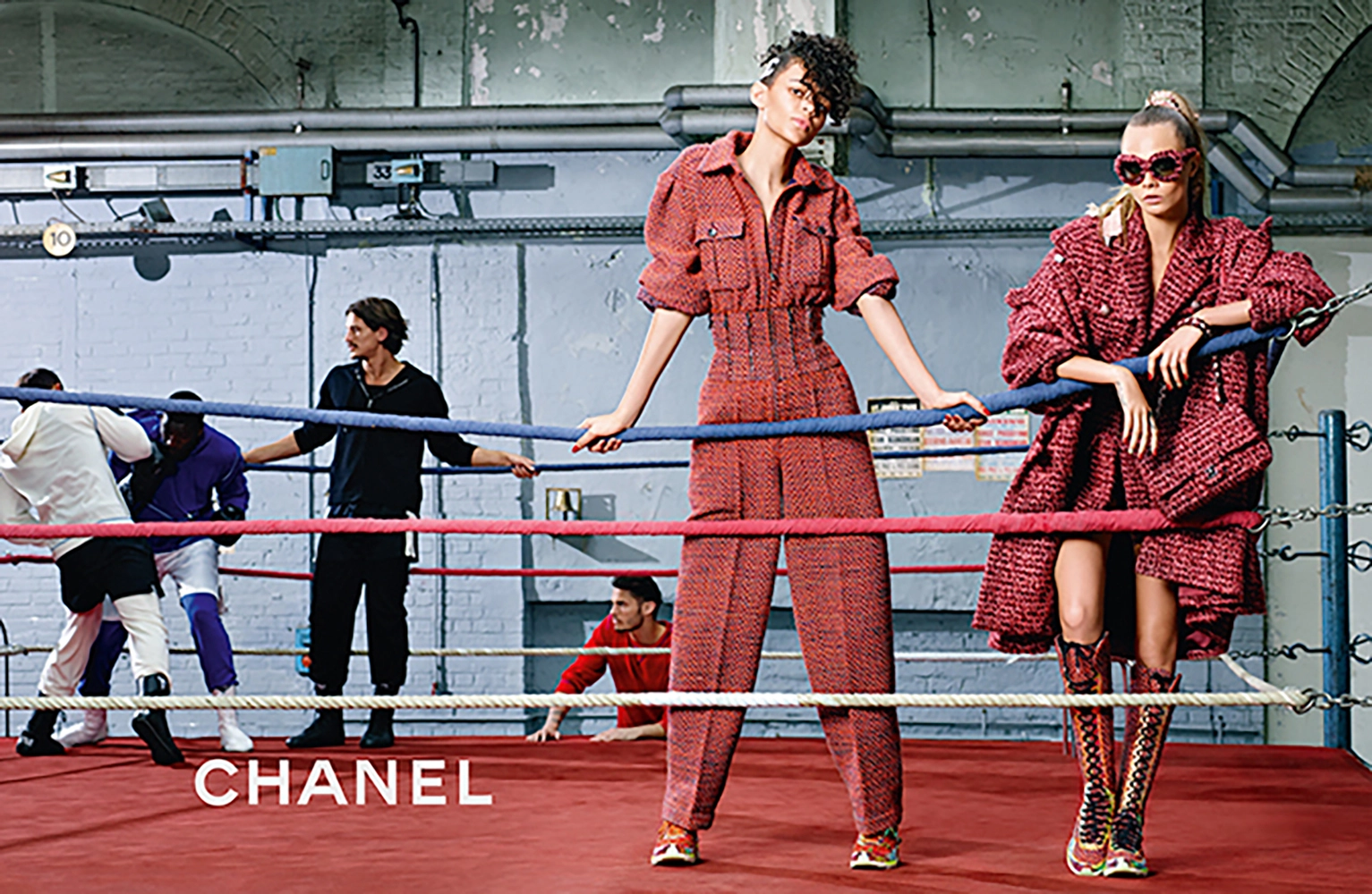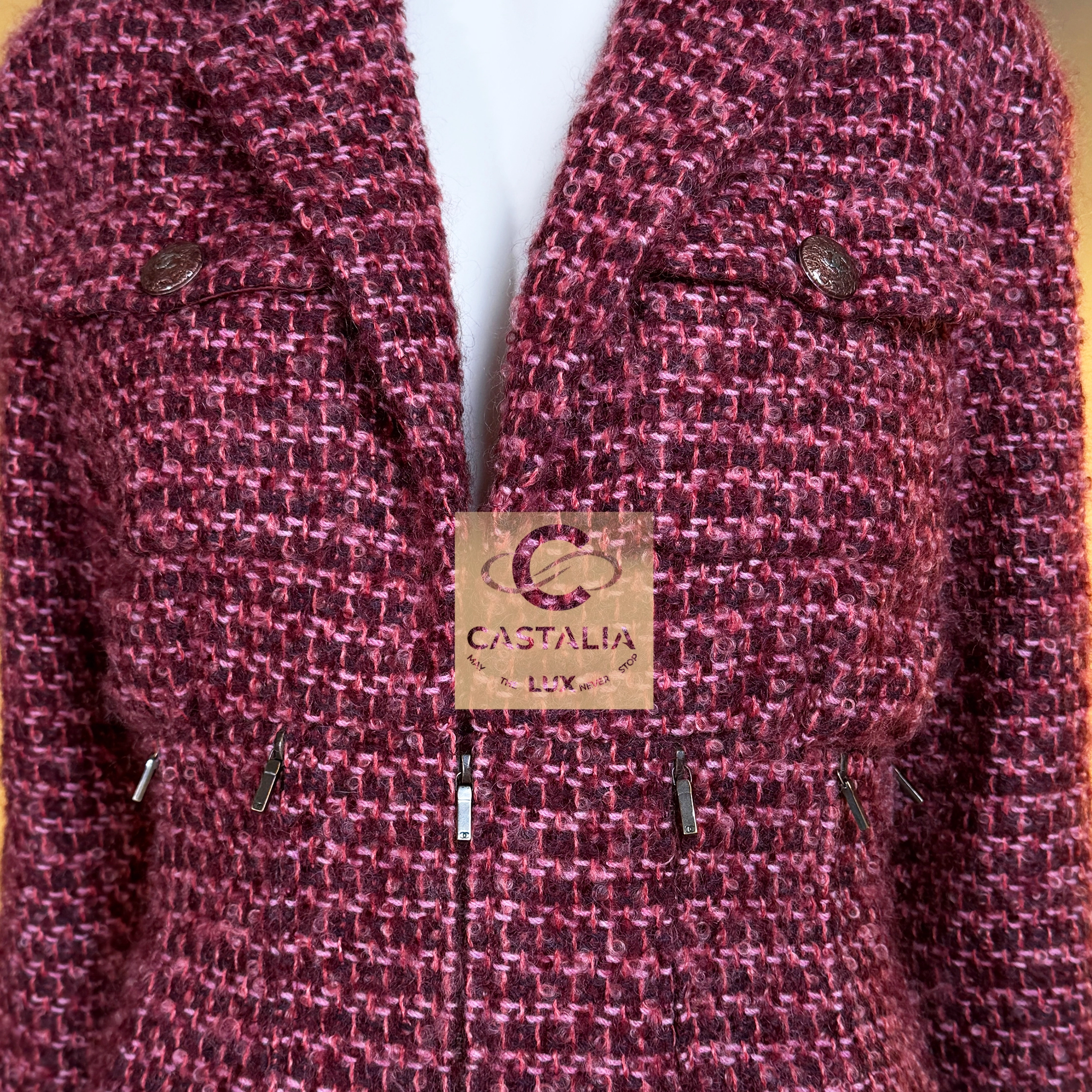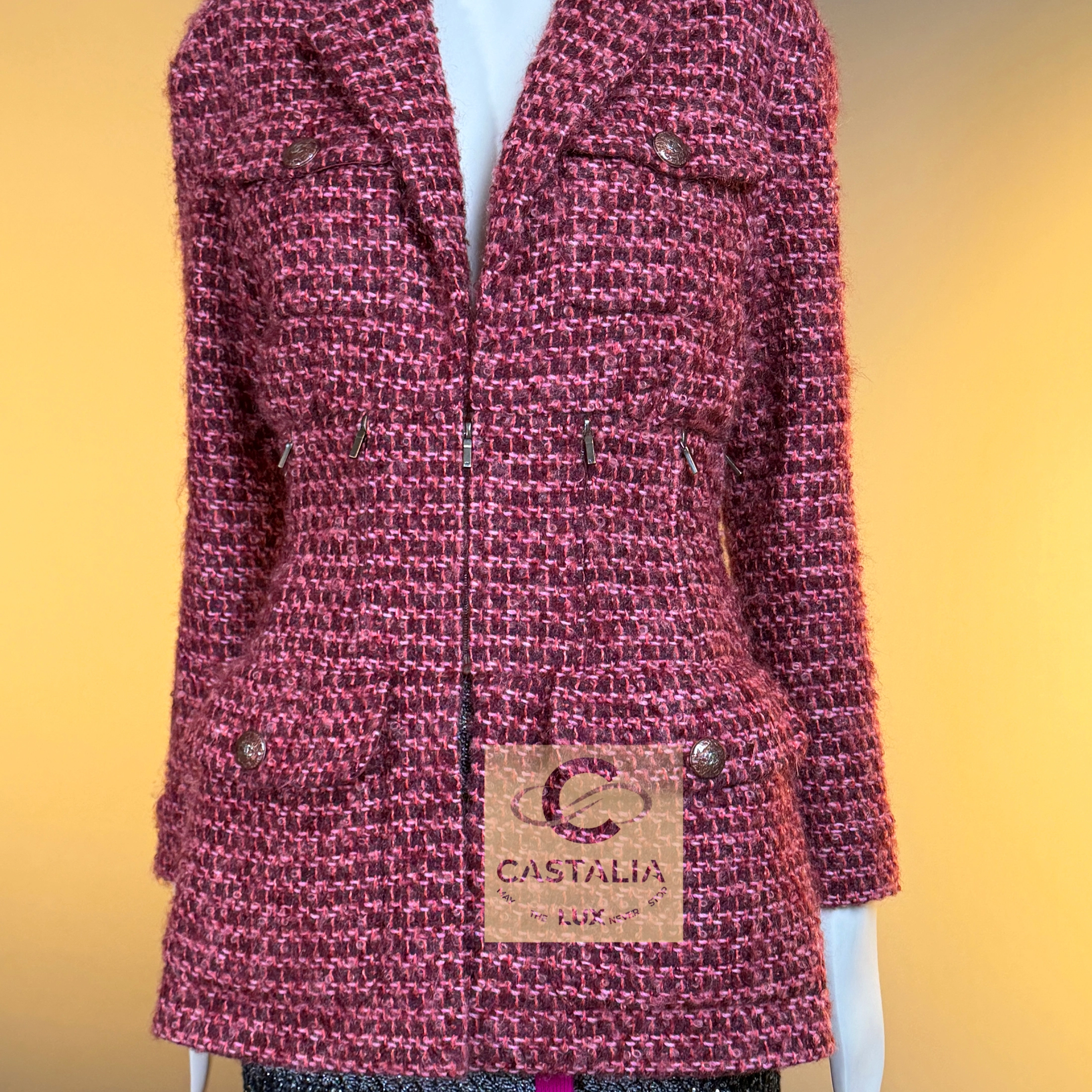 CHANEL · Museum Rare Burgundy Architectural Tweed Jacket with Zipper Accents — “SUPERMARKET” Fall 2014 Ready-to-Wear Collection · by Karl Lagerfeld — // As seen on Cara Delevingne in the global advertising campaign · Boutique Value: over $14,000 // ~ A Chanel collector’s dream and a visual relic of Lagerfeld’s urban irony — a jacket where architecture meets allure, and tweed becomes both armor and art ~ From the legendary “SUPERMARKET” runway, where Karl Lagerfeld transformed the everyday into spectacle, comes this exceptionally rare architectural tweed jacket—a fusion of couture discipline and modern rebellion // Size mark 38 FR / Condition: never worn // — Crafted from precious Lesage tweed in a deep burgundy tone interwoven with pink threads, it radiates the tactile richness that defines Chanel’s mastery of texture — sculptural silhouette reveals an accentuated waist framed by CC-logo zipper details, while the four-patch-pocket design anchors the structure in timeless Chanel geometry — CC-logo ‘lollipop’ buttons embellish the pockets and cuffs, and a front CC-logo zipper closure lends a contemporary edge to its classic form — Inside, a tonal silk lining preserves the quiet luxury of couture finish