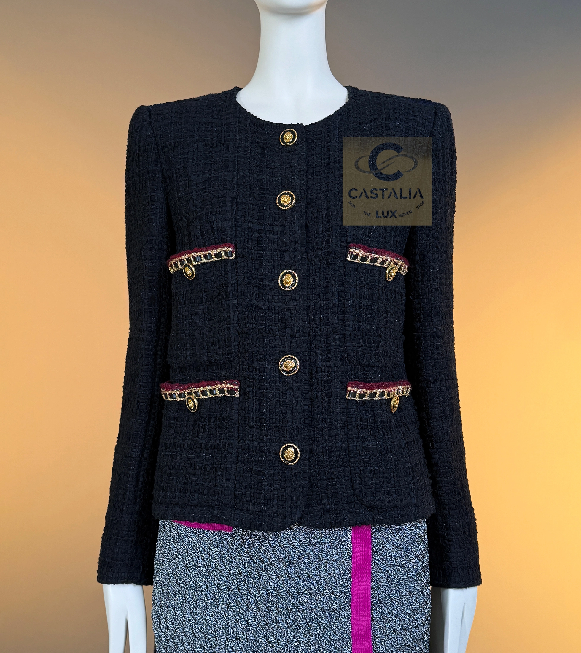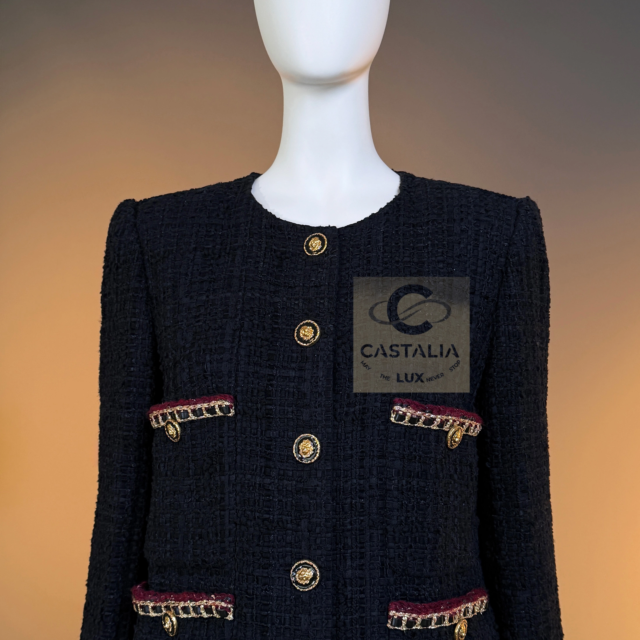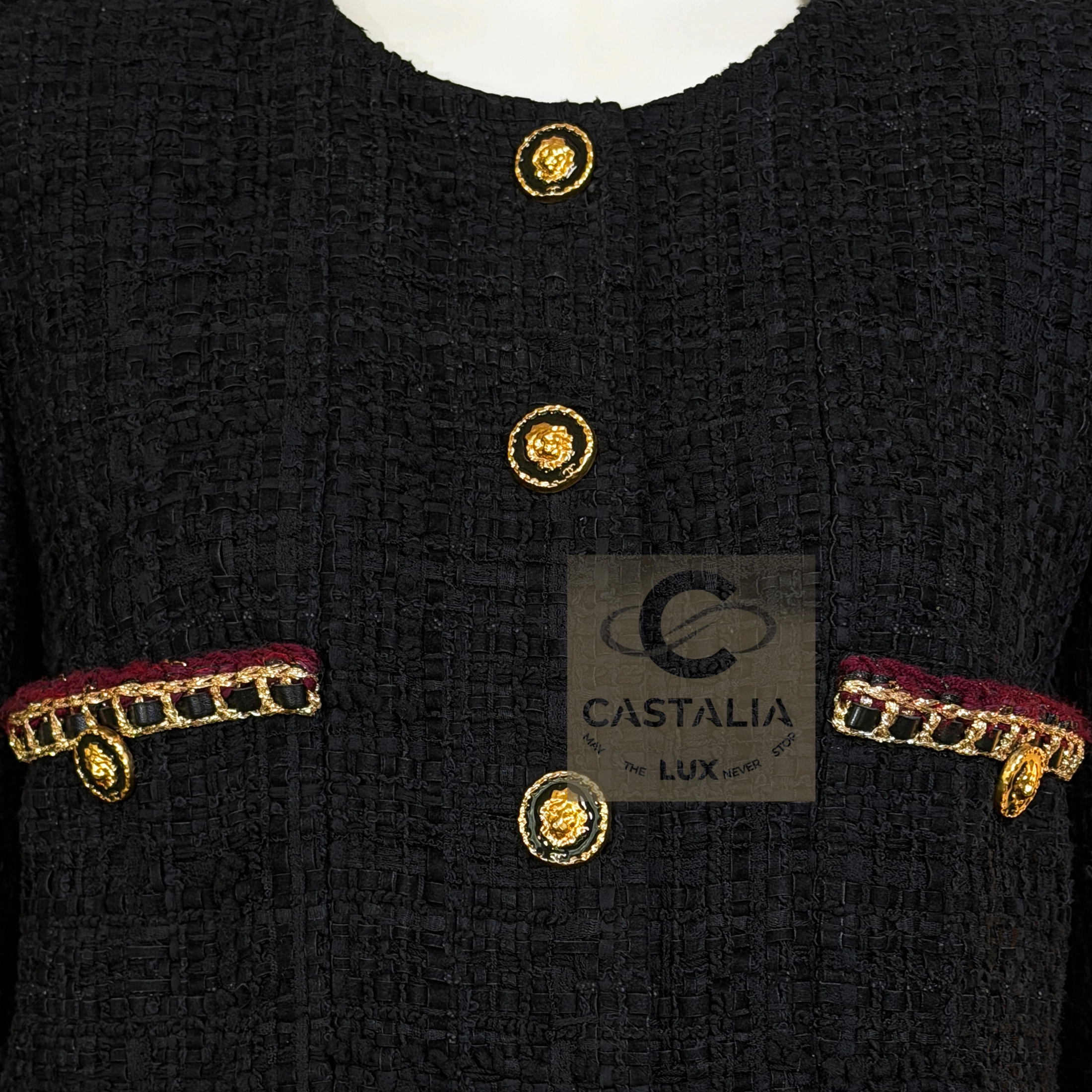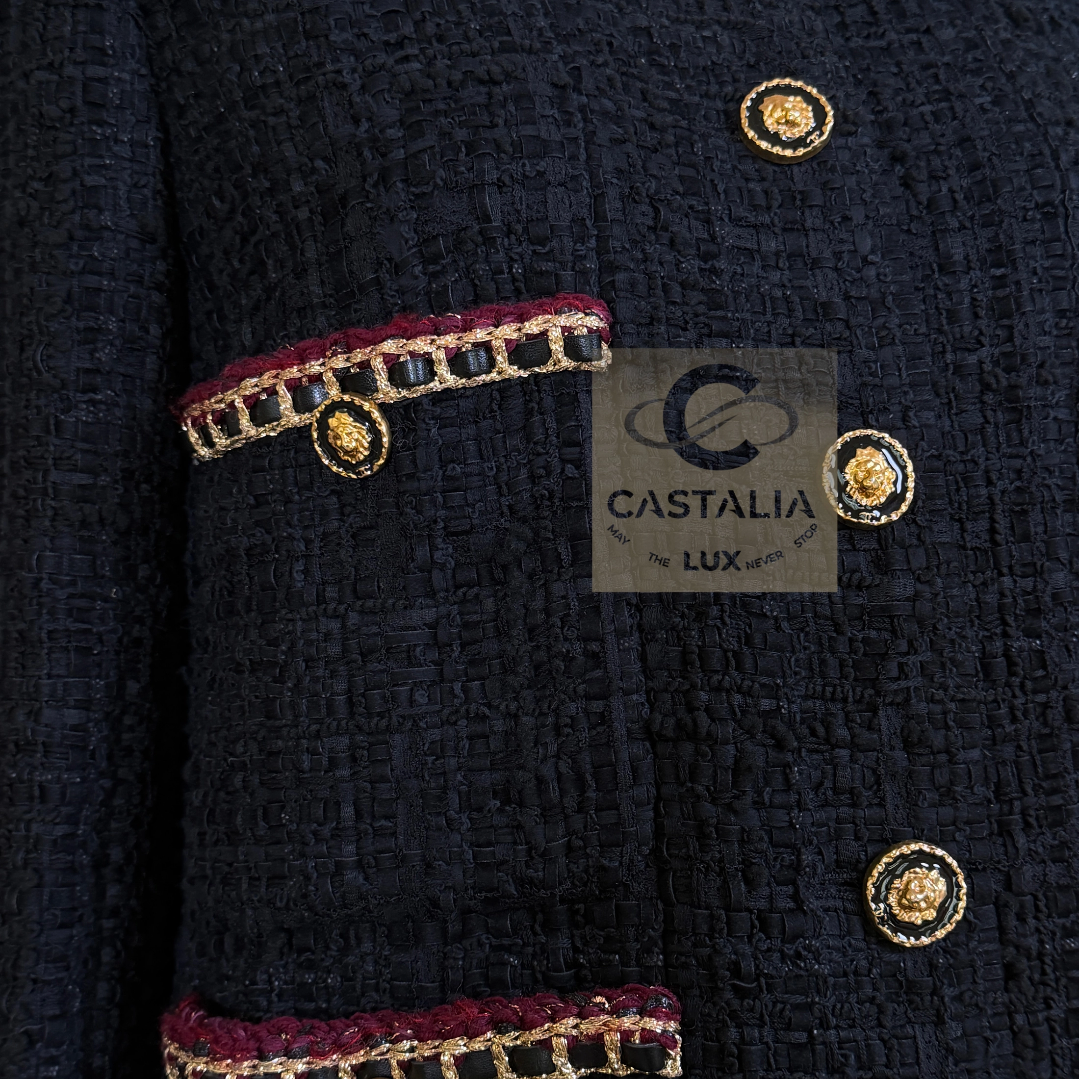 CHANEL · The Ultimate “Little Black Jacket” — Métiers d’Art 2021 “Château des Dames” Collection · by Virginie Viard // Boutique Value: Over $18,000 ~ A modern relic of the Chanel pantheon — the black jacket reborn for a new century of icons ~ One of the most coveted Chanel jackets of the modern era — immortalized on Dua Lipa in Chanel handbag campaigns and worn by Rihanna, Hailey Bieber, and Kristen Stewart — this piece stands at the crossroads of timelessness and reinvention // Size mark 36 FR / Condition: never worn // — Crafted by Lesage in a sumptuous black ribbon tweed, its surface shimmers with quiet architectural depth — The silhouette — four patch pockets and a precise, structured line — is the purest expression of the Maison’s eternal grammar — Each button, a miniature talisman, bears the CC insignia and lion’s head — the guardian emblem of Chanel’s mythology — Trimmed with chain-link like braids interlaced with deep carmine threads, it radiates both strength and sensuality — Inside, a black silk lining and the signature chain at the hem complete the inner sanctum of couture craftsmanship