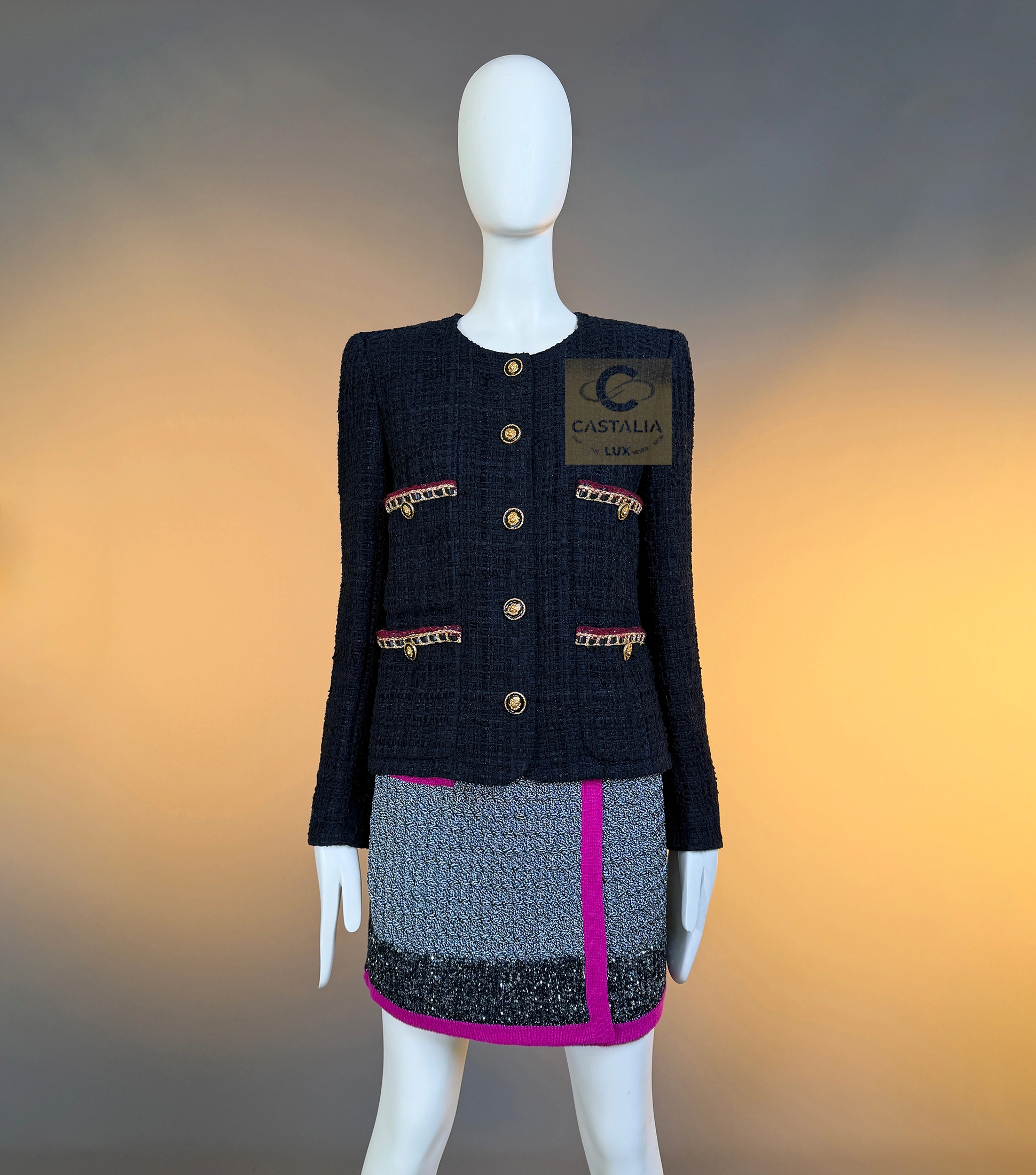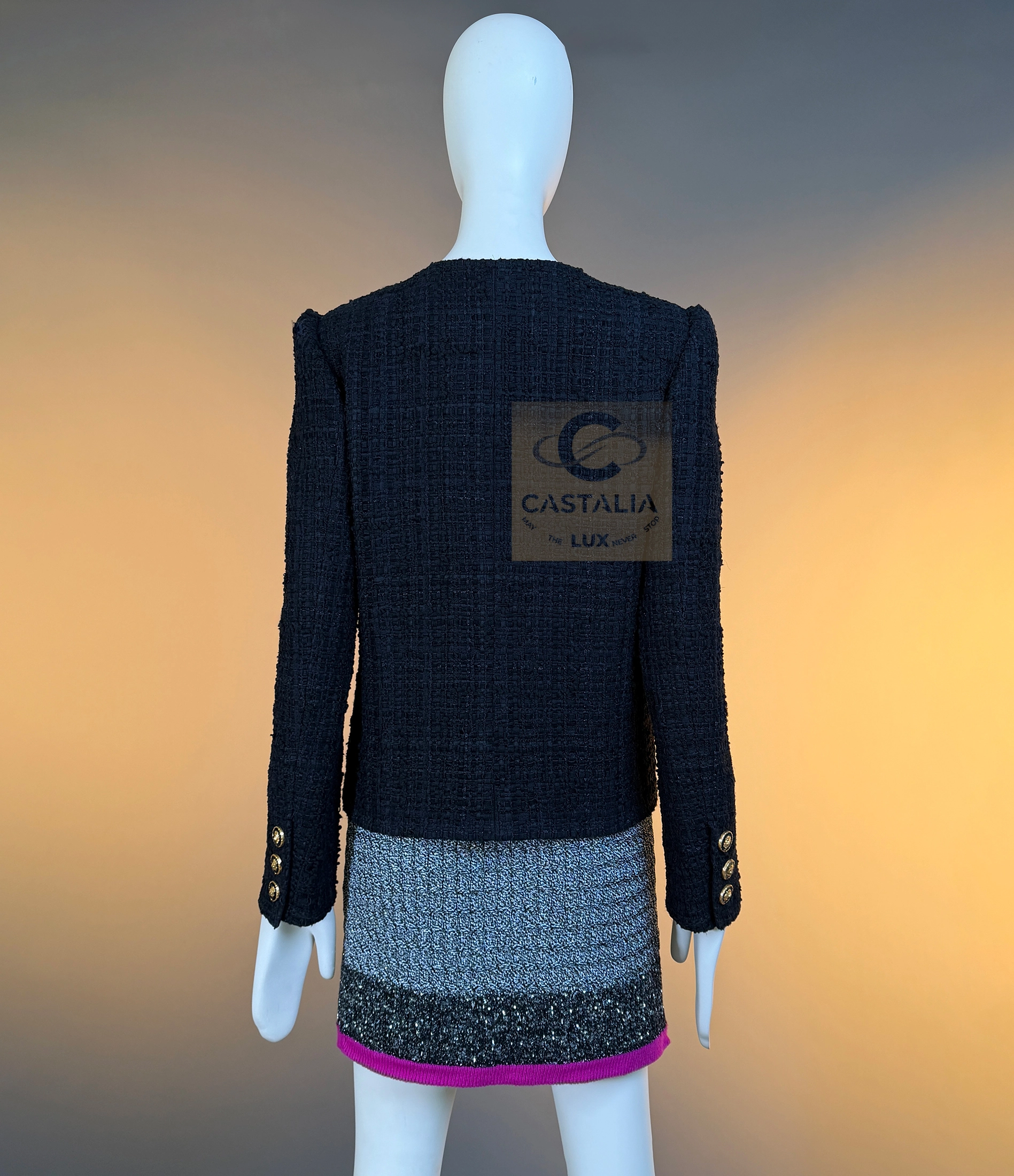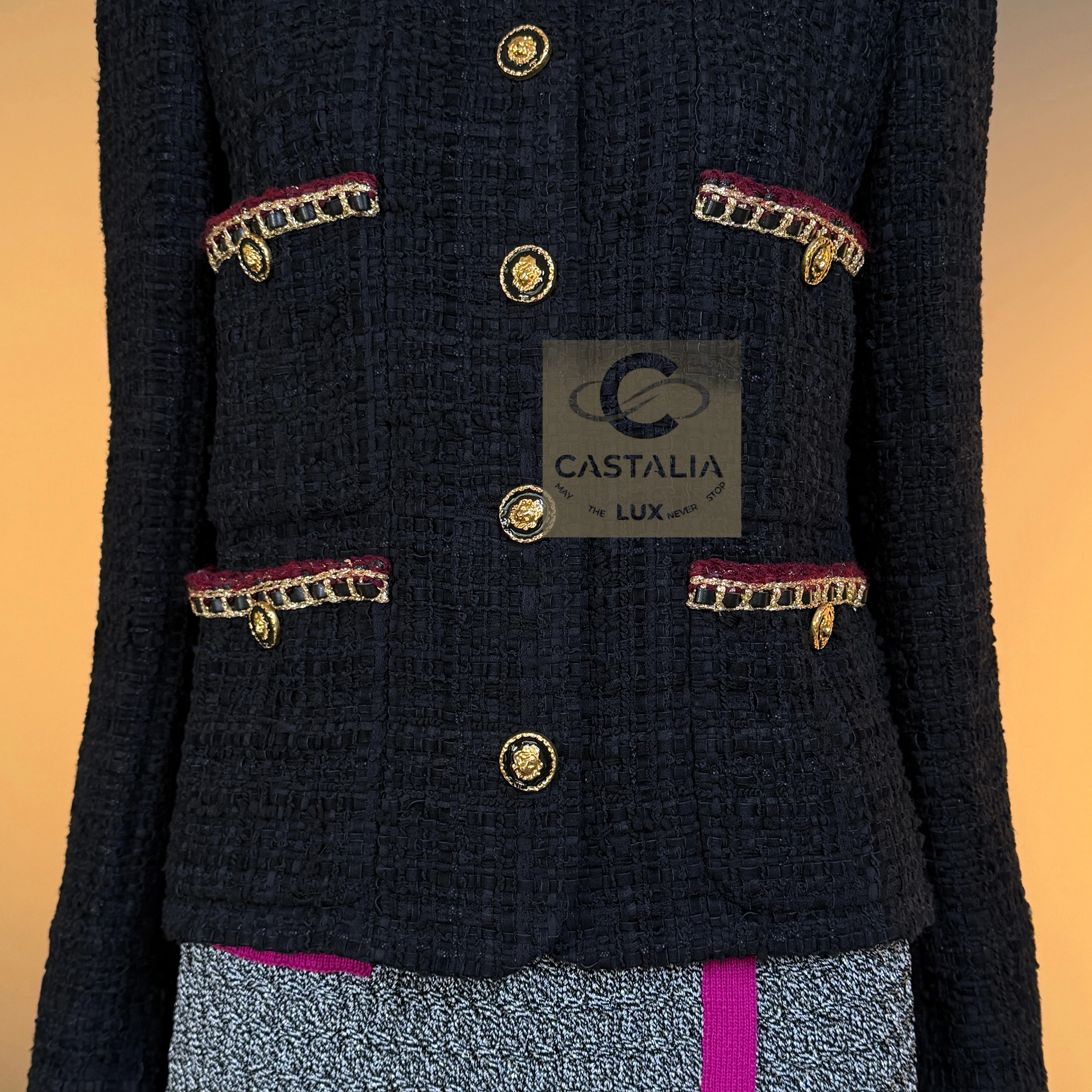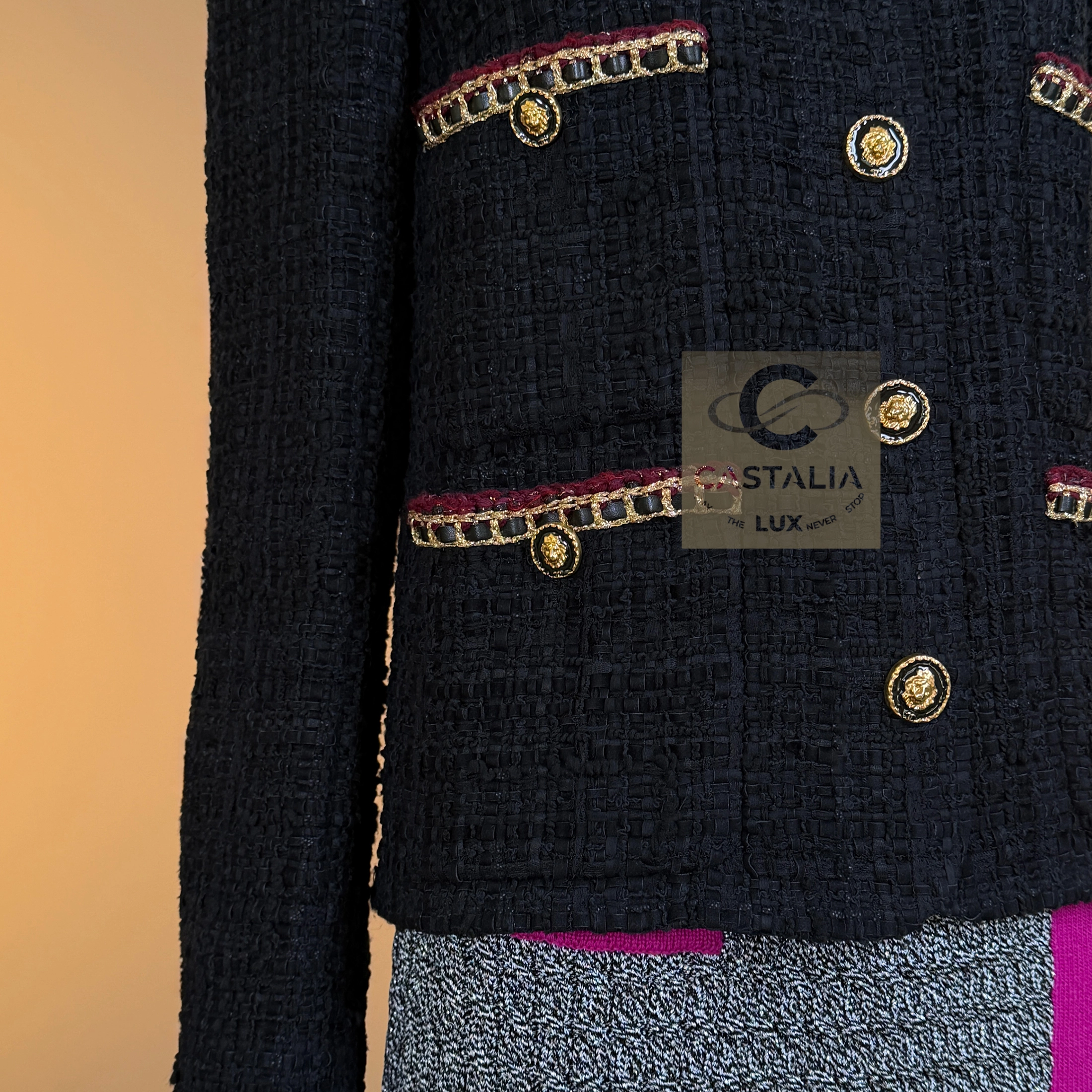 CHANEL · The Ultimate “Little Black Jacket” — Métiers d’Art 2021 “Château des Dames” Collection · by Virginie Viard // Boutique Value: Over $18,000 ~ A modern relic of the Chanel pantheon — the black jacket reborn for a new century of icons ~ One of the most coveted Chanel jackets of the modern era — immortalized on Dua Lipa in Chanel handbag campaigns and worn by Rihanna, Hailey Bieber, and Kristen Stewart — this piece stands at the crossroads of timelessness and reinvention // Size mark 36 FR / Condition: never worn // — Crafted by Lesage in a sumptuous black ribbon tweed, its surface shimmers with quiet architectural depth — The silhouette — four patch pockets and a precise, structured line — is the purest expression of the Maison’s eternal grammar — Each button, a miniature talisman, bears the CC insignia and lion’s head — the guardian emblem of Chanel’s mythology — Trimmed with chain-link like braids interlaced with deep carmine threads, it radiates both strength and sensuality — Inside, a black silk lining and the signature chain at the hem complete the inner sanctum of couture craftsmanship