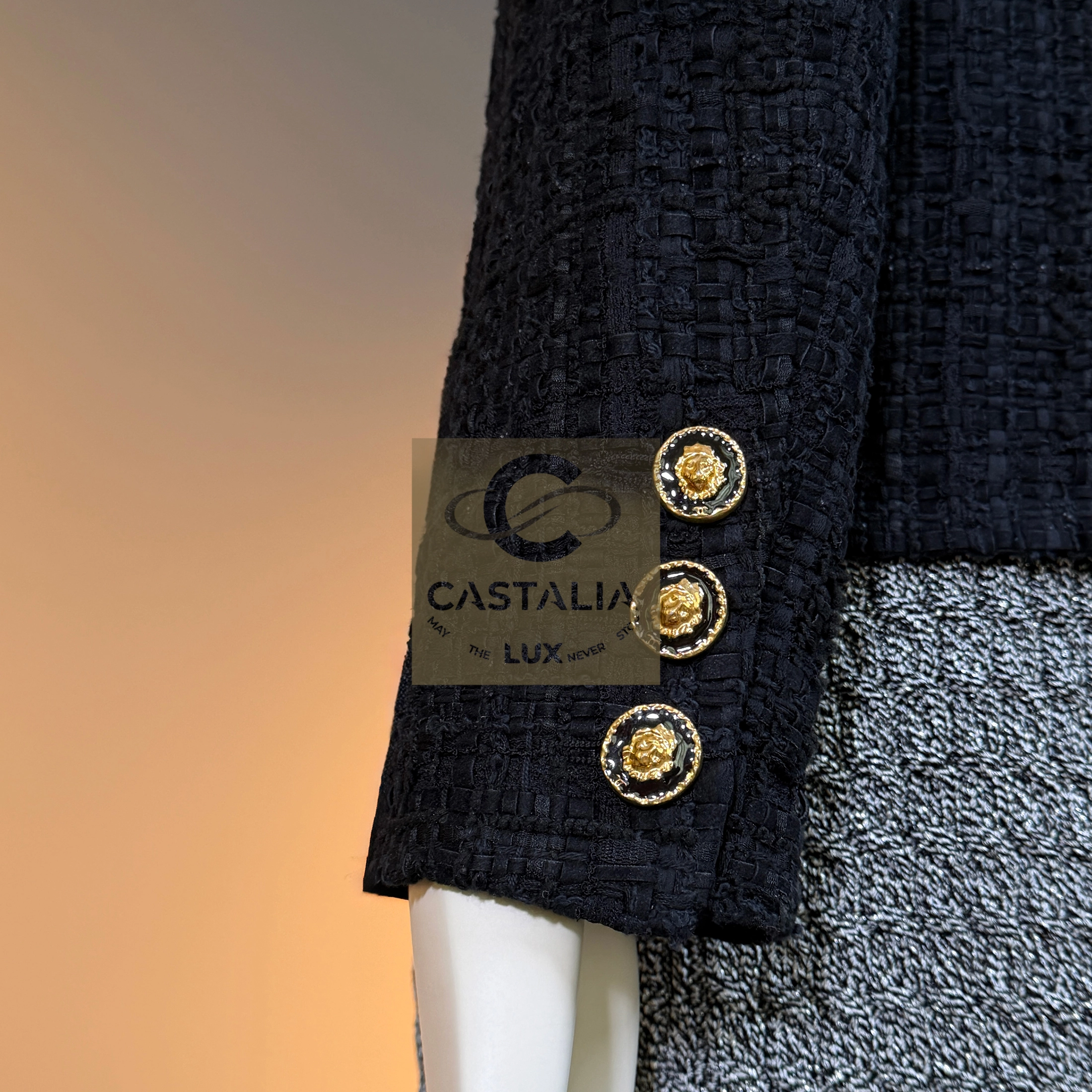 — Each button, a miniature talisman, bears the CC insignia and lion’s head — the guardian emblem of Chanel’s mythology