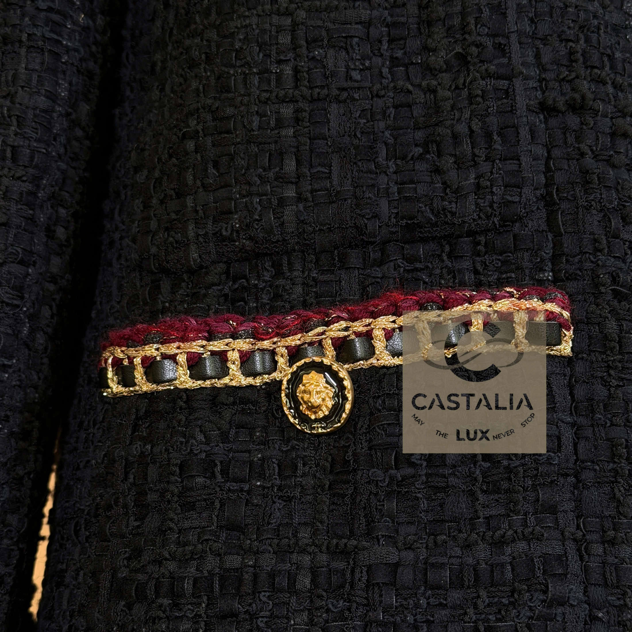 — Trimmed with chain-link like braids interlaced with deep carmine threads, it radiates both strength and sensuality