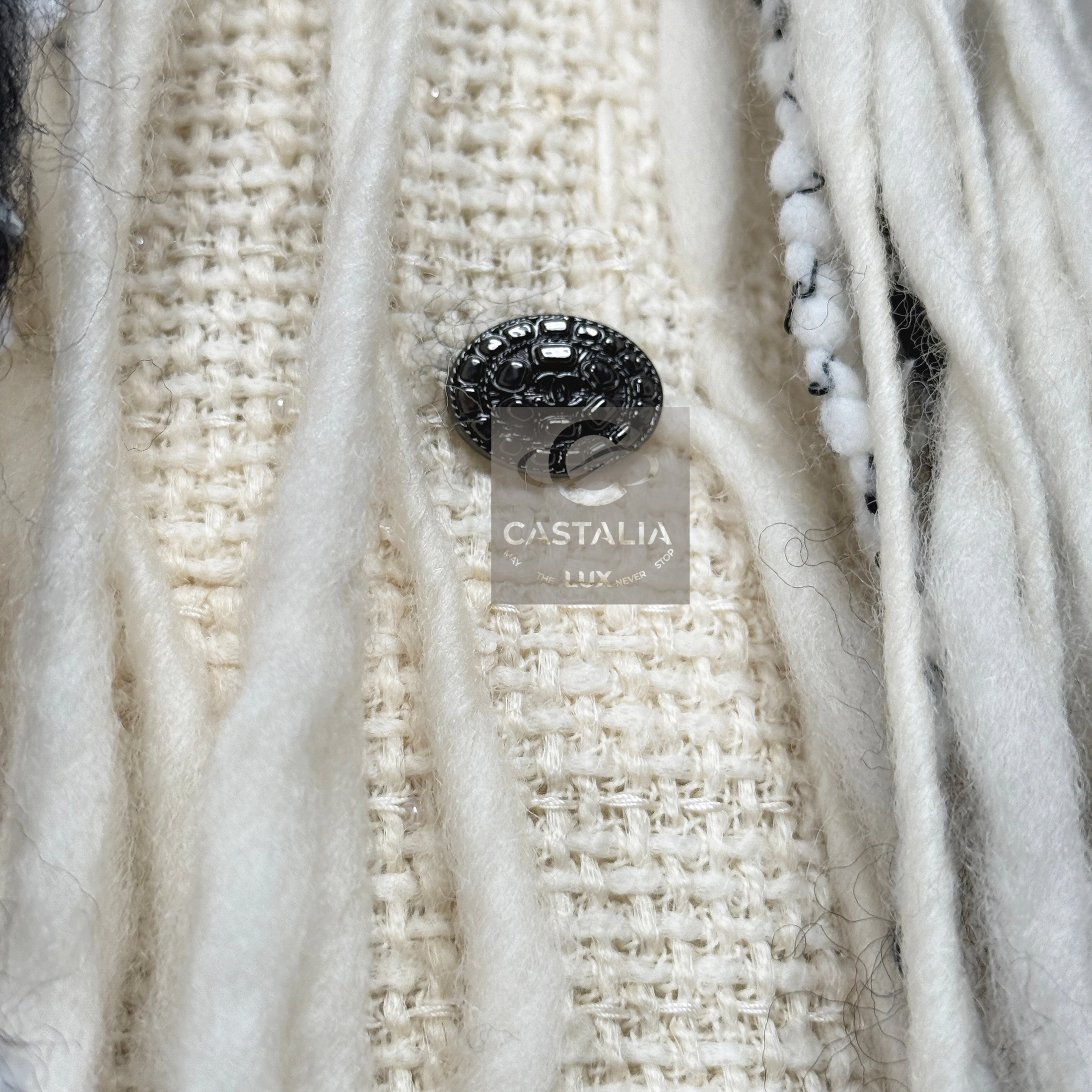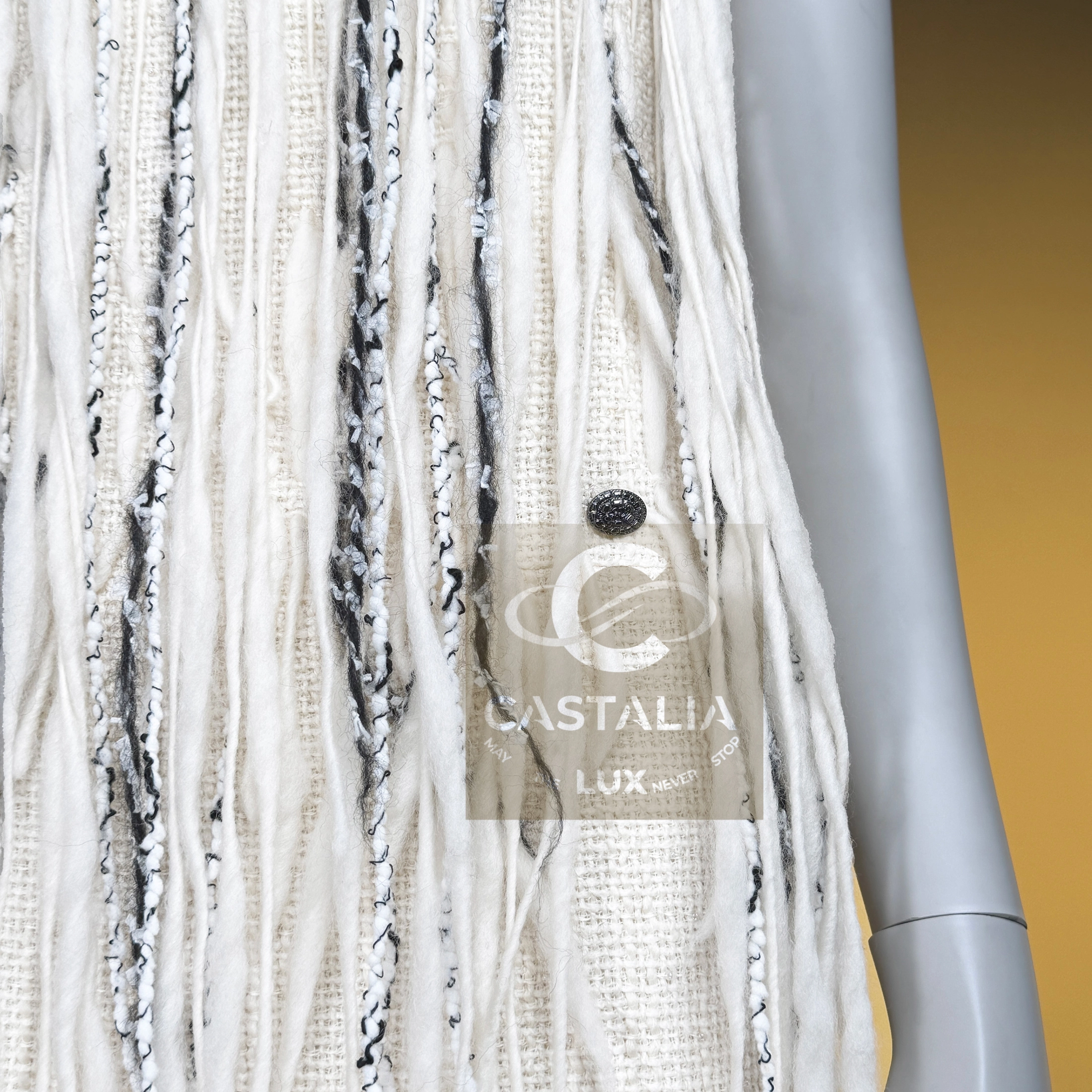 — Sculpted in the House’s precious ecru tweed, a fabric woven like glacial stone softened into couture