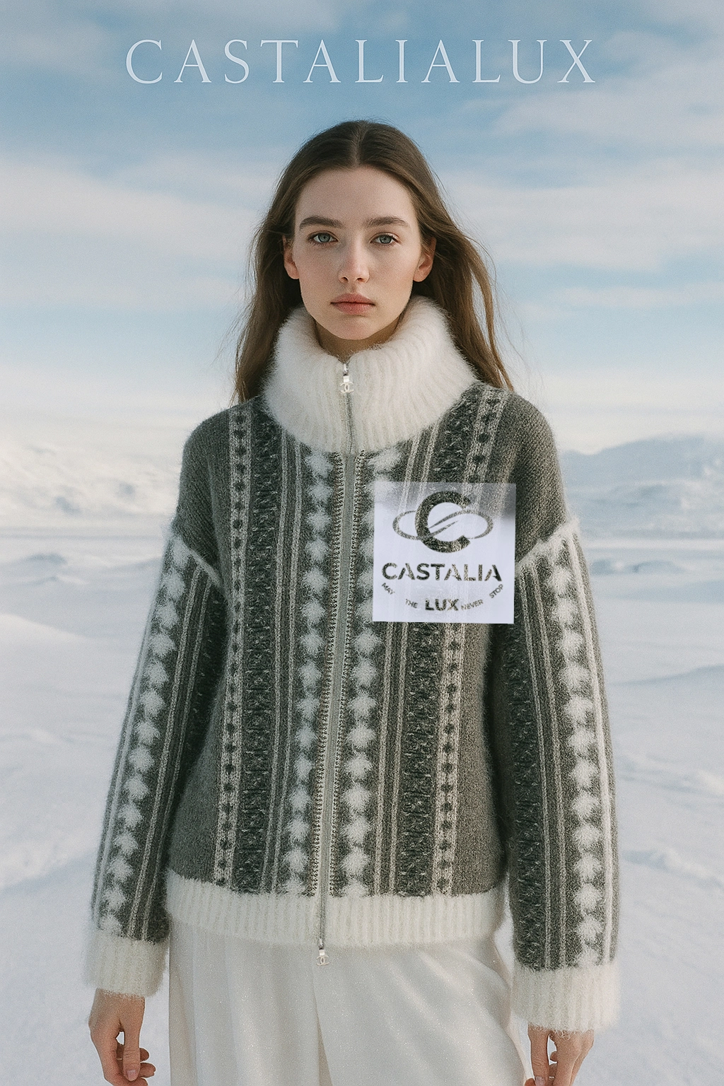 — bordered by rhythmic textures that echo polar constellations, while soft fur-like accents trace the hem, collar, and cuffs — as if rimed with frost