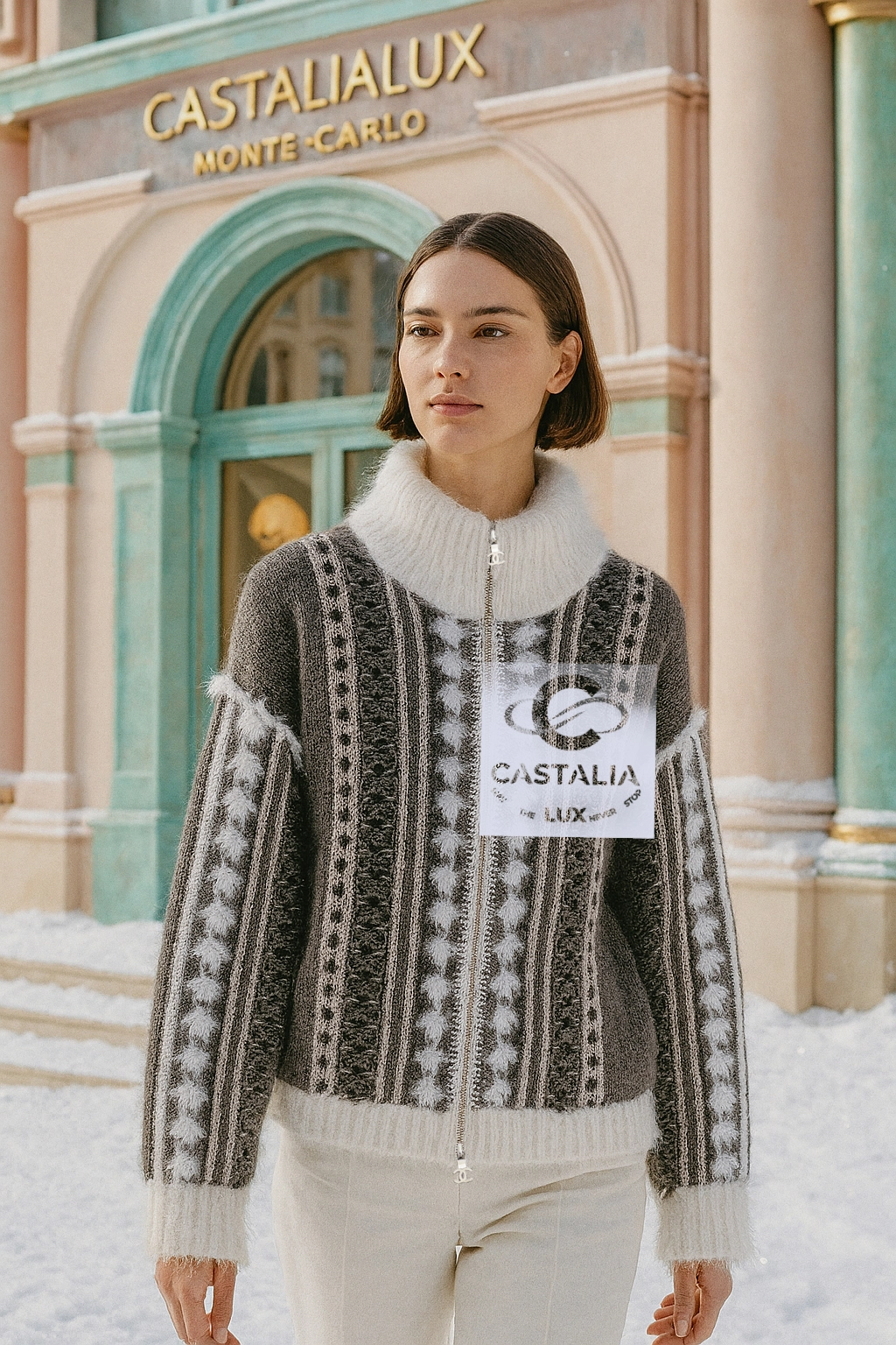— The central fastening is not hidden — it is exalted: a silver zipper etched with the legendary double CC, anchoring the piece in the mythology of the House