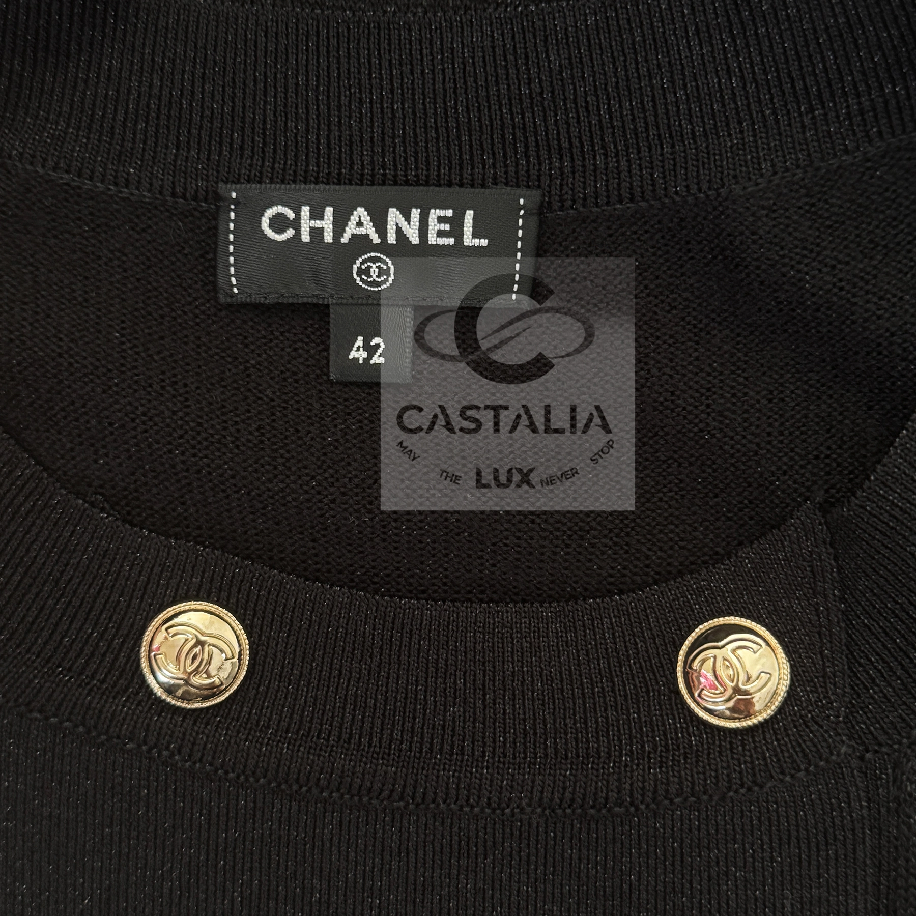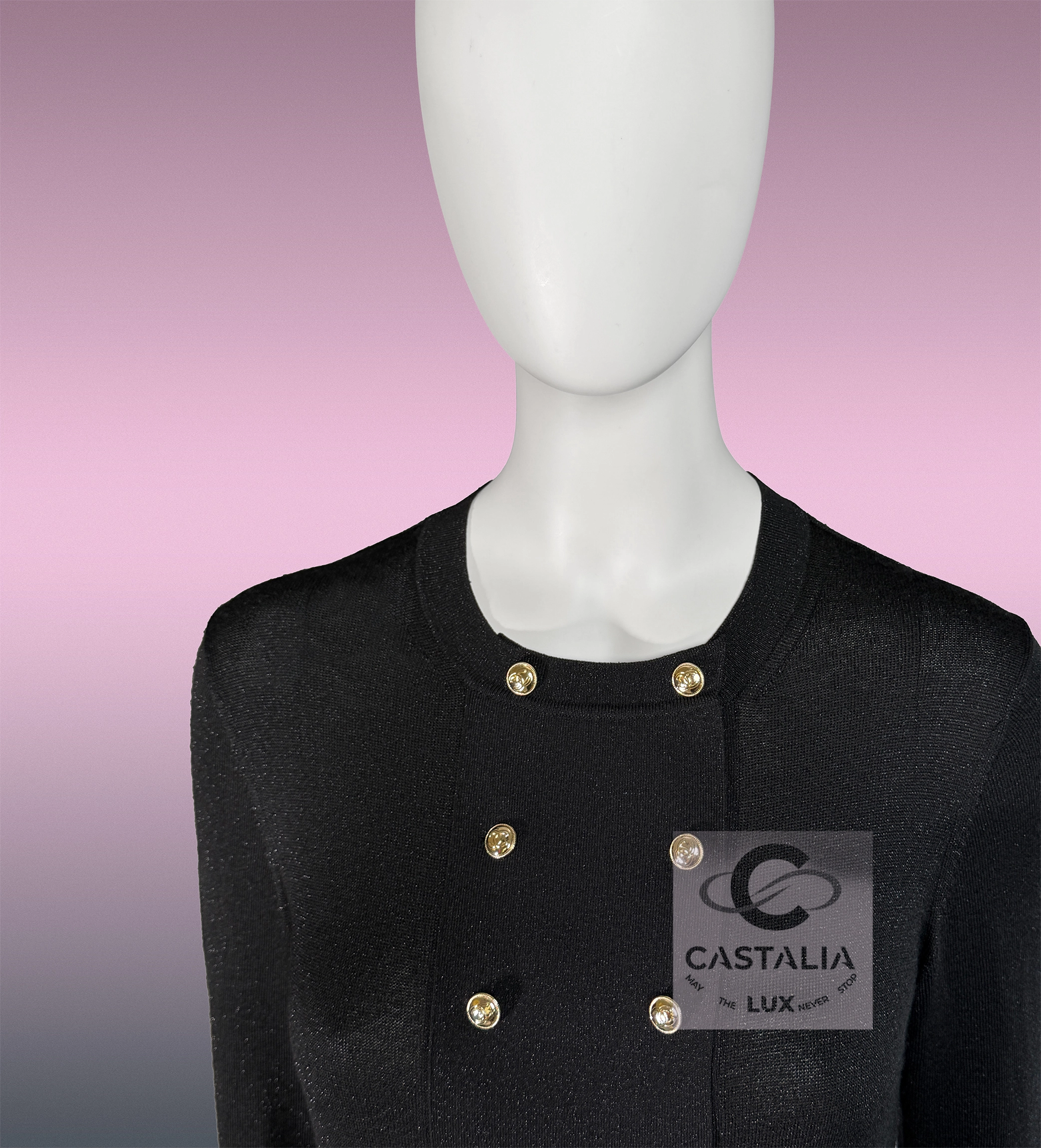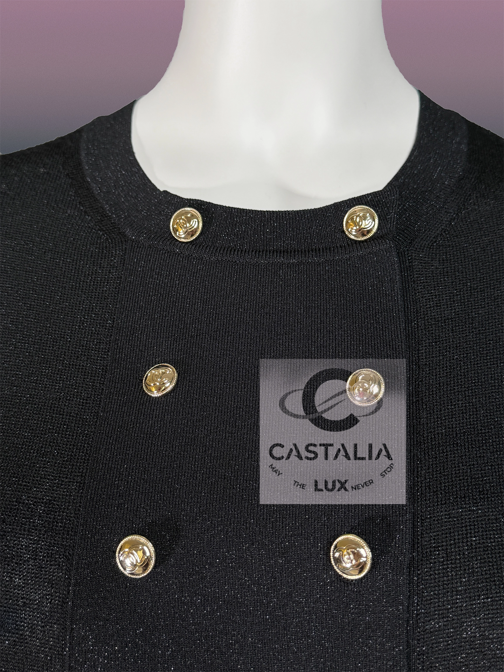 — Double rows of CC logo buttons in white gold, aligned with military precision across the bodice.