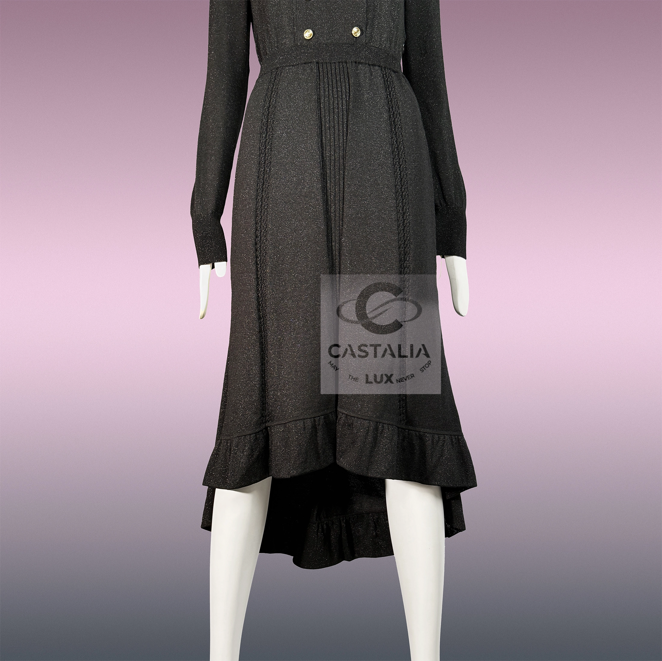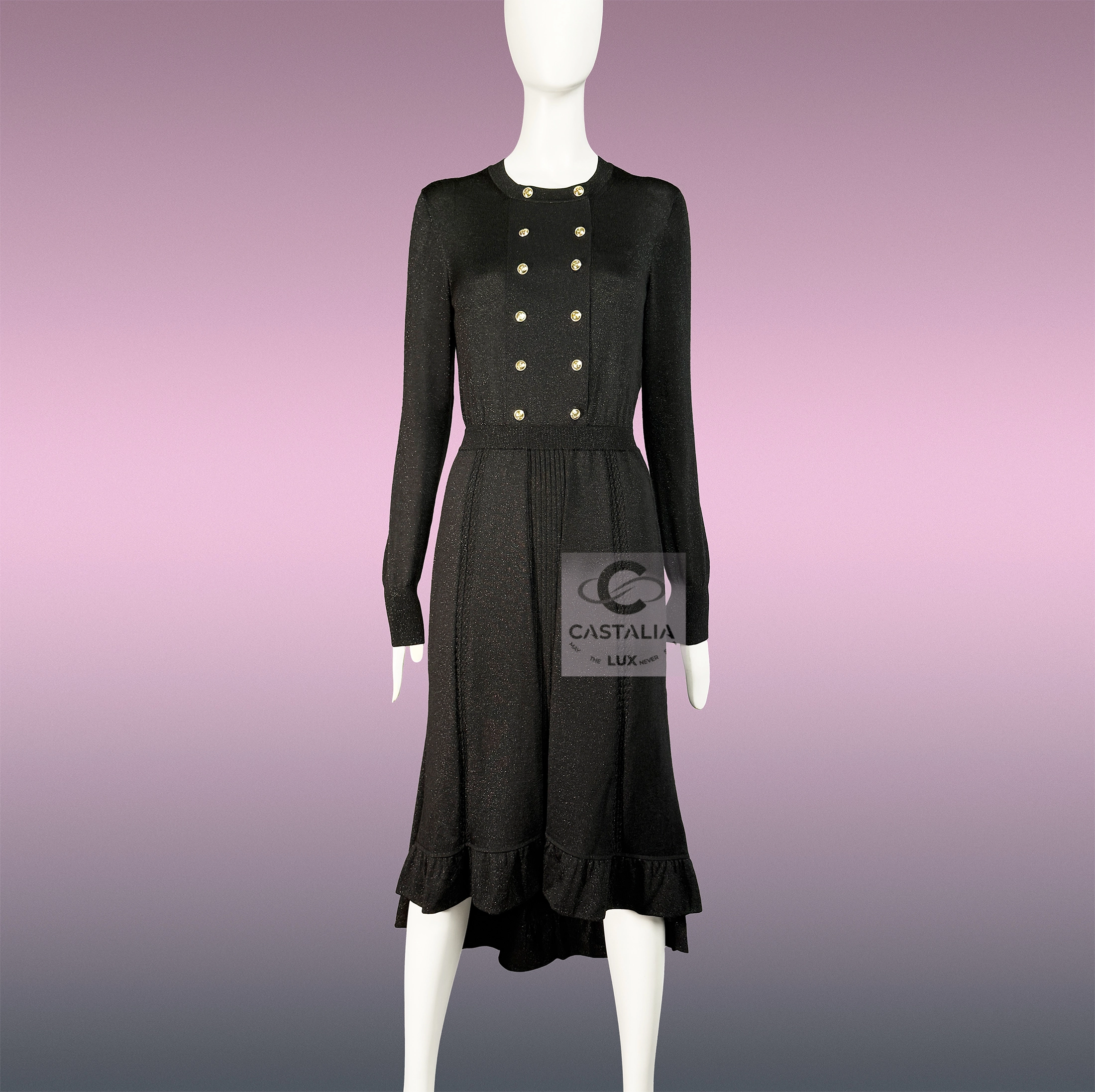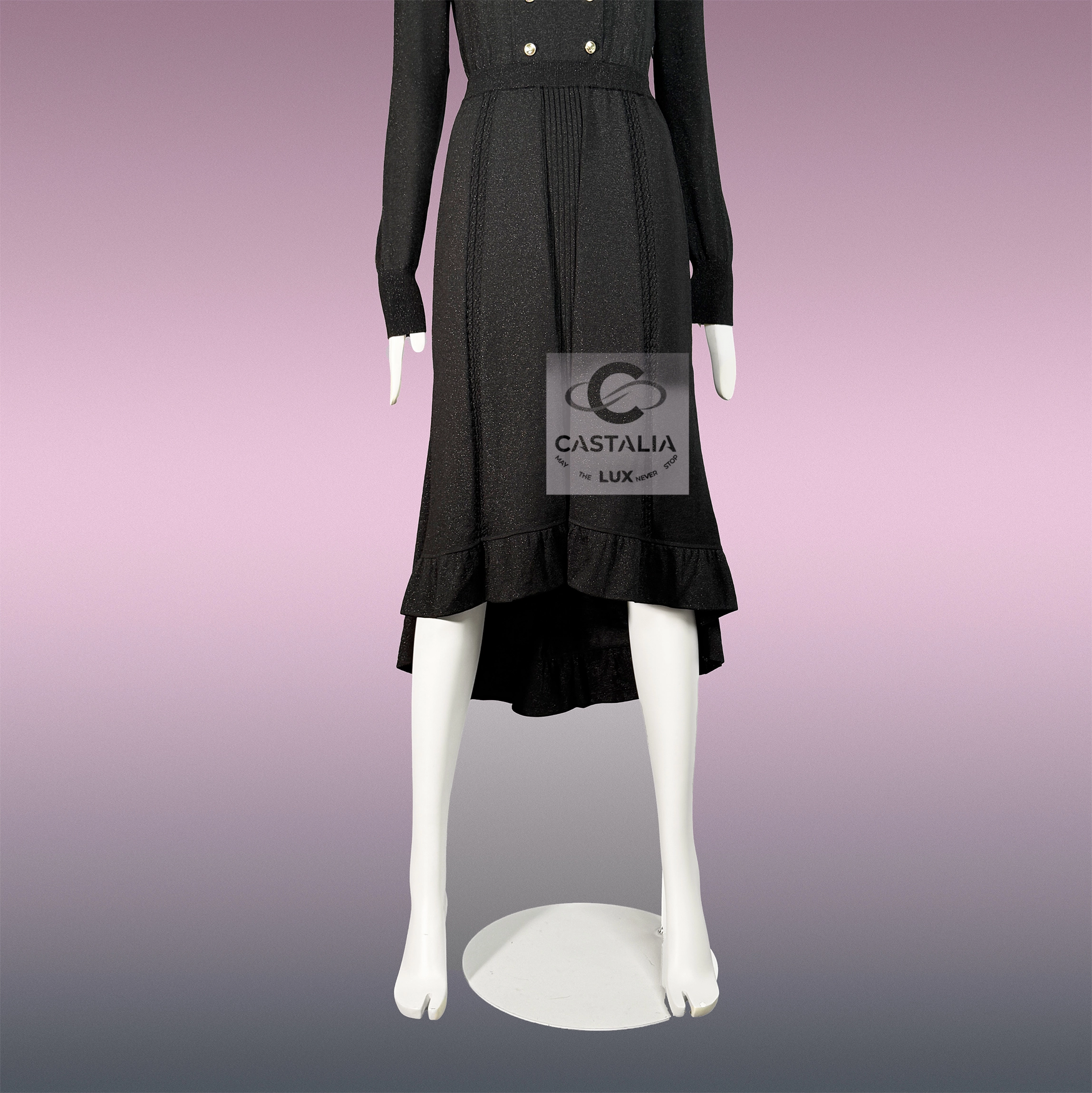 Chanel Iconic Black Shimmer Dress Fall 2020 Collection by Virginie Viard ~ Most Recognizable Piece of the 2020 Fall Collection – a dress that carries the poise of a billboard icon and the intimacy of a couture atelier ~ As seen in global ad campaigns, billboards, and leading fashion magazines. // Size mark 42 FR / Condition: never worn // — Double rows of CC logo buttons in white gold, aligned with military precision across the bodice. — Elegant Silhouette – High waistline elongates the figure, flowing into a fluid skirt with soft ruffle hem. — Black shimmer knit captures and refracts light, adding depth to the garment’s movement.