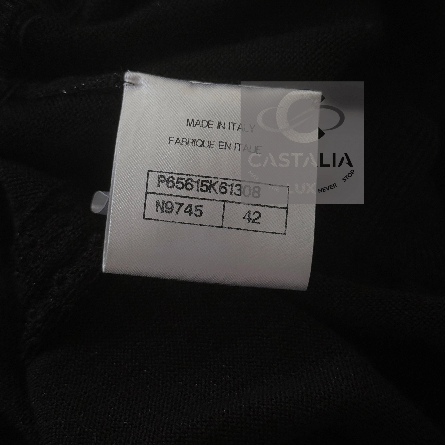 — Black shimmer knit captures and refracts light, adding depth to the garment’s movement.