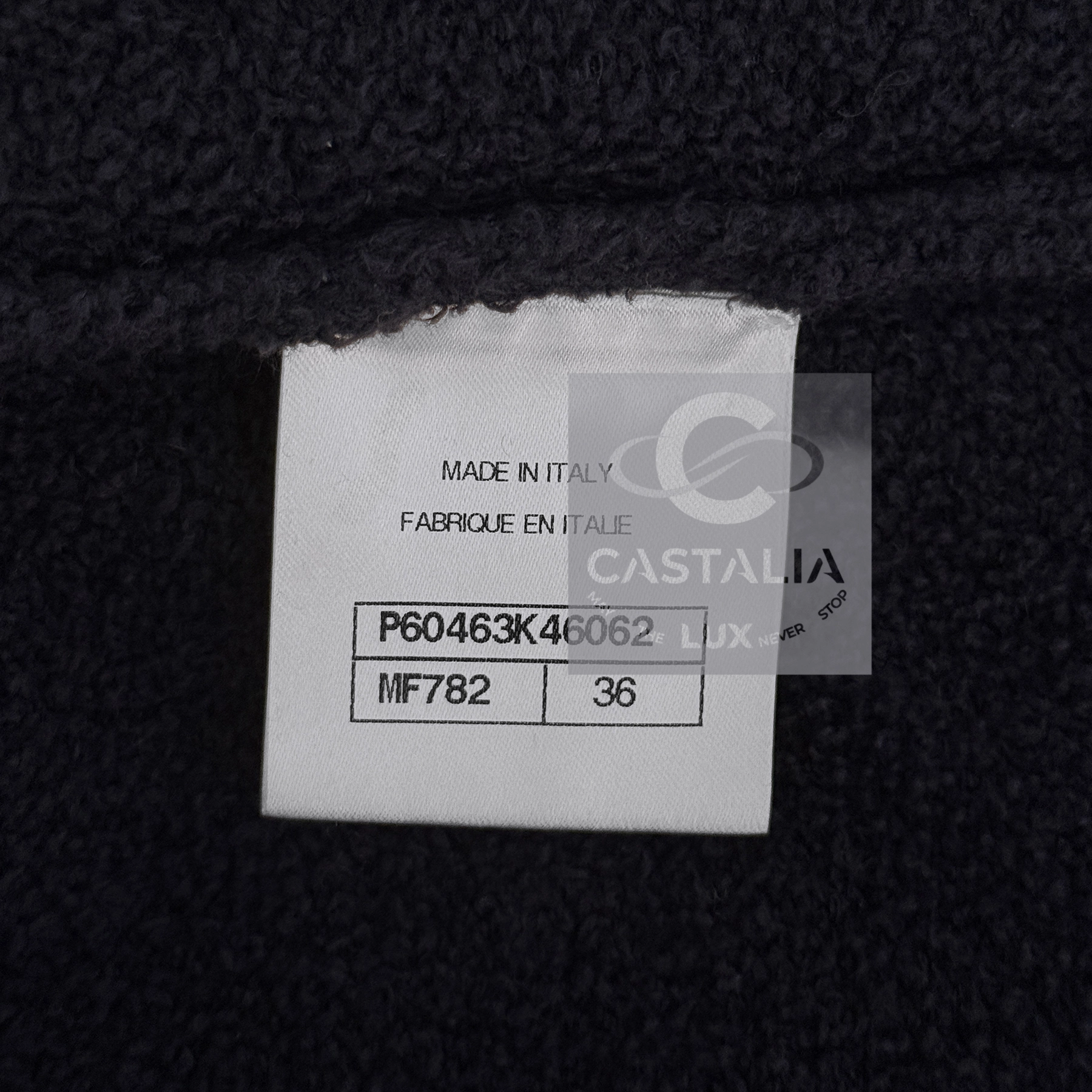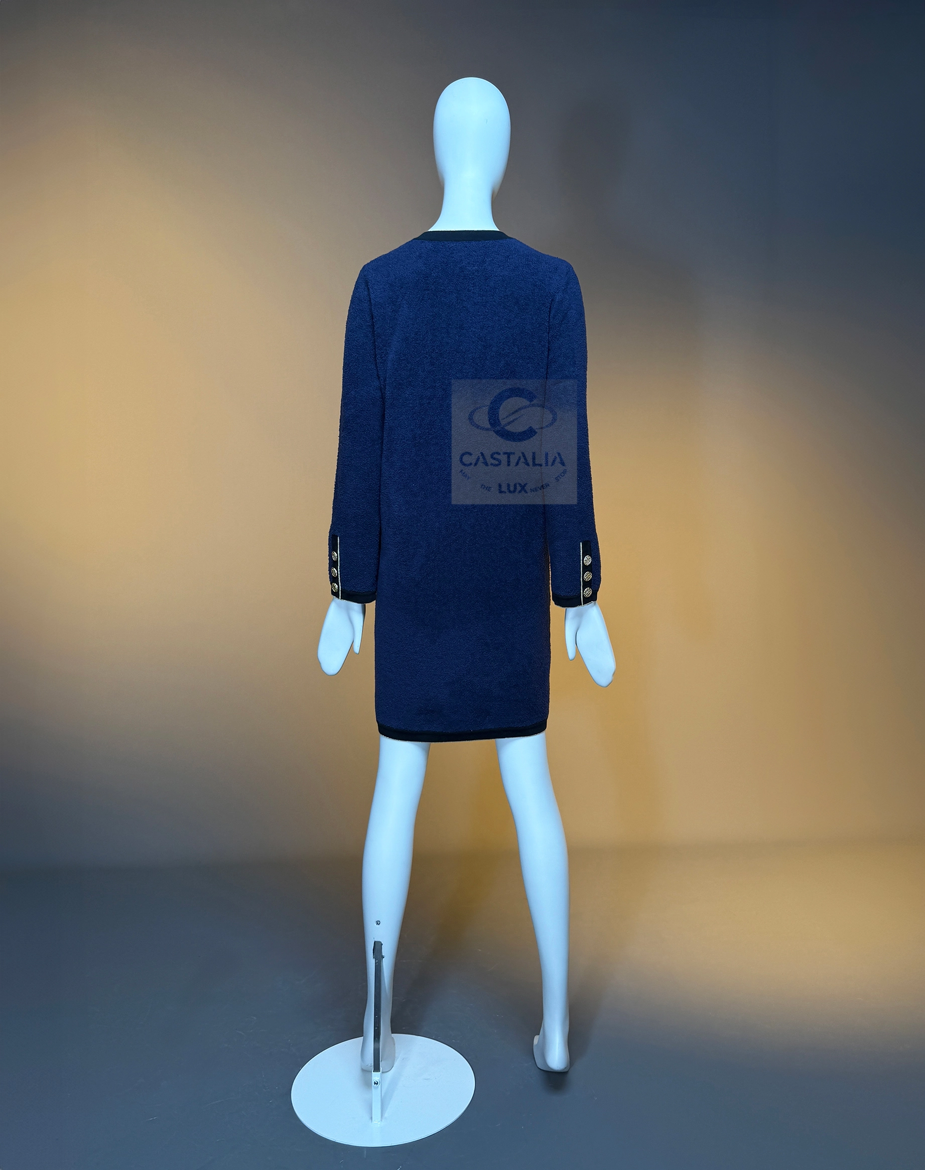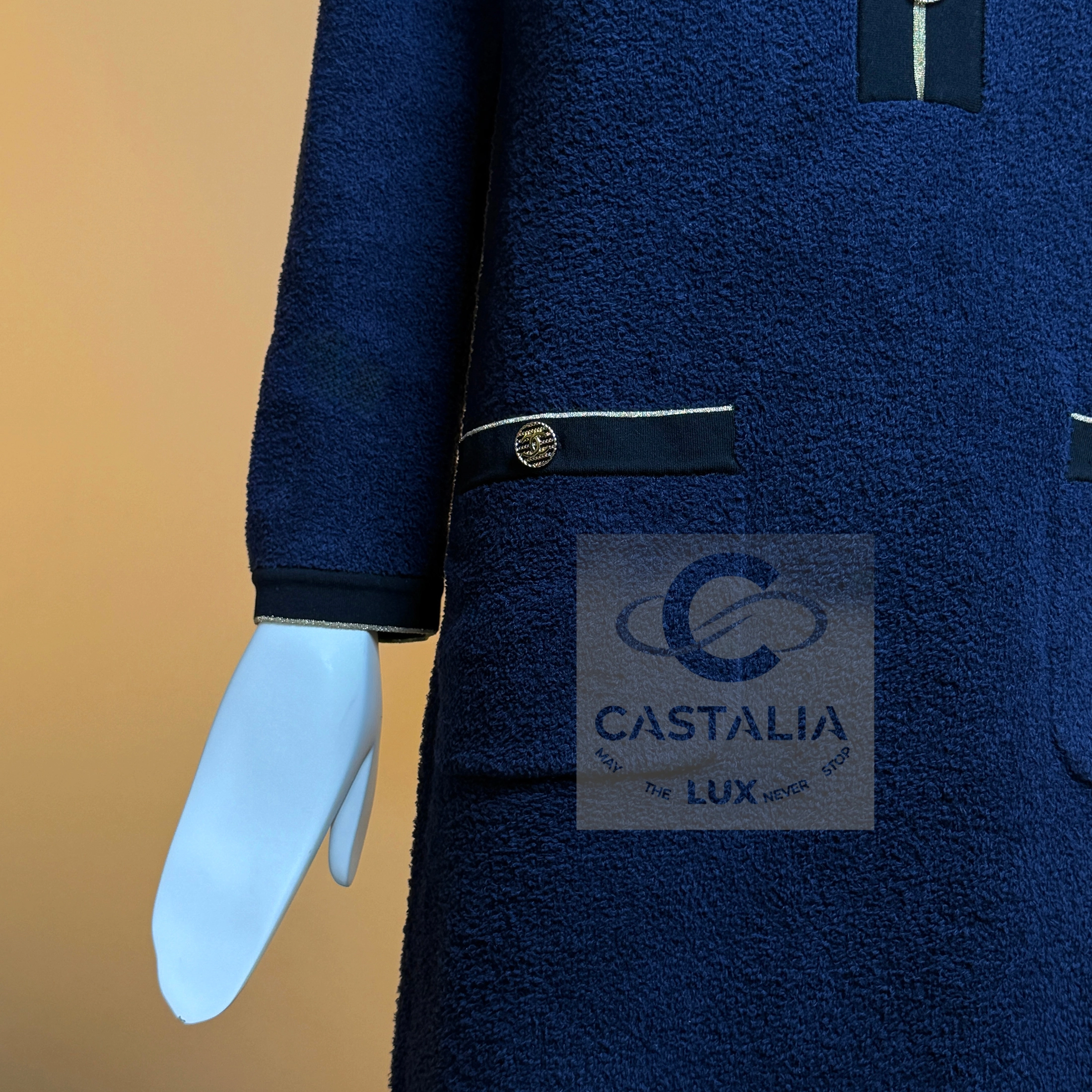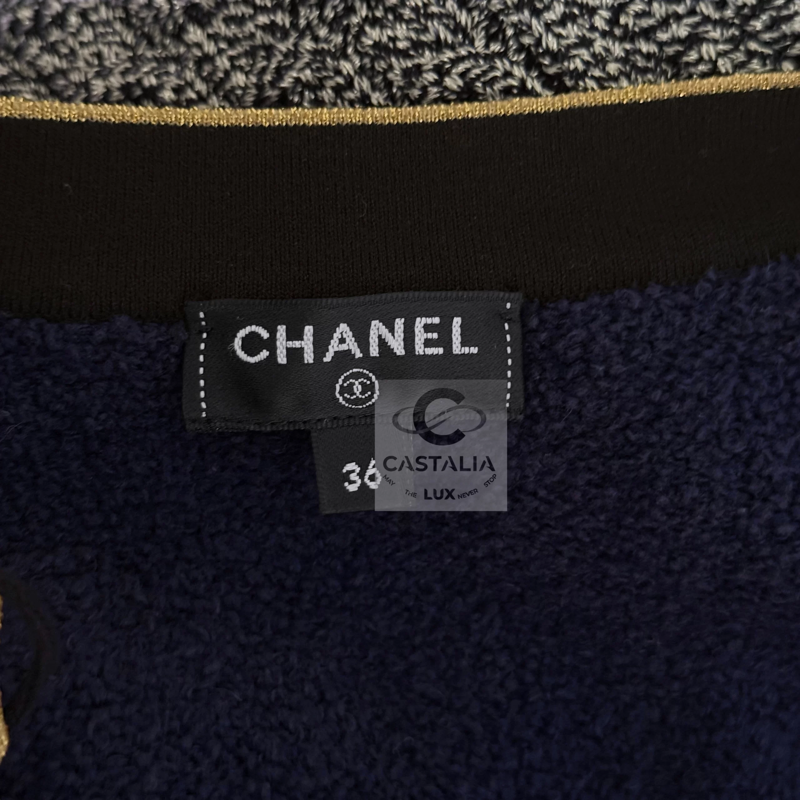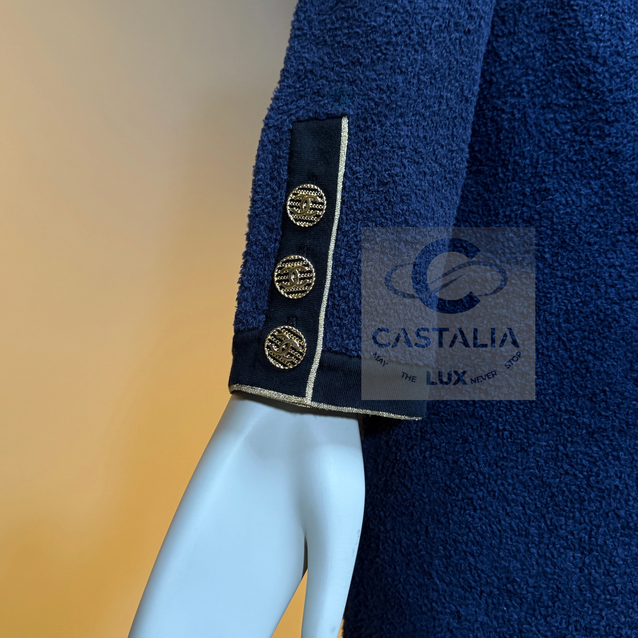 — adorned with gold-toned CC logo buttons — miniature suns glinting upon the night-blue fabric, emblems of the maison’s eternal compass