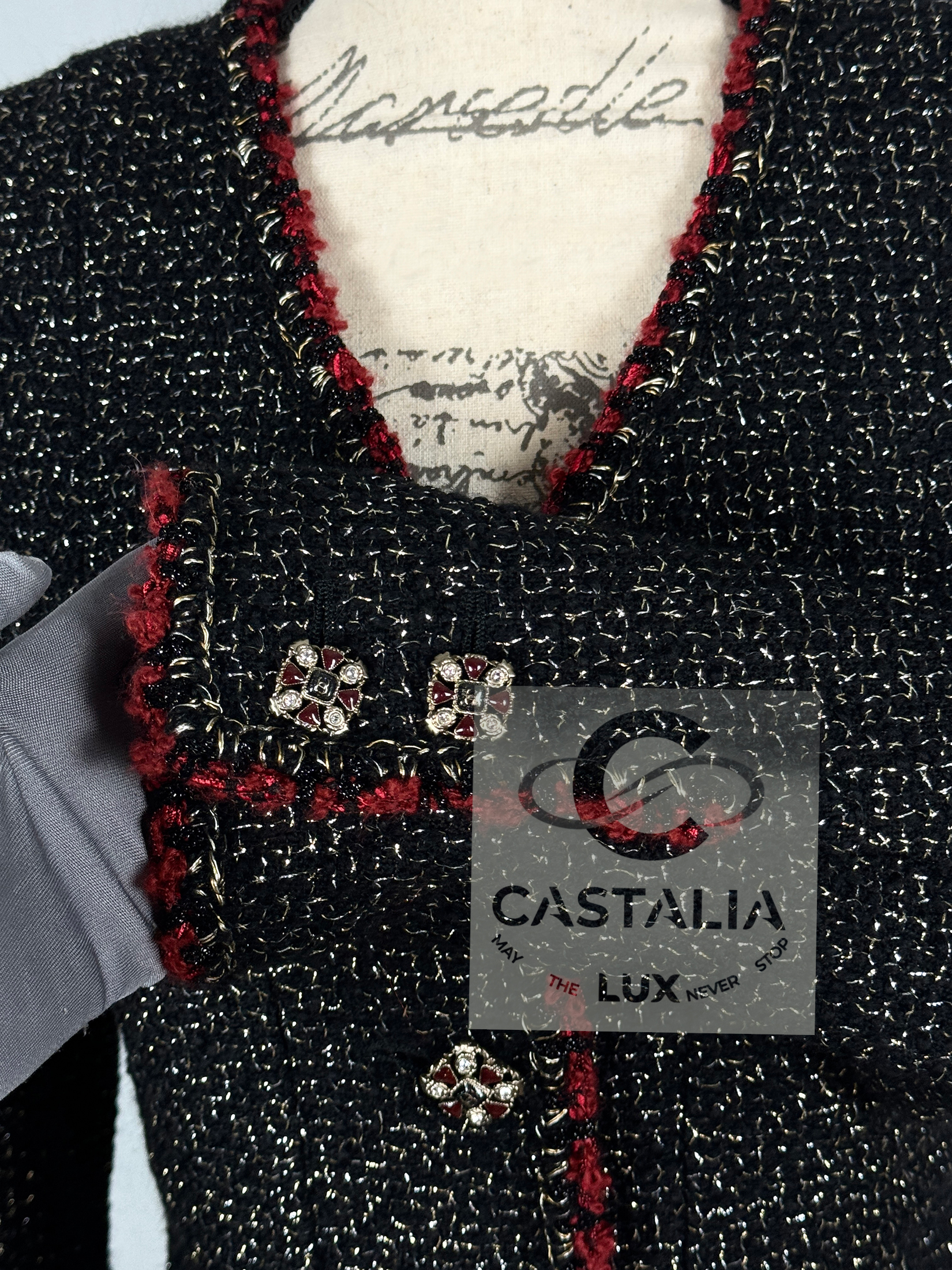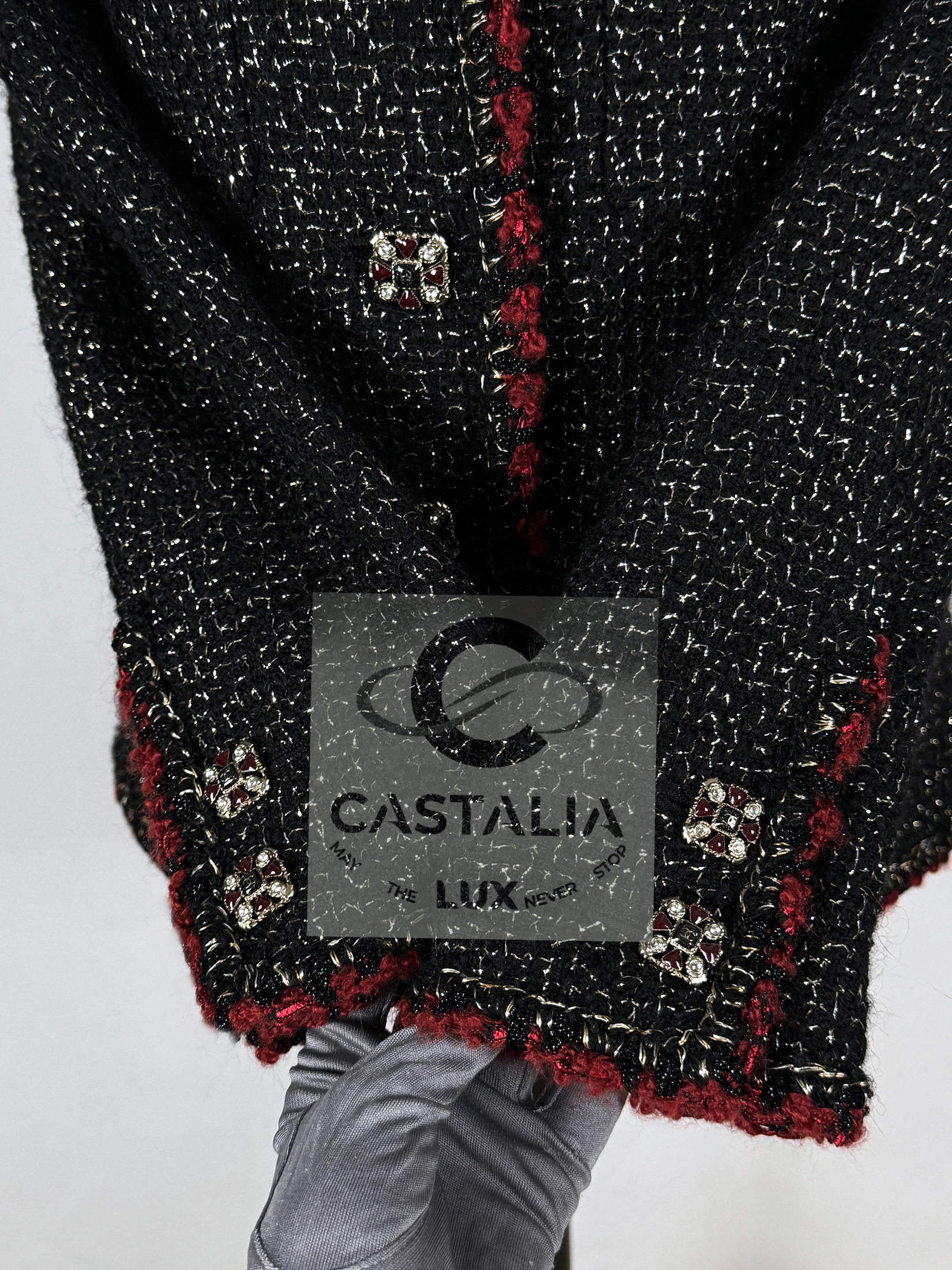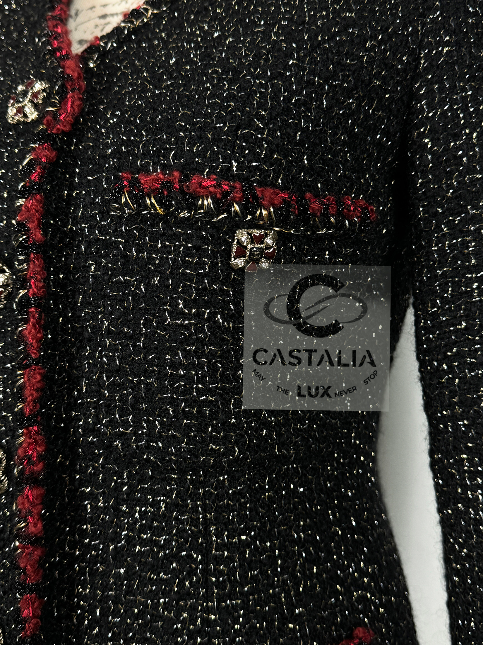 — Tailored from exquisite black Lesage tweed, interwoven with shimmering metallic threads that refract light like constellations caught in fabric