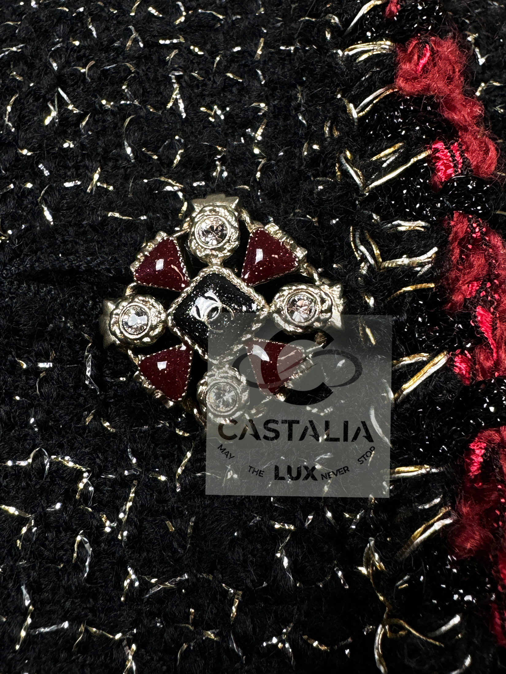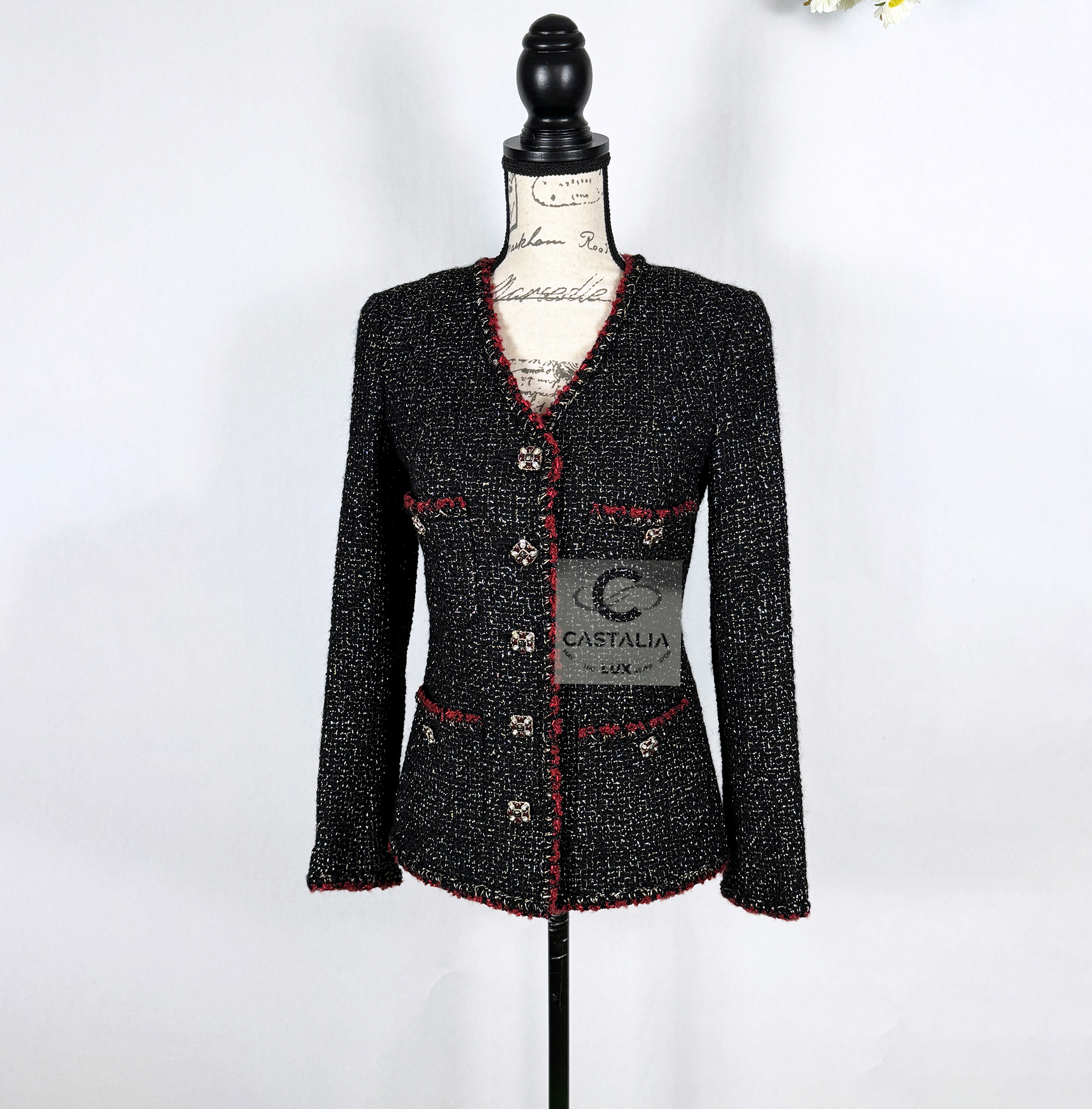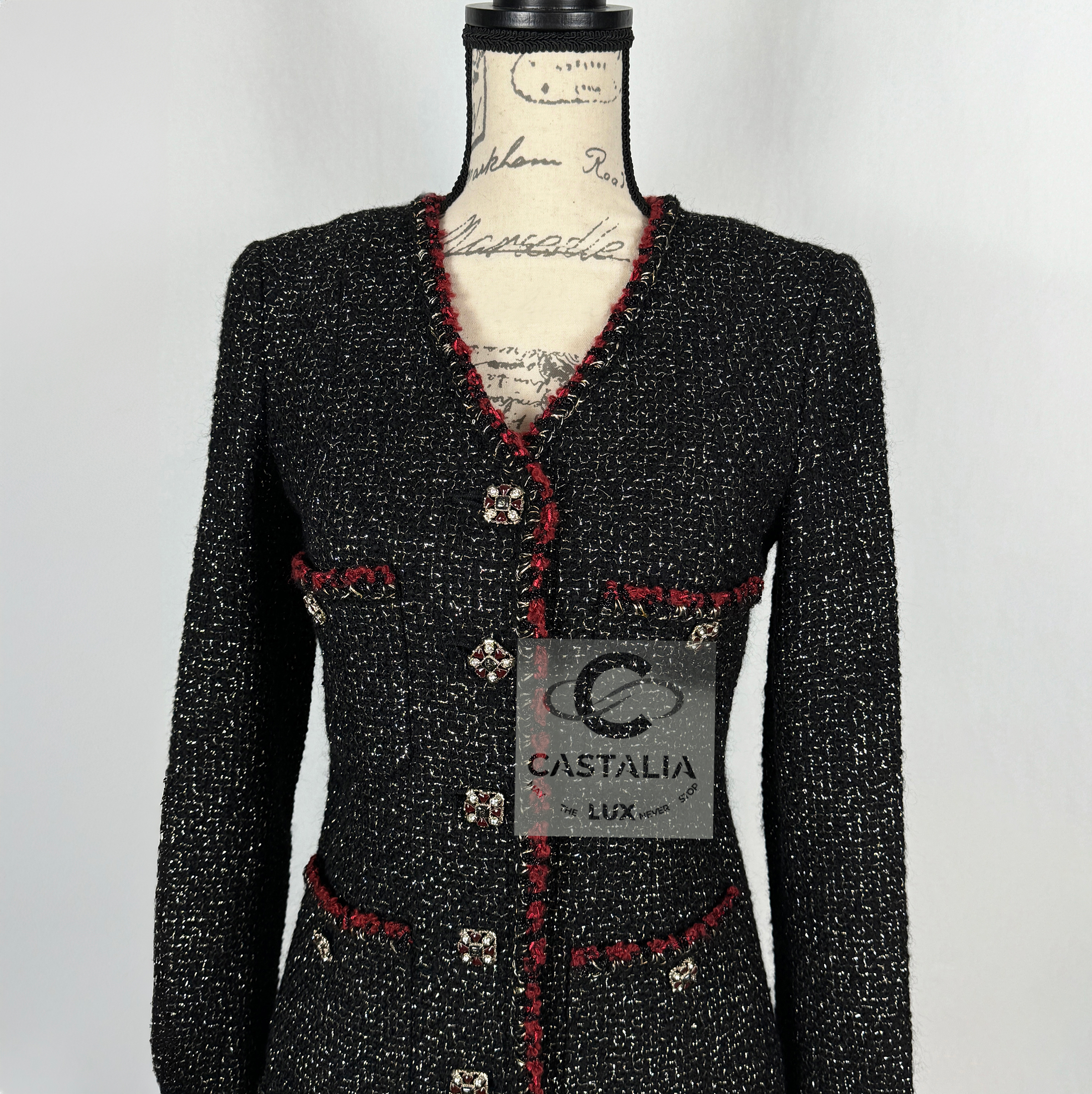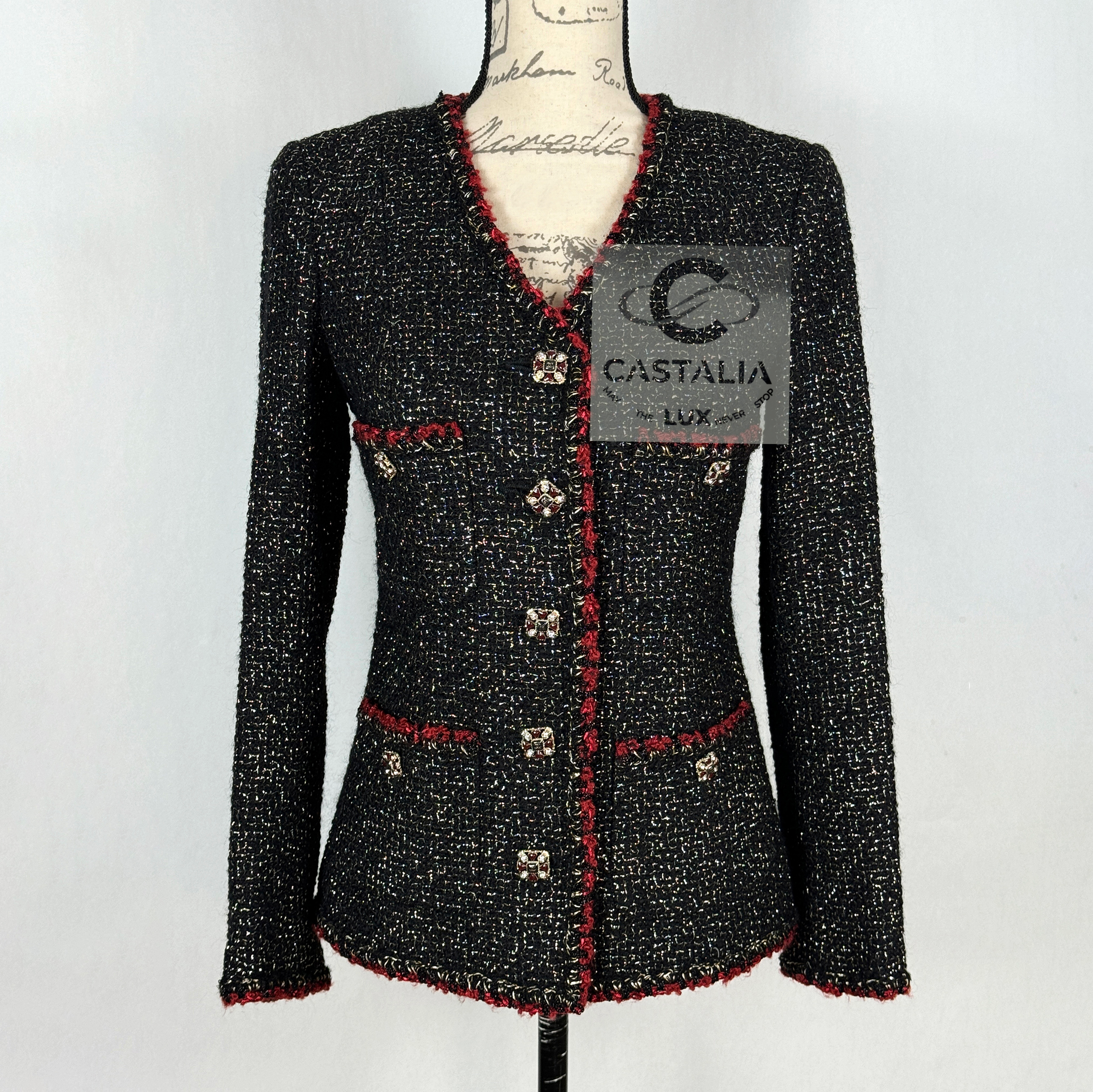 CHANEL Legendary Black Jewel Tweed Jacket ~ Runway of the Fall 2011 Collection — Karl Lagerfeld ~ A relic of Chanel Couture mythology, this jacket stands as one of the most coveted statements in the Maison’s history ~ The silhouette that crystallizes Chanel’s eternal grammar of elegance. More than a garment, it is a vision: a couture axis where fabric, jewel, and form converge into timeless resonance // Size mark 34 FR / Condition: never worn // — Embellished with the most beautiful jewel Gripoix buttons, each set with natural stones and strasses, glowing like miniature talismans — couture as alchemy — Four-pocket archetype, the most recognizable and immortal Chanel silhouette, a geometry of discipline and allure — Tailored from exquisite black Lesage tweed, interwoven with shimmering metallic threads that refract light like constellations caught in fabric — Finished with black silk lining and weighted chain link at the hem, a discreet code of Mastery and perfect fall