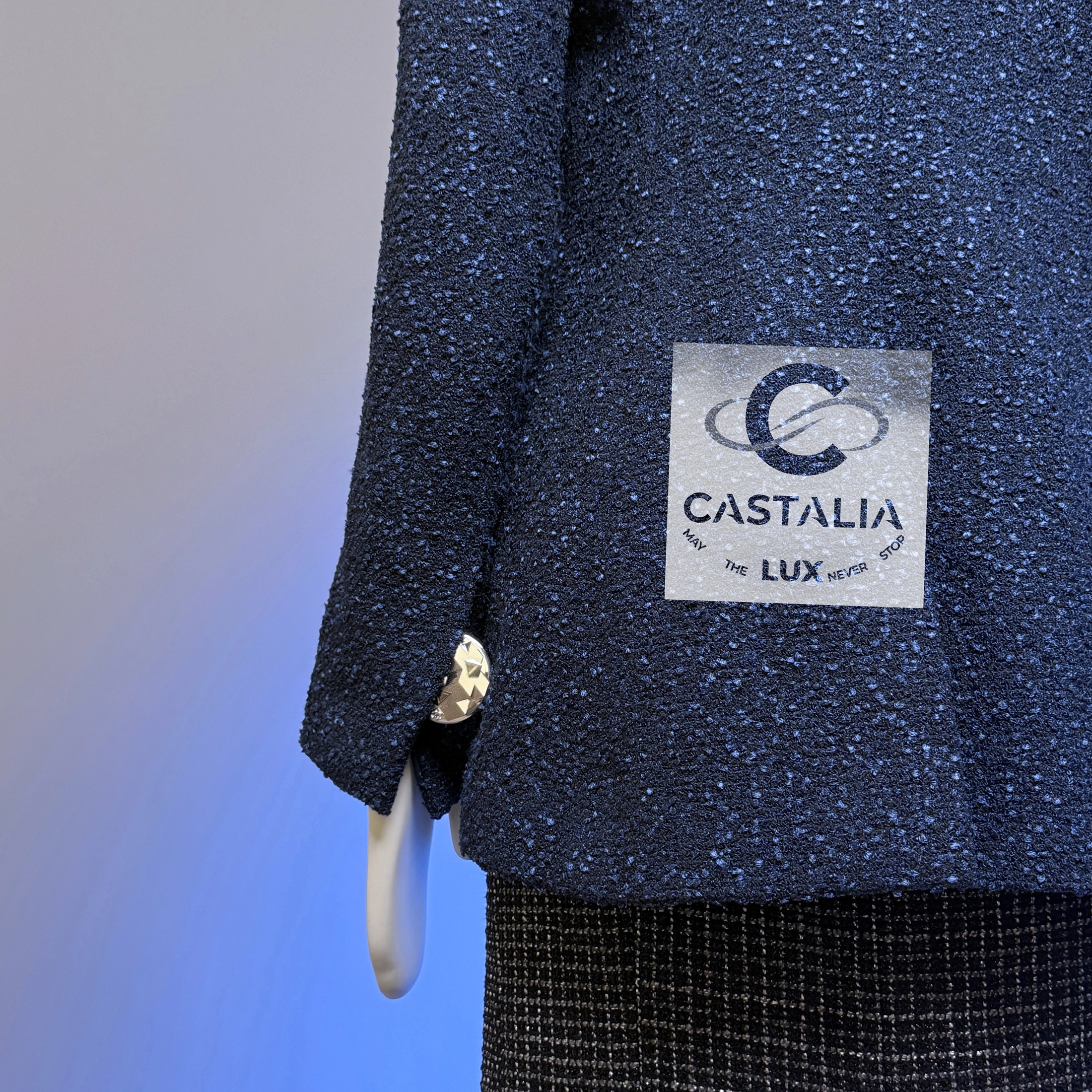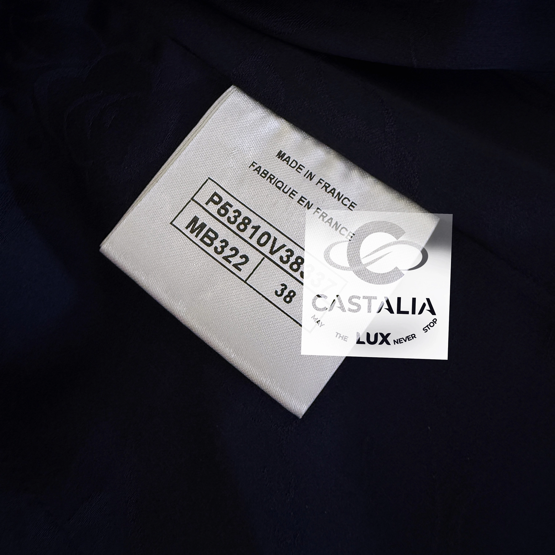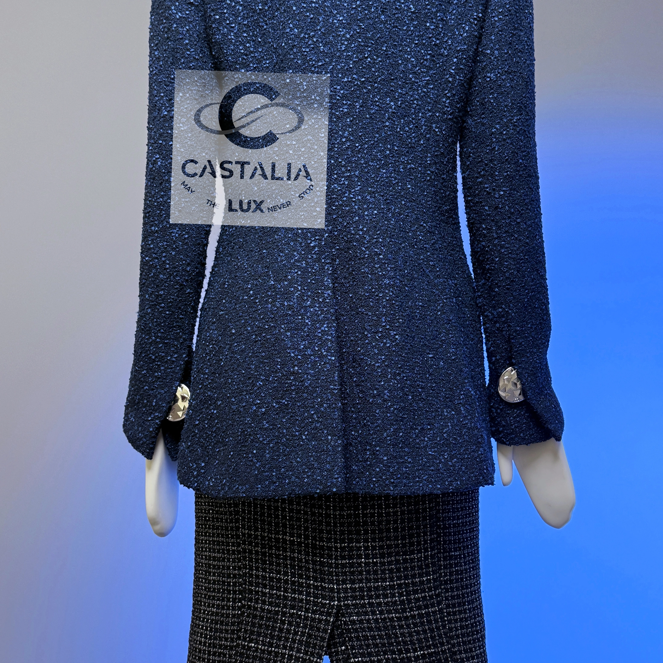 — At the cuffs, massive silver-tone CC buttons glint like aircraft beacons against a midnight tarmac
