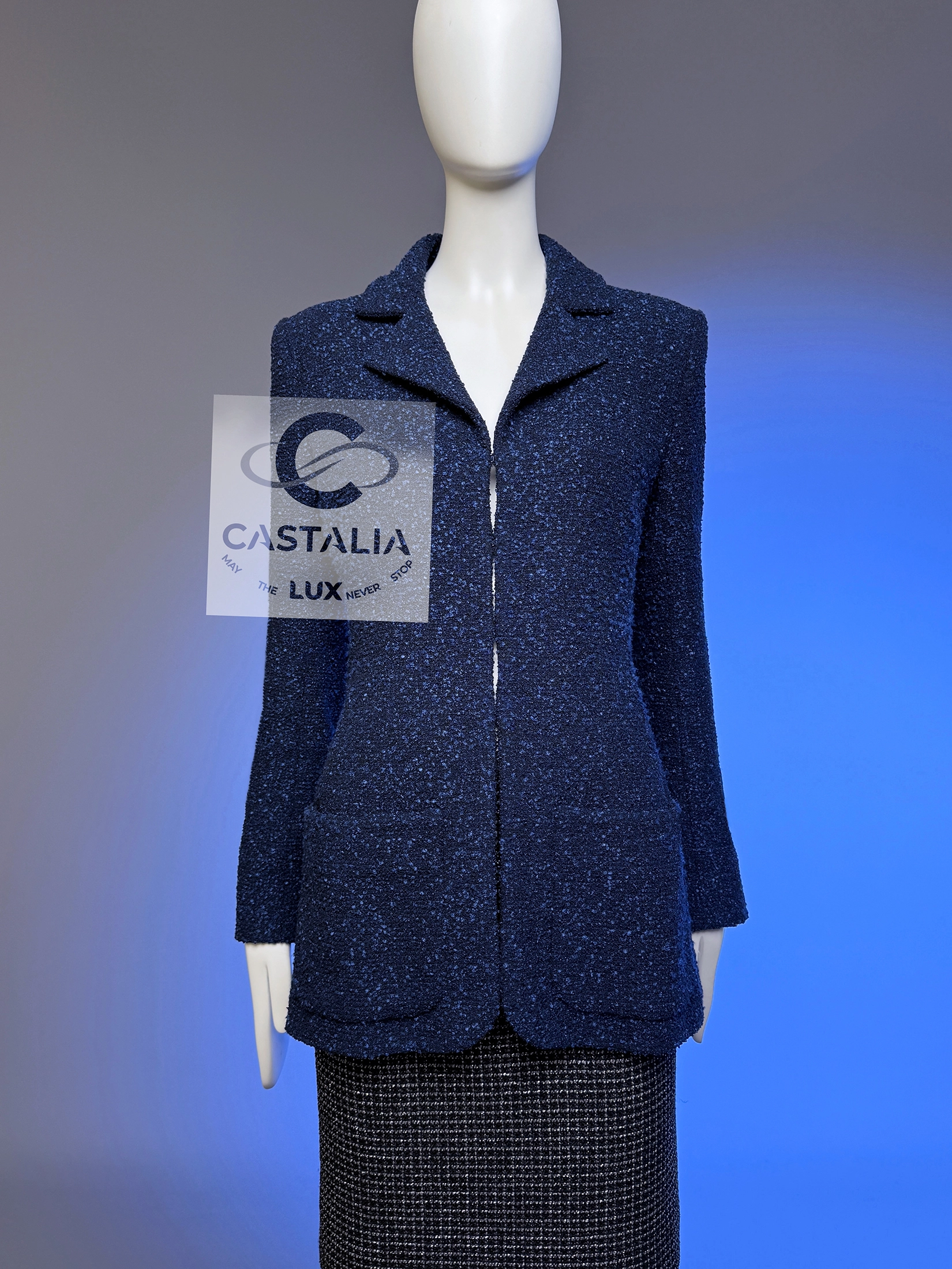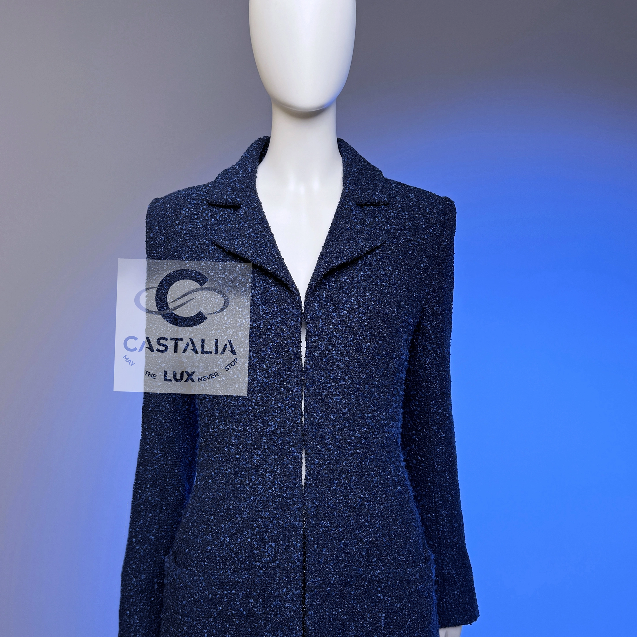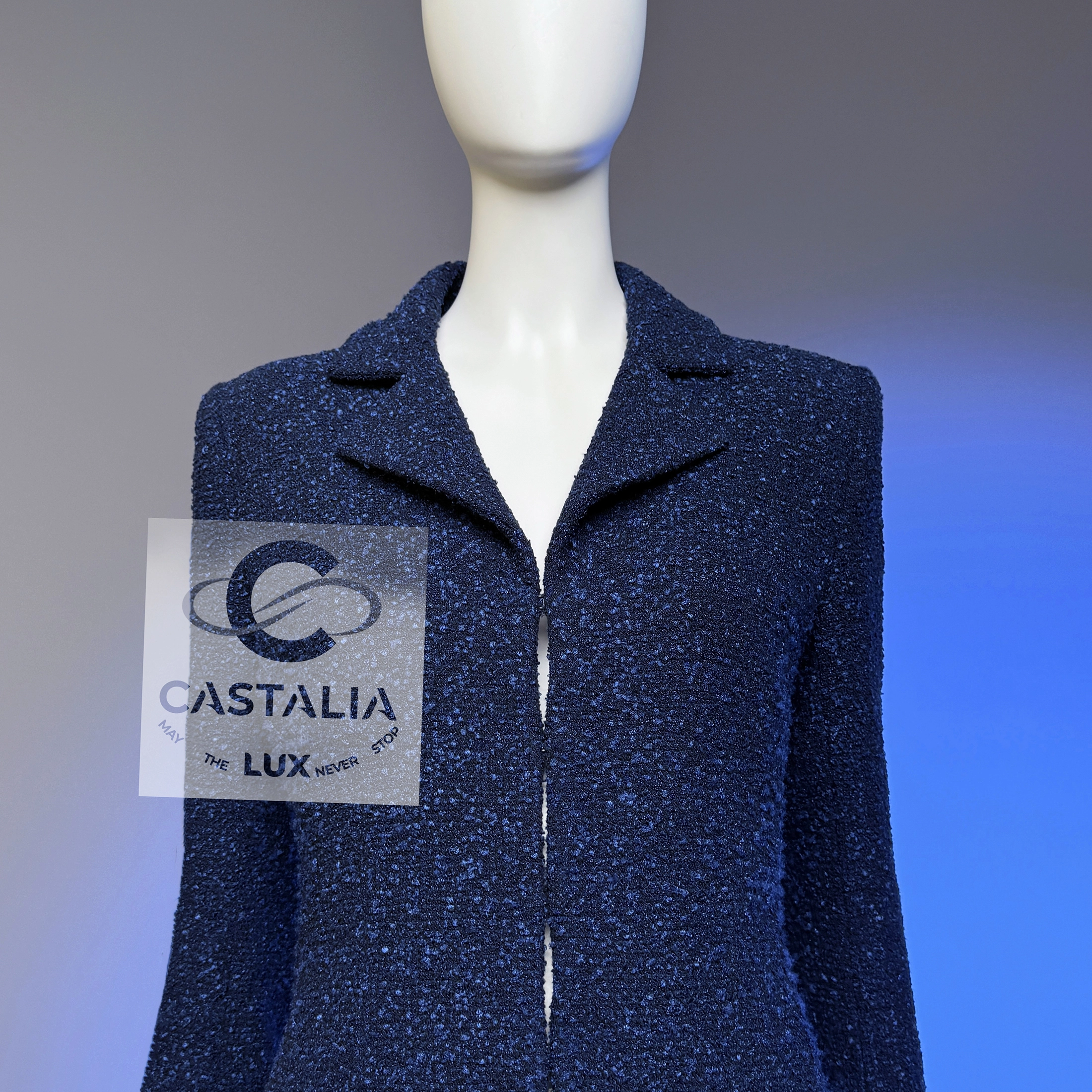 ~ Minimalist CHANEL Navy Lesage Tweed Jacket with CC buttons — Runway of AIRLINES Collection by Karl Lagerfeld ~ A study in precision and restraint, this navy tweed jacket from Karl Lagerfeld’s Airlines Collection distills the Chanel code to its purest form // Size mark 36 FR / Condition: never worn // — The silhouette — long-lined, clean, and quietly architectural — skims the frame with minimalistic grace — At the cuffs, massive silver-tone CC buttons glint like aircraft beacons against a midnight tarmac — Inside, a tonal silk lining rests against the skin like a whisper, a private luxury only the wearer knows