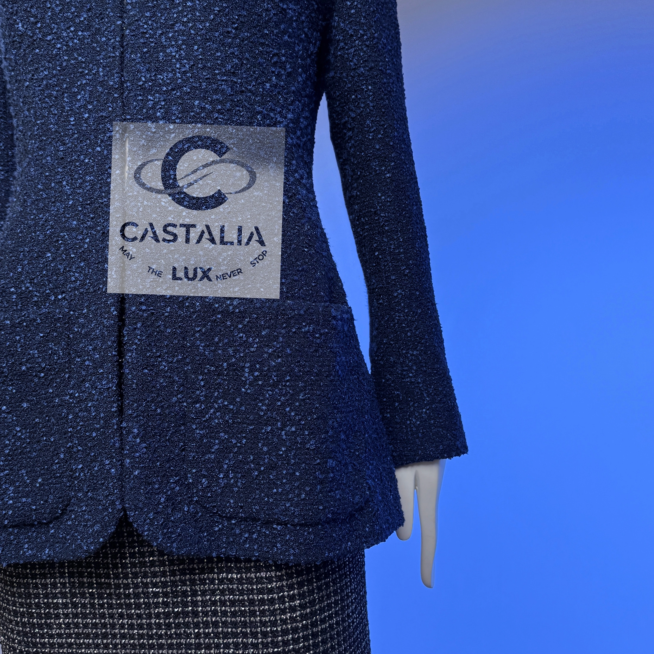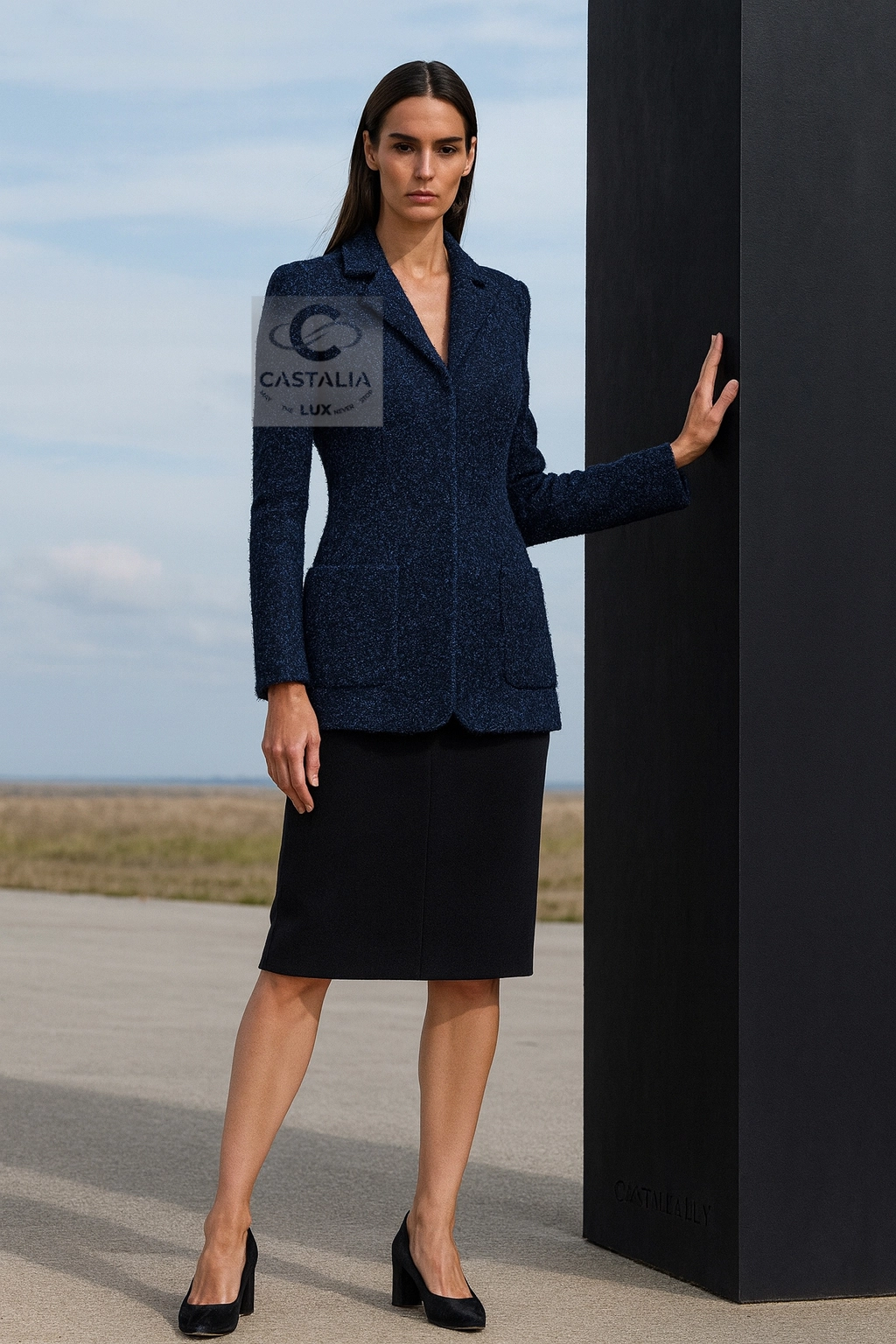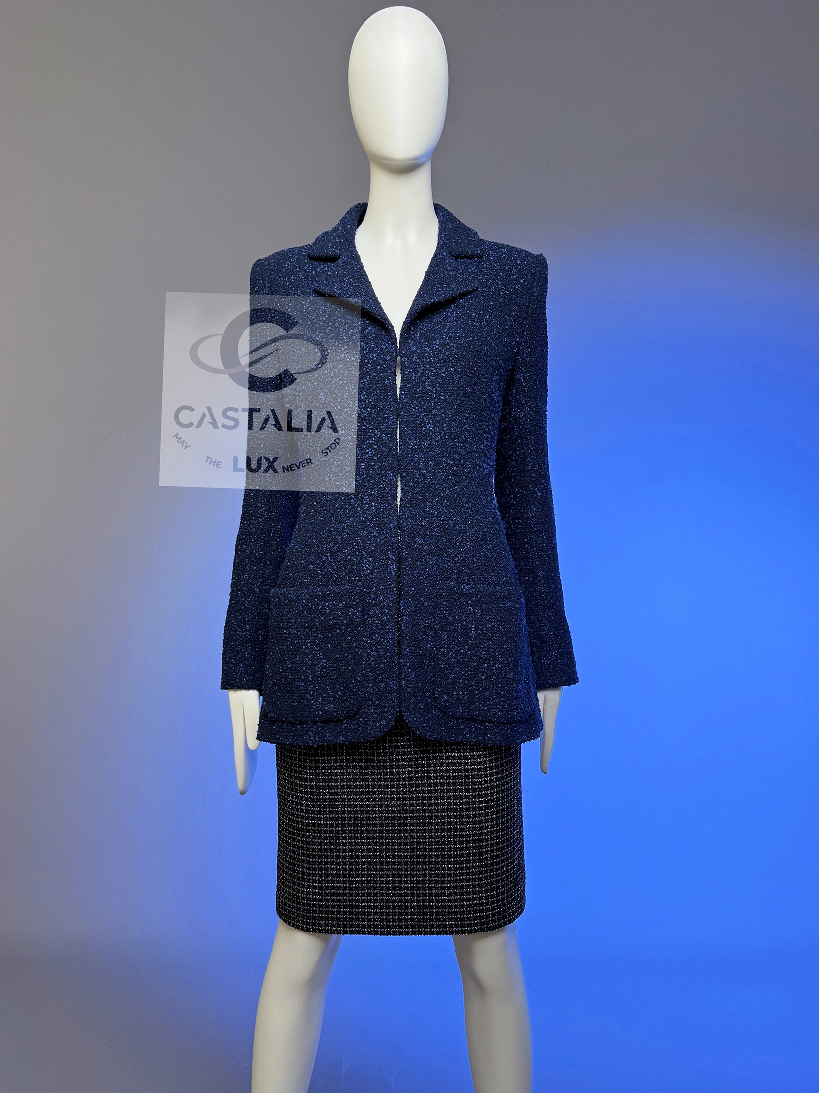 ~ Minimalist CHANEL Navy Lesage Tweed Jacket with CC buttons — Runway of AIRLINES Collection by Karl Lagerfeld ~ A study in precision and restraint, this navy tweed jacket from Karl Lagerfeld’s Airlines Collection distills the Chanel code to its purest form // Size mark 36 FR / Condition: never worn // — The silhouette — long-lined, clean, and quietly architectural — skims the frame with minimalistic grace — At the cuffs, massive silver-tone CC buttons glint like aircraft beacons against a midnight tarmac — Inside, a tonal silk lining rests against the skin like a whisper, a private luxury only the wearer knows