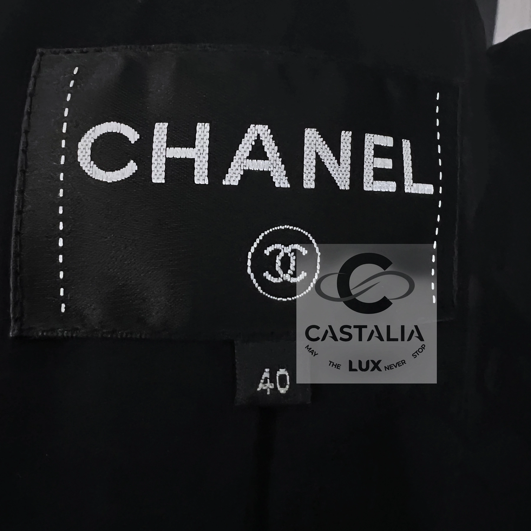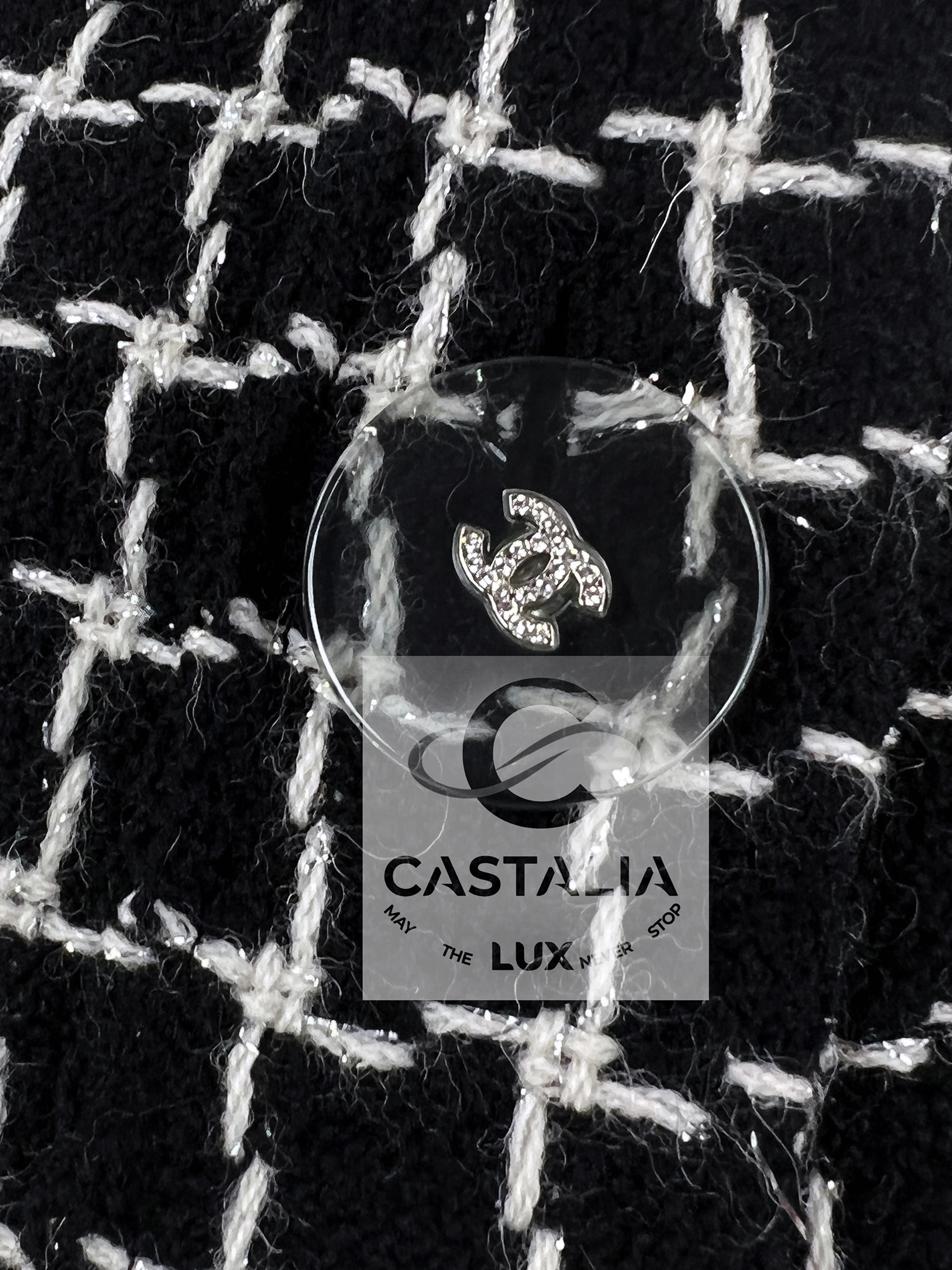 — translucent Gripoix jewel buttons crowned with the iconic CC, each closure gleams like an astral seal of Chanel mythology